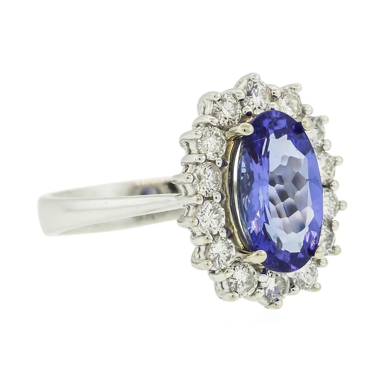 One electronically tested 14KT white gold ladies combination cast & assembled ring with a bright polish finish. Identified with markings of "14K". Condition is new. Containing: One prong set oval modified brilliant cut natural tanzanite, measuring 11.95 x 7.23 x 4.50mm, approximate weight of 2.77ct., clarity is eye clean, type I, medium light, very slightly grayish, violet color, (GIA V 4/3), cut is good. Fourteen prong set round brilliant cut diamonds, measuring 2.50 - 2.50 x 1.50mm (depth est.) approximate total weight of 14 Stones = 0.80ct. Clarity: SI-1. Color: I - J, Cut is Good. Colored gemstones are presumed to have been subjected to commonly used enhancement processes. All diamonds and colored gemstones are graded in the mounting, unless otherwise stated. Total Weight of Colored Stones 2.77ct. Total Weight of Diamonds 0.80ct. Total Weight of Ring 6.00 grams. GGL Appraised at $8,485.00.