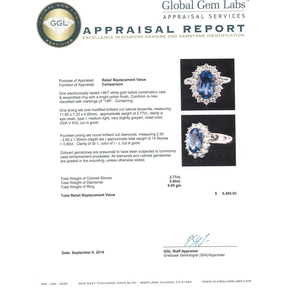 One electronically tested 14KT white gold ladies combination cast & assembled ring with a bright polish finish. Identified with markings of "14K". Condition is new. Containing: One prong set oval modified brilliant cut natural tanzanite, measuring 11.95 x 7.23 x 4.50mm, approximate weight of 2.77ct., clarity is eye clean, type I, medium light, very slightly grayish, violet color, (GIA V 4/3), cut is good. Fourteen prong set round brilliant cut diamonds, measuring 2.50 - 2.50 x 1.50mm (depth est.) approximate total weight of 14 Stones = 0.80ct. Clarity: SI-1. Color: I - J, Cut is Good. Colored gemstones are presumed to have been subjected to commonly used enhancement processes. All diamonds and colored gemstones are graded in the mounting, unless otherwise stated. Total Weight of Colored Stones 2.77ct. Total Weight of Diamonds 0.80ct. Total Weight of Ring 6.00 grams. GGL Appraised at $8,485.00.
