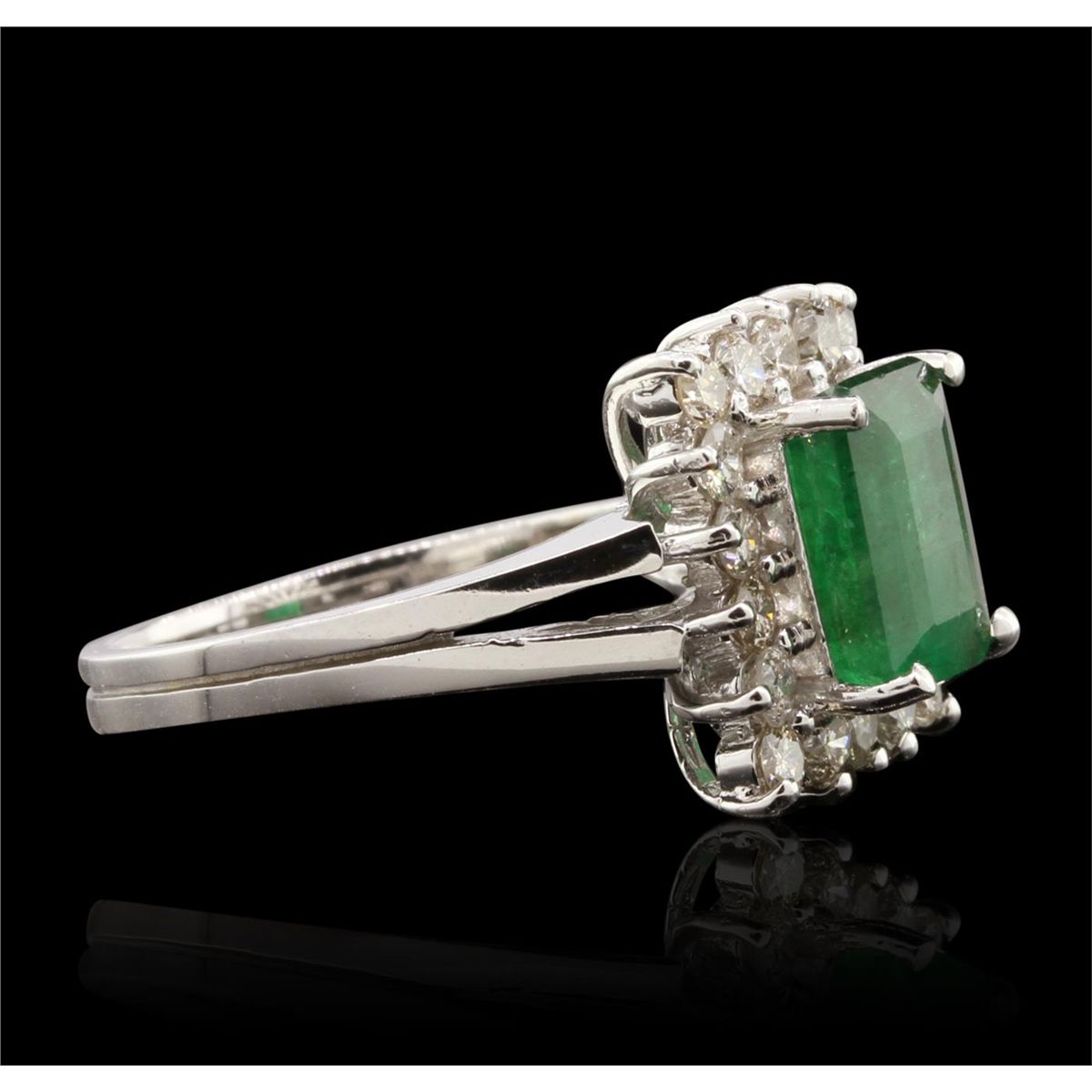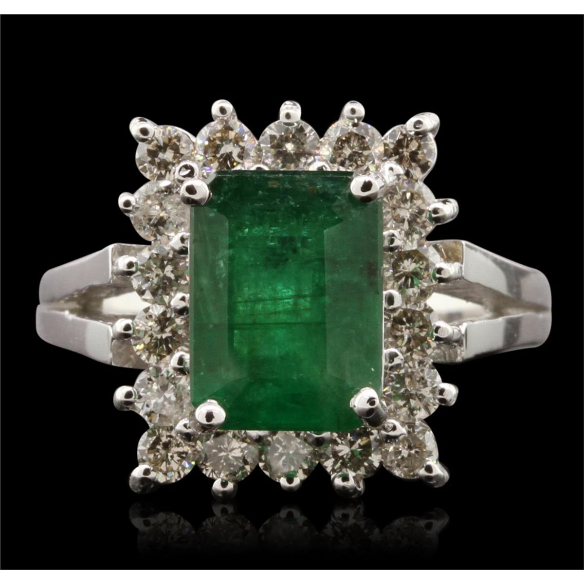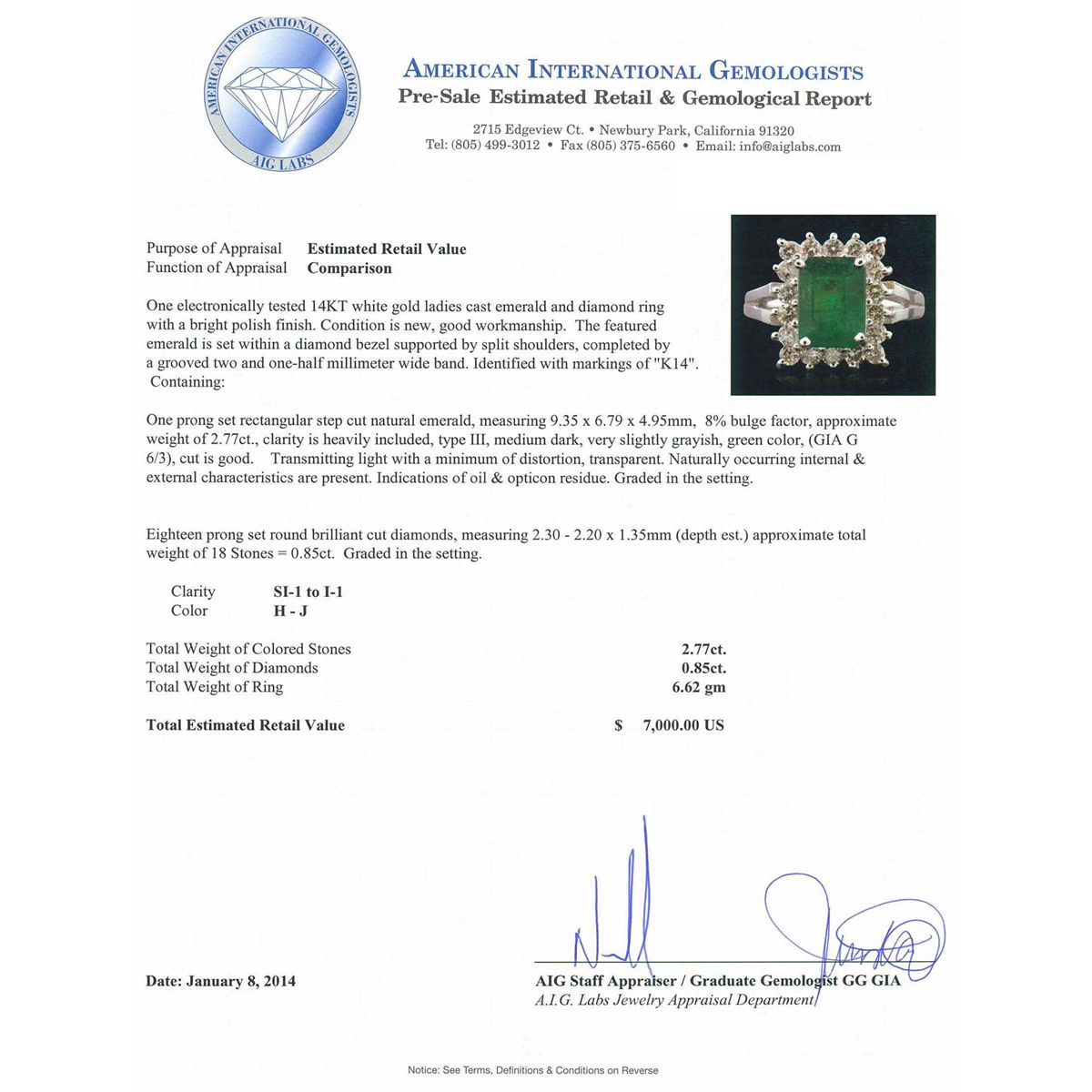 One electronically tested 14KT white gold ladies cast emerald and diamond ring with a bright polish finish. The featured emerald is set within a diamond bezel supported by split shoulders, completed by a grooved two and one-half millimeter wide band. Identified with markings of "K14". Condition is new, good workmanship. Containing: One prong set rectangular step cut natural emerald, measuring 9.35 x 6.79 x 4.95mm, 8%. bulge factor, approximate weight of 2.77ct., clarity is heavily included, type III, medium dark, very slightly grayish, green color, (GIA G 6/3), cut is good. Transmitting light with a minimum of distortion, transparent. Naturally occurring internal & external characteristics are present. Indications of oil & opticon residue. Graded in the setting. Eighteen prong set round brilliant cut diamonds, measuring 2.30 - 2.20 x 1.35mm (depth est.) approximate. Total Weight of 18 Stones = 0.85ct. Graded in the setting. Clarity: SI-1 to I-1 . Color: H - J. Total Weight of Colored Stones 2.77ct. Total Weight of Diamonds 0.85ct. AIG Appraised at $7,000.00.
