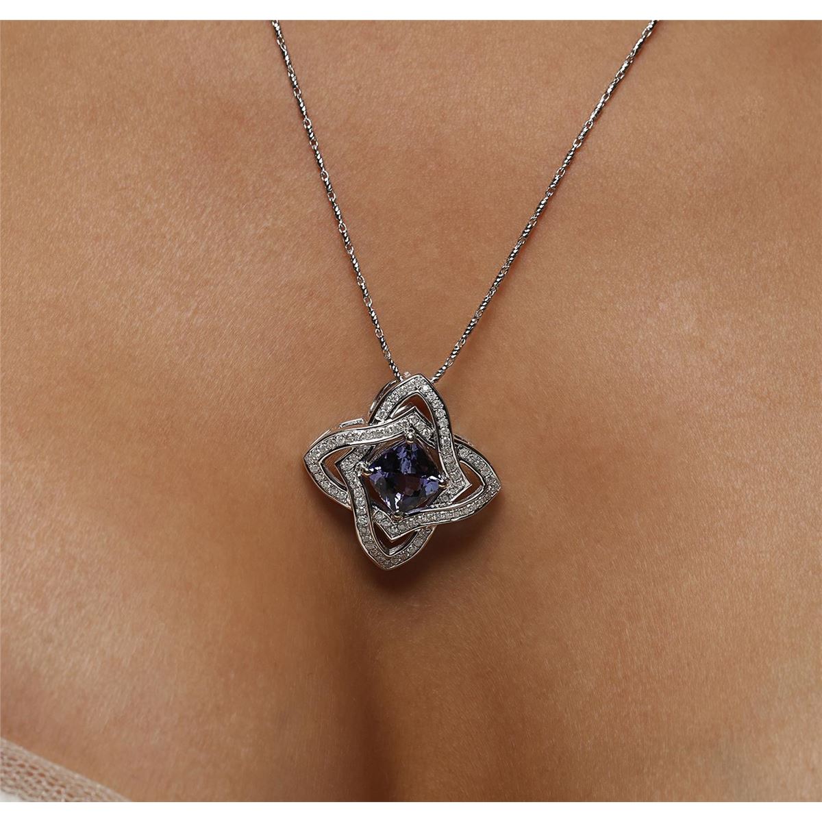 One electronically tested 14KT white gold ladies cast & assembled tanzanite and diamond pendant with chain. The pendant features a tanzanite set within intertwining diamond ribbons, completed by a hidden bail. The pendant is supported by an eighteen inch length 14KT white gold designer style chain, terminating in a lobster claw clasp. Bright polish finish. Trademark is Orianne. Identified with markings of "14K". Condition is new, good workmanship. Containing: One prong set square cushion brilliant cut natural tanzanite, measuring 8.10 x 8.00 x 5.15mm, 6% bulge factor, approximate weight of 2.78ct., clarity is eye clean, type I, medium dark, slightly grayish, bluish violet color, (GIA bV 6/2), cut is good. Transmitting light with no distortion, transparent. Graded in the setting. Tanzanite is a very rare gemstone that is only found in the country of Tanzania. Originally discovered in 1967. Tiffany & Company, named the stone Tanzanite. It is found in the Usumburu Mountains that border the Umba Valley of northern Tanzania. Tanzanite occurs in gray, brown, violet, blue, reddish-purple, & green. The gem is interesting because of its exceptional pleochroism. Rotated in different directions a tanzanite will exhibit multiple changes of color. Tanzanite has a low tolerance to ultrasonic cleaning, and should not be cleaned using this method. Eighty prong set round brilliant cut diamonds, measuring 1.20 - 1.10 x 0.69mm (depth est.) approximate total weight of 80 Stones = 0.54ct. Graded in the setting. Clarity: I-1 to I-3. Color: H - J. Total Weight of Colored Stones 2.78ct. Total Weight of Diamonds 0.54ct. Total Weight of Pendant With Chain 9.59 grams. AIG Appraised at $8,215.00.