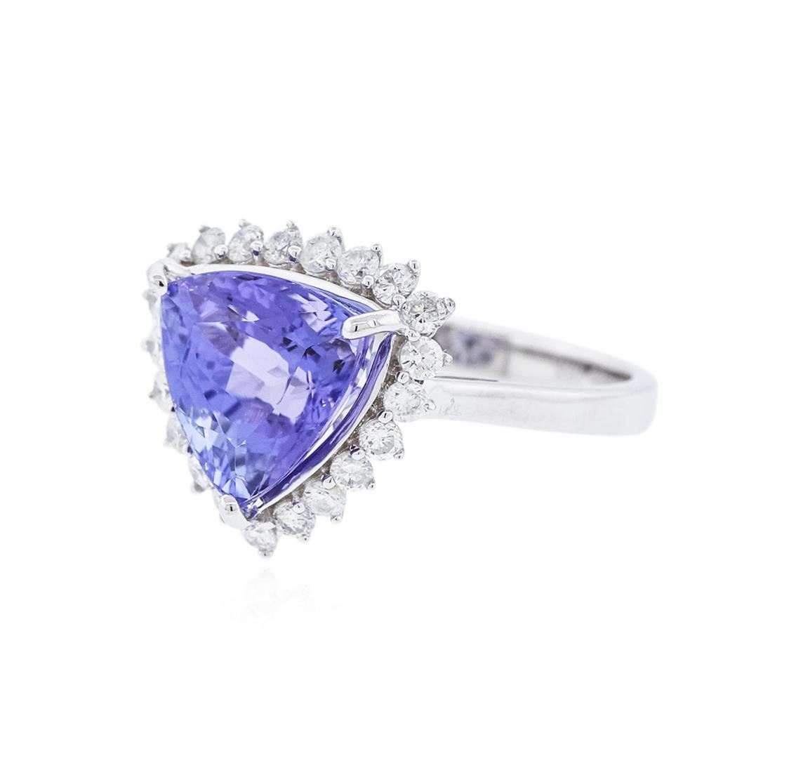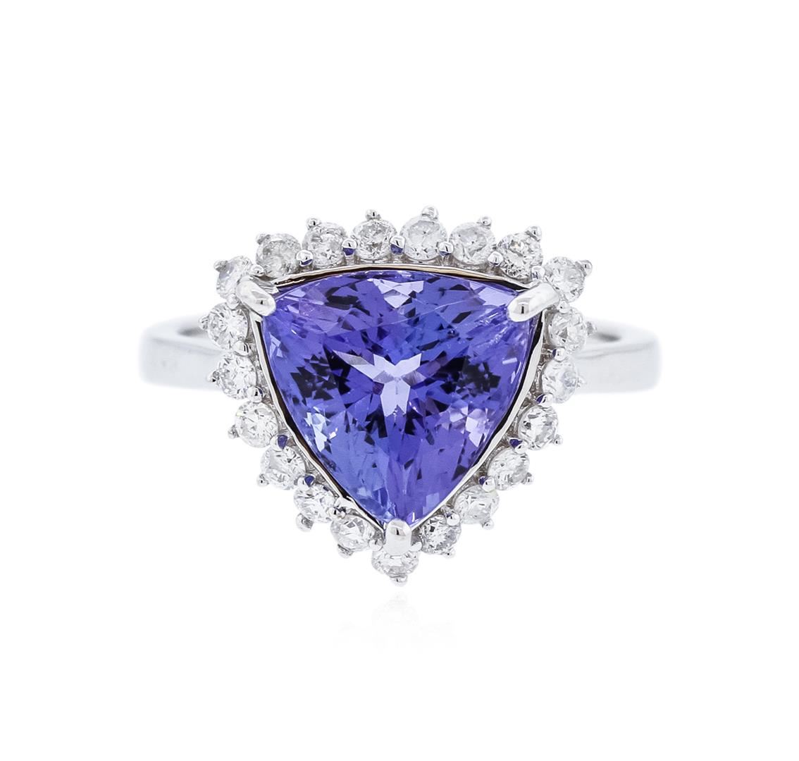 One electronically tested 14KT white gold ladies cast tanzanite and diamond ring with a cathedral shank with a bright polish finish. Trademark is Orianne. Identified with markings of "14K". Condition is new. Containing: One prong set triangle modified brilliant cut natural tanzanite, measuring 9.24 x 9.43 x 5.30mm, approximate weight of 2.78ct., clarity is eye clean, type I, medium light, moderately strong, violet color, (GIA V 4/4), cut is good. Twenty-One prong set round brilliant cut diamonds, measuring 1.30 - 1.30 x 0.78mm (depth est.) approximate total weight of 21 Stones = 0.17ct. Clarity: SI-2 to I-2. Color: I - J. All diamonds and colored gemstones are graded in the mounting, unless otherwise stated. Colored gemstones are presumed to have been subjected to commonly used enhancement processes. Total Weight of Colored Stones 2.78ct. Total Weight of Diamonds 0.17ct. Total Weight of Ring 3.40 grams. GGL Appraised at $3,120.00.