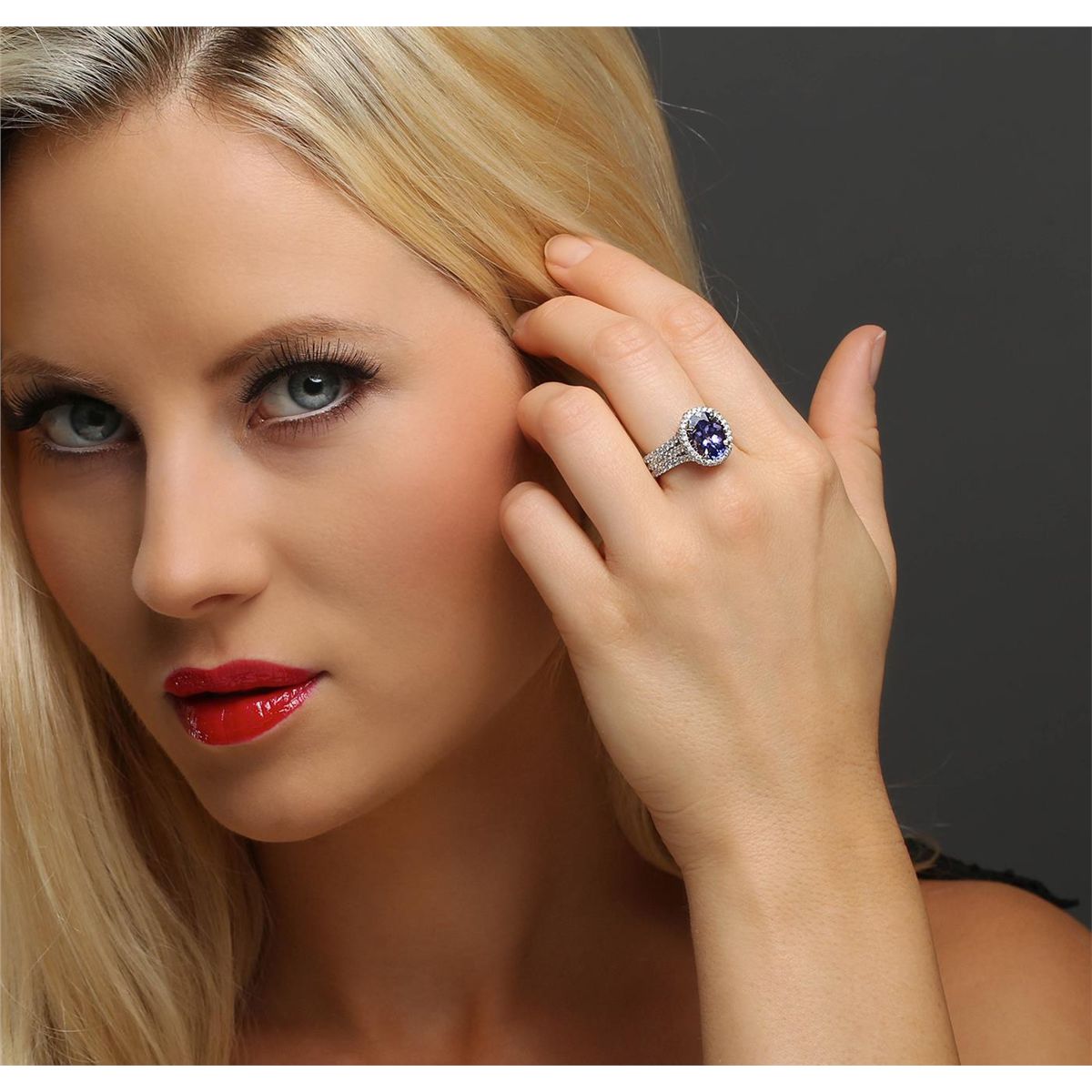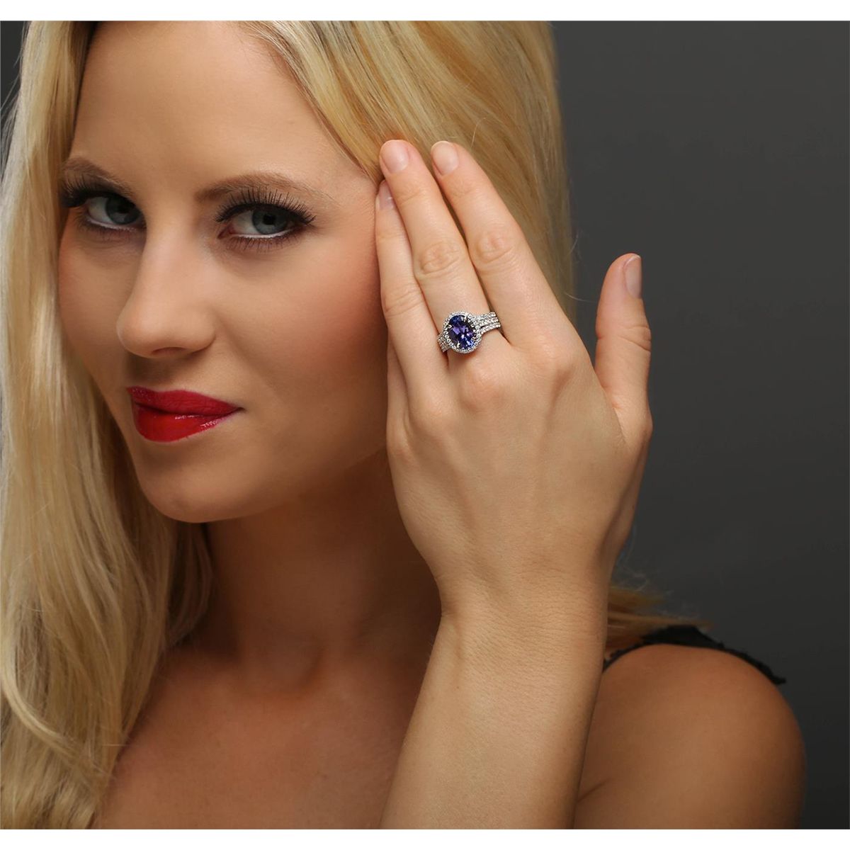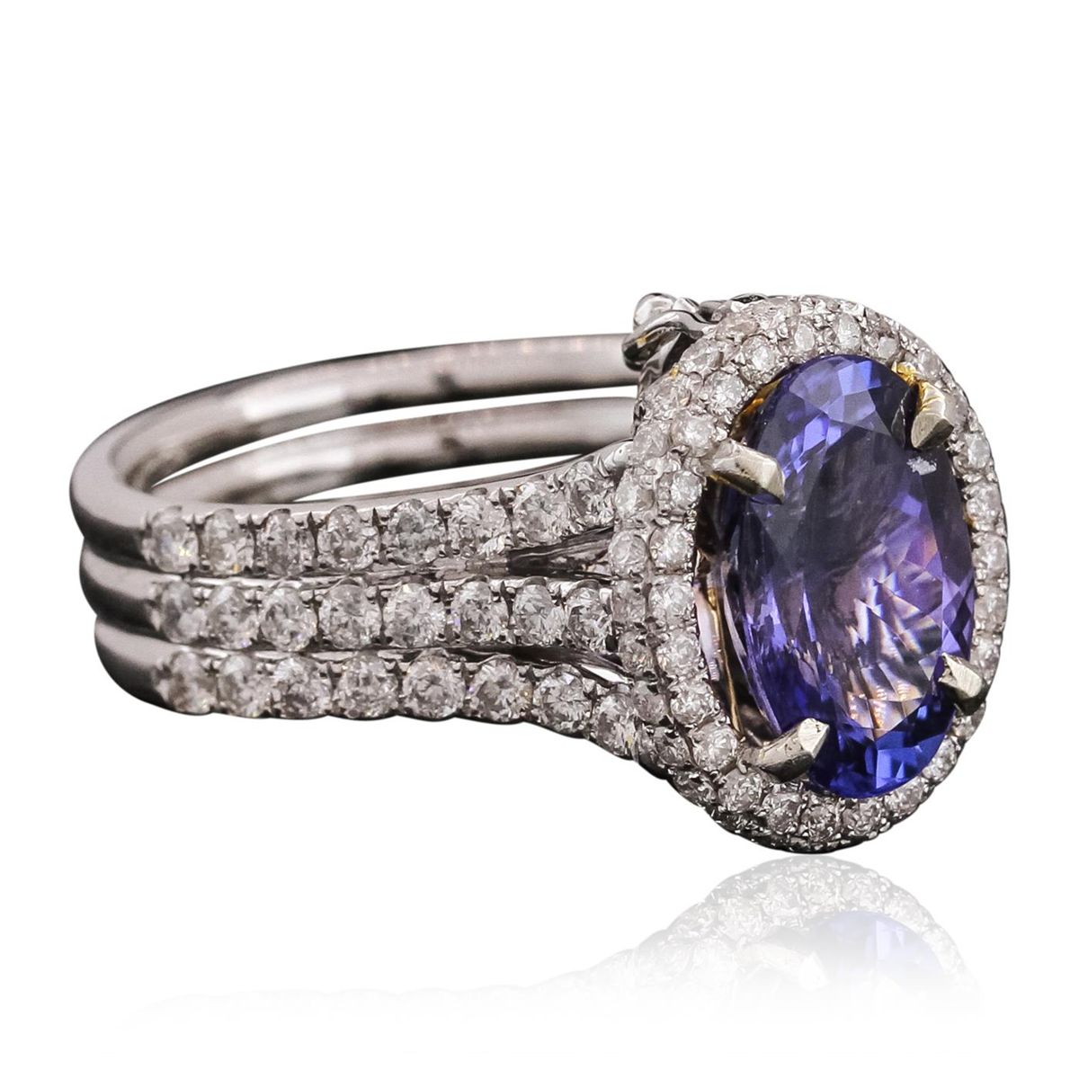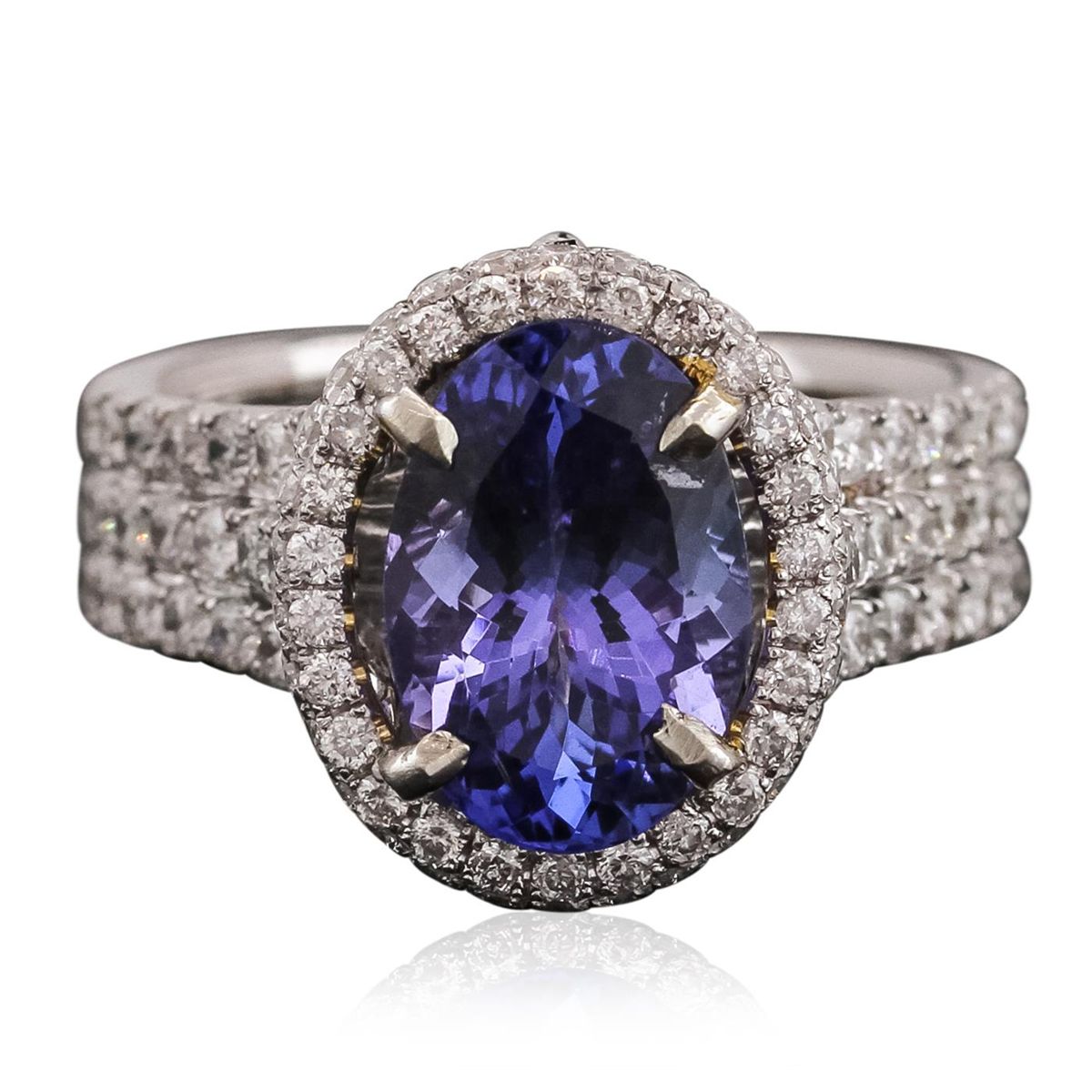 One electronically tested 14KT white gold ladies combination cast & assembled tanzanite and diamond ring with a split shank with a bright polish finish. Identified with markings of "14K". Condition is new. Containing: One prong set oval modified brilliant cut natural tanzanite, measuring 11.39 x 7.95 x 4.45mm, approximate weight of 2.79ct., clarity is eye clean, type I, medium, moderately strong, violet color, (GIA V 5/4), cut is very good. One Hundred Twenty-Two prong set round brilliant cut diamonds, measuring 1.70 - 1.30 x 0.90mm (depth est.) approximate total weight of 122 Stones = 1.50ct. Clarity: I-1 to I-2. Color: I - J, Cut is Good. Colored gemstones are presumed to have been subjected to commonly used enhancement processes. All diamonds and colored gemstones are graded in the mounting, unless otherwise stated total weight of Colored Stones 2.79ct. Total Weight of Diamonds 1.50ct. Total Weight of Ring 9.10 grams. GGL Appraised at $9,065.00.