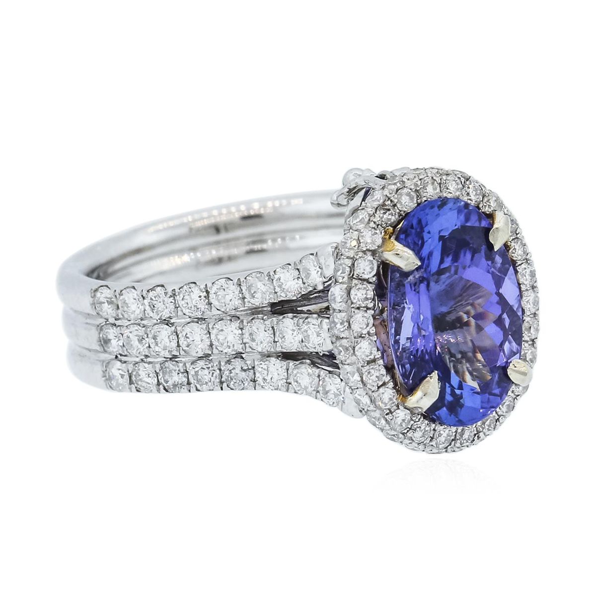 One electronically tested 14KT white gold ladies combination cast & assembled tanzanite and diamond ring with a split shank with a bright polish finish. Identified with markings of "14K". Condition is new. Containing: One prong set oval modified brilliant cut natural tanzanite, measuring 11.39 x 7.95 x 4.45mm, approximate weight of 2.79ct., clarity is eye clean, type I, medium, moderately strong, violet color, (GIA V 5/4), cut is very good. One Hundred Twenty-Two prong set round brilliant cut diamonds, measuring 1.70 - 1.30 x 0.90mm (depth est.) approximate total weight of 122 Stones = 1.50ct. Clarity: I-1 to I-2. Color: I - J, Cut is Good. Colored gemstones are presumed to have been subjected to commonly used enhancement processes. All diamonds and colored gemstones are graded in the mounting, unless otherwise stated total weight of Colored Stones 2.79ct. Total Weight of Diamonds 1.50ct. Total Weight of Ring 9.10 grams. GGL Appraised at $9,065.00.