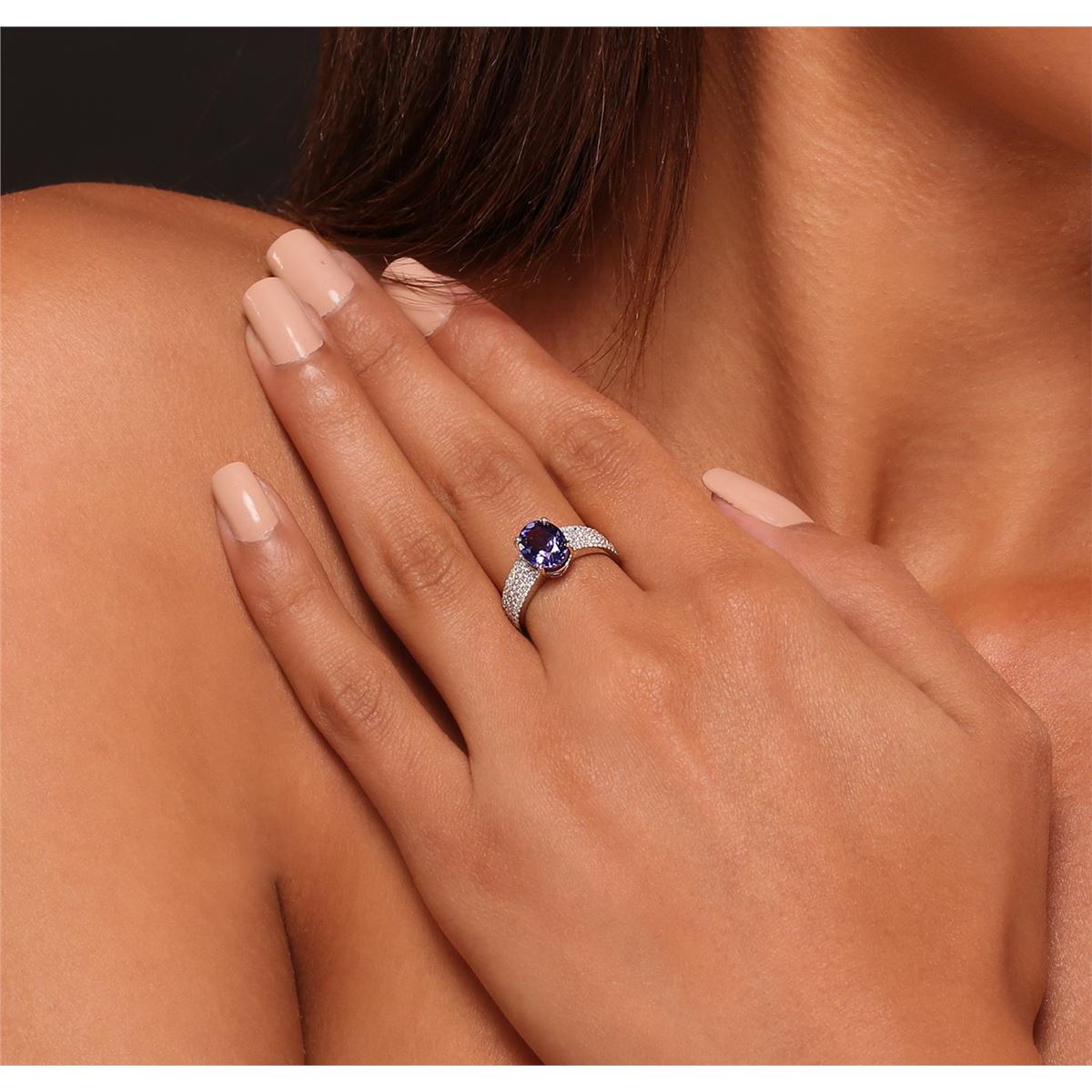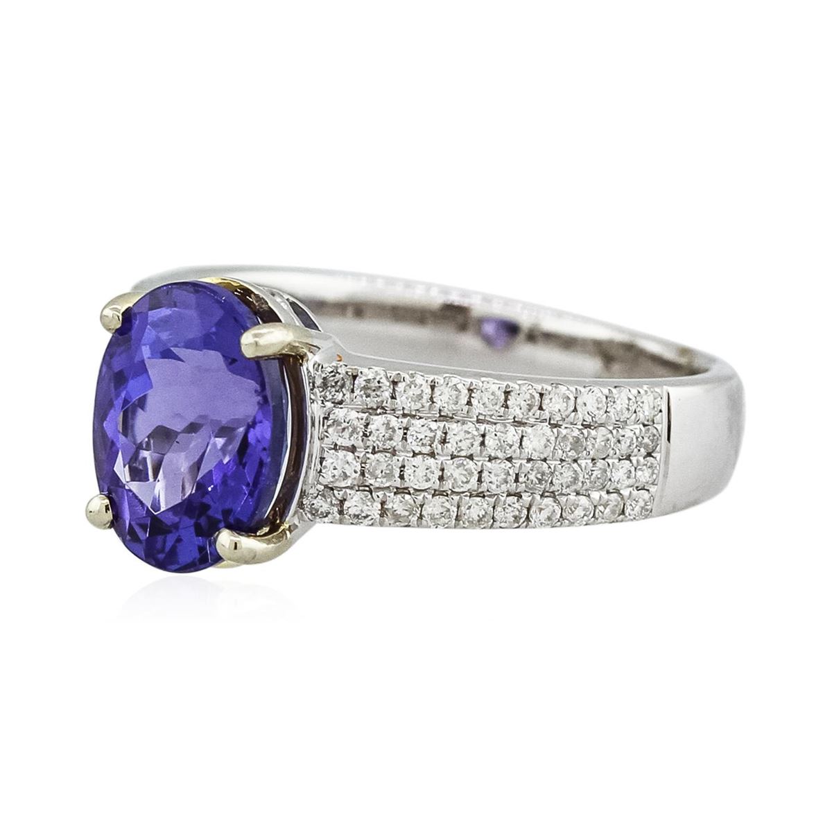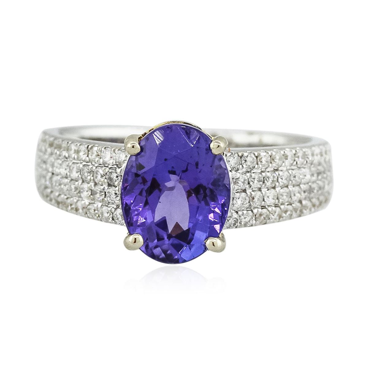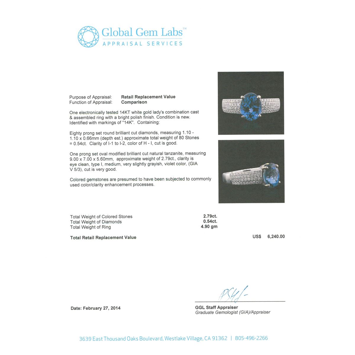 One electronically tested 14KT white gold Ladies combination cast & assembled ring with a bright polish finish. Condition is new. Identified with markings of "14K". Containing: Eighty prong set round brilliant cut diamonds, measuring 1.10 - 1.10 x 0.66mm (depth est.) approximate. Total Weight of 80 Stones = 0.54ct. Clarity: I-1 to I-2. Color: H - I, Cut is Good. One prong set oval modified brilliant cut natural tanzanite, measuring 9.00 x 7.00 x 5.60mm, approximate weight of 2.79ct., clarity is eye clean, type I, medium, very slightly grayish, violet color, (GIA V 5/3), cut is very good. Colored gemstones are presumed to have been subjected to commonly used color/clarity enhancement processes. Total Weight of Colored Stones 2.79ct. Total Weight of Diamonds 0.54ct. Total Weight of Ring 4.90 grams. GGL Appraised at $6,240.00.