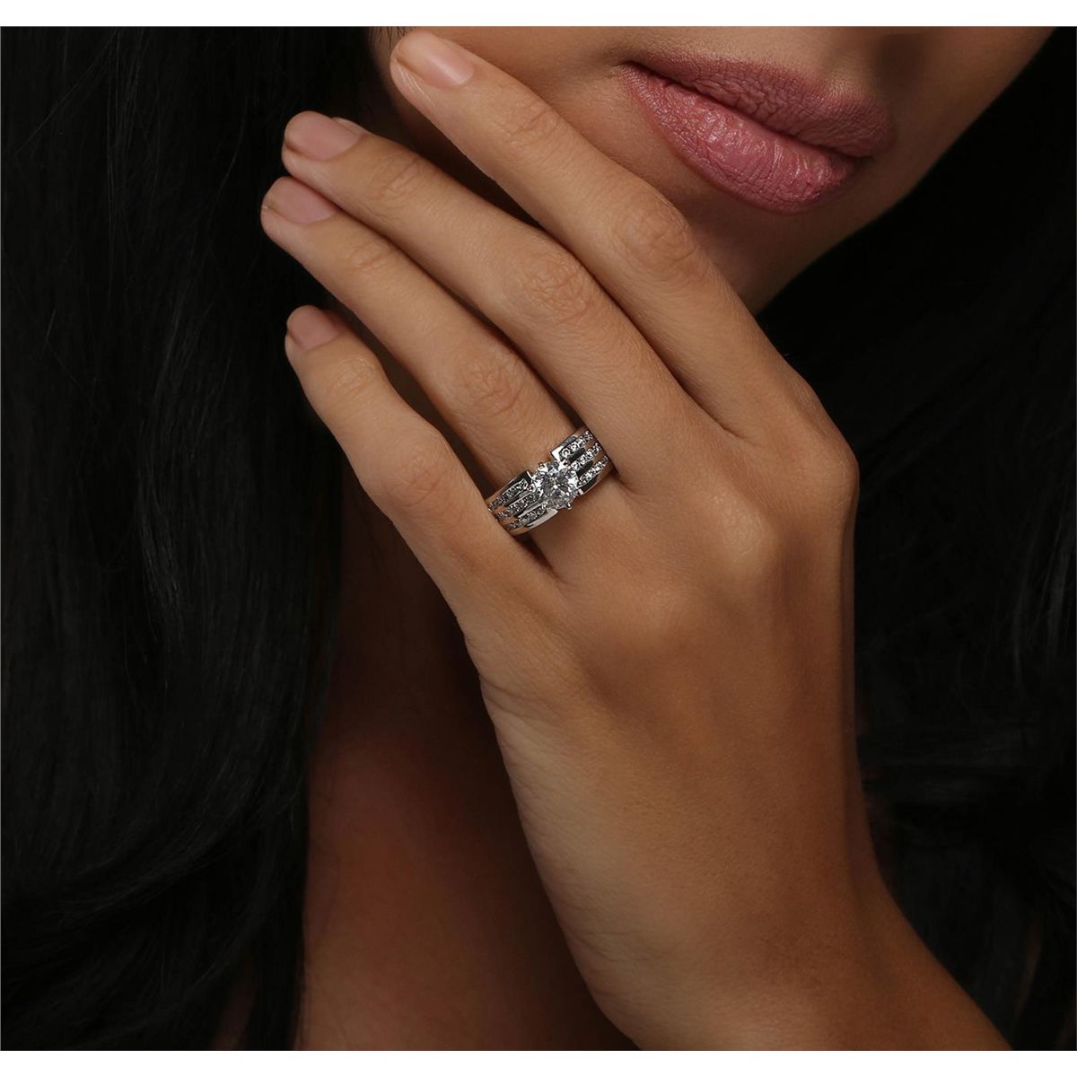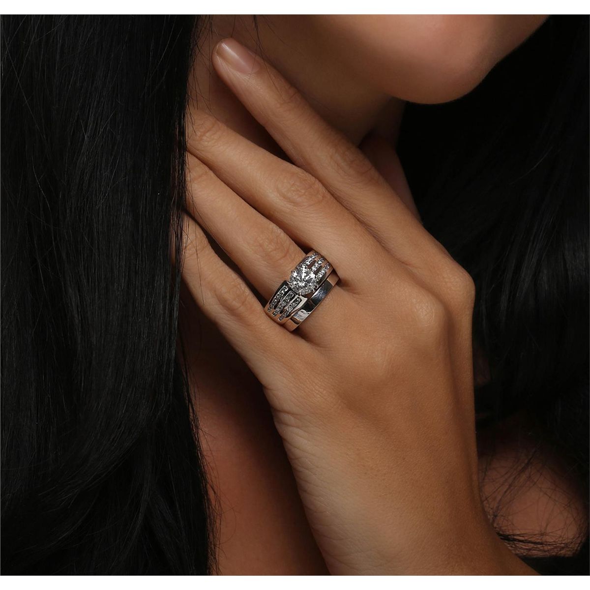 One electronically tested 14KT white gold ladies cast & assembled diamond wedding set. The wedding set includes a diamond engagement ring and a diamond wedding band. The engagement ring features a diamond supported by diamond set shoulders, completed by a four millimeter wide band. The set is completed by a matching diamond wedding band with a two and one-half millimeter wide band. Identified with markings of "14K". Condition is good. Containing: One prong set round brilliant cut diamond, measuring 7.25 - 7.23 x 4.45mm (depth est.) approximate weight of 1.52ct. Graded in the setting. Clarity: I-1 . Color: I. Depth 61.5%. Table 58.7%. Seven channel set round brilliant cut diamonds, measuring 2.50 - 2.40 x 1.47mm (depth est.) approximate total weight of 7 Stones = 0.47ct. Graded in the setting. Clarity: I-1 to I-2 . Color: H - J Thirty-Six channel set round brilliant cut diamonds, measuring 1.80 - 1.70 x 1.05mm (depth est.) approximate total weight of 36 Stones = 0.80ct. Graded in the setting. Clarity: SI-1 to I-1. Color: G - I. Total Weight of Diamonds 2.79ct. Total Weight of Wedding Set 14.70 grams. AIG Appraised at $31,095.00.