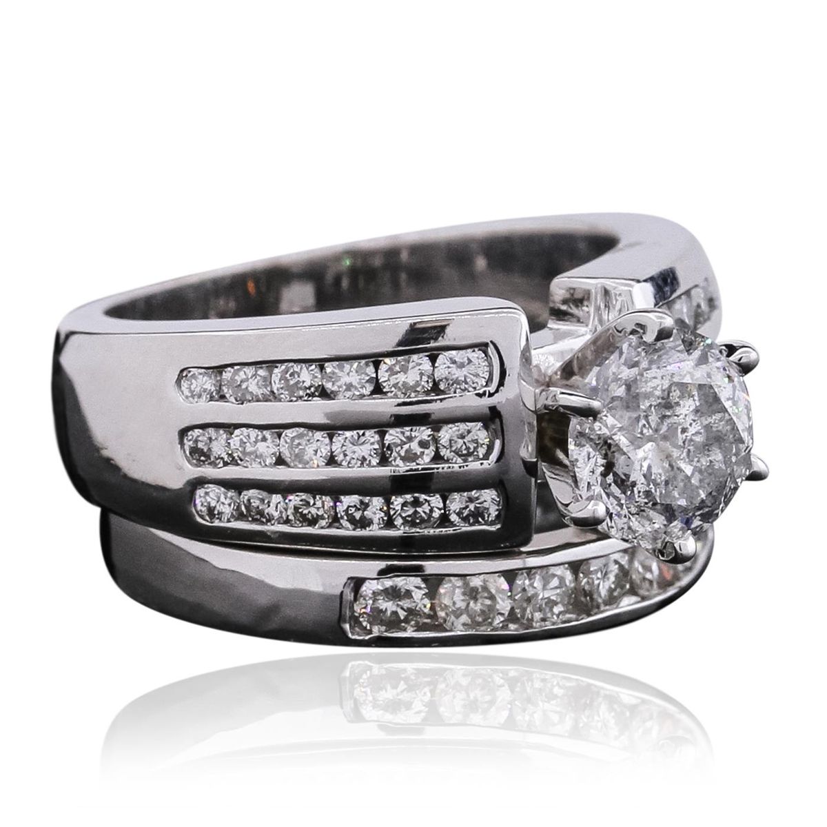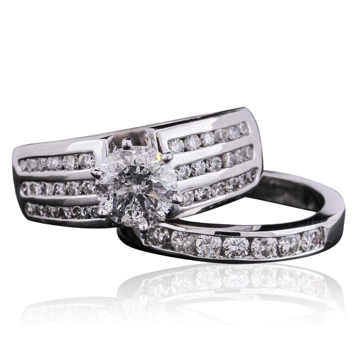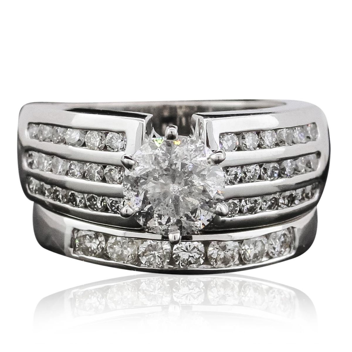 One electronically tested 14KT white gold ladies cast & assembled diamond wedding set. The wedding set includes a diamond engagement ring and a diamond wedding band. The engagement ring features a diamond supported by diamond set shoulders, completed by a four millimeter wide band. The set is completed by a matching diamond wedding band with a two and one-half millimeter wide band. Identified with markings of "14K". Condition is good. Containing: One prong set round brilliant cut diamond, measuring 7.25 - 7.23 x 4.45mm (depth est.) approximate weight of 1.52ct. Graded in the setting. Clarity: I-1 . Color: I. Depth 61.5%. Table 58.7%. Seven channel set round brilliant cut diamonds, measuring 2.50 - 2.40 x 1.47mm (depth est.) approximate total weight of 7 Stones = 0.47ct. Graded in the setting. Clarity: I-1 to I-2 . Color: H - J Thirty-Six channel set round brilliant cut diamonds, measuring 1.80 - 1.70 x 1.05mm (depth est.) approximate total weight of 36 Stones = 0.80ct. Graded in the setting. Clarity: SI-1 to I-1. Color: G - I. Total Weight of Diamonds 2.79ct. Total Weight of Wedding Set 14.70 grams. AIG Appraised at $31,095.00.
