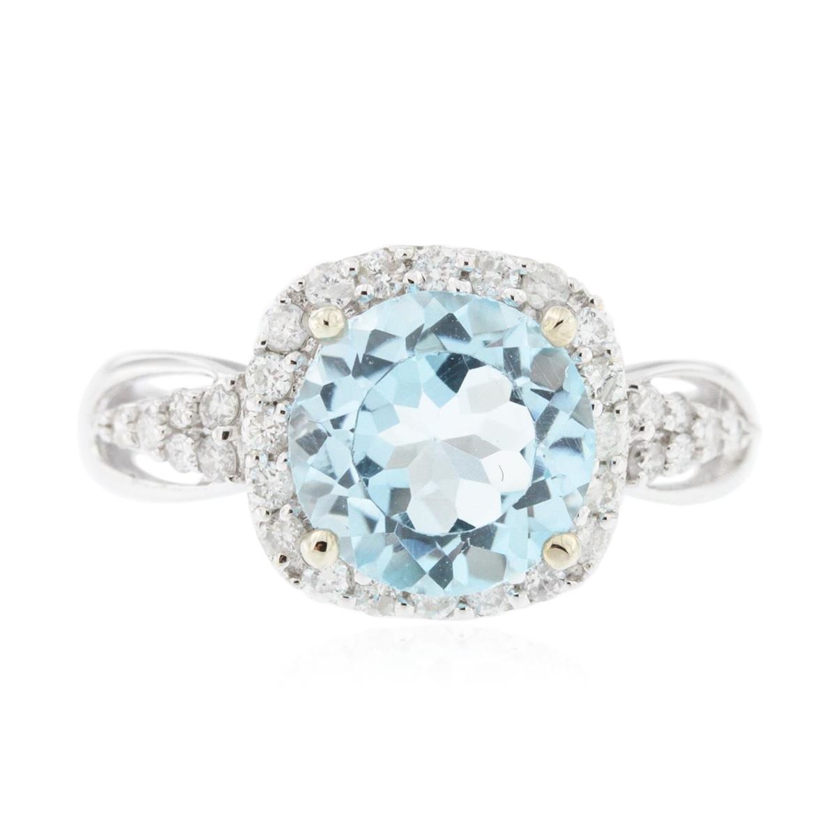 14KT white gold 2.80ct Blue Topaz and Diamond Ring A6561. One electronically tested 14KT white gold ladies cast blue topaz and diamond ring with a bright polish finish. The featured blue topaz is set within a diamond bezel supported by diamond set shoulders, completed by a one millimeter wide band. Trademark is Orianne. Identified with markings of "14K". Condition is new, good workmanship. Containing: One prong set round mixed cut natural blue topaz, measuring 8.70 - 8.60 x 5.00 mm, approximate weight of 2.80ct., clarity is eye clean, type I, medium, moderately strong, very slightly greenish blue color, (GIA vslgB 5/4), cut is good. Transmitting light with no distortion, transparent. Graded in the setting.A deposit of a thin layer has been applied to the topaz to produce the intense color effect. The process utilizes a very high temperature treatment, diffusion of ions into the topaz, plus in some cases neutron bombardment has been used to create the color center. Diffusion processes causes the added ions to become part of the crystal surface with no distinct boundary. Do not put a gem treated in this manner into an ultrasonic cleaner.Thirty-Two prong set round brilliant cut diamonds, measuring 1.50 - 1.40 x 0.87mm (depth est.) approximate. Total Weight of 32 Stones = 0.39ct. Graded in the setting. Clarity: SI-2 to I-2. Color: G - I. Total Weight of Colored Stones 2.80ct. Total Weight of Diamonds 0.39ct. AIG Appraised at $1,775.00.