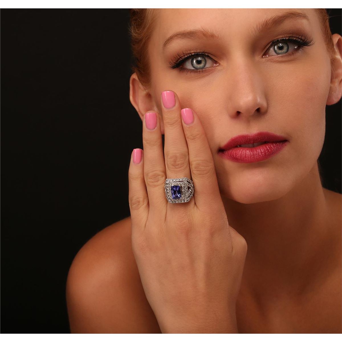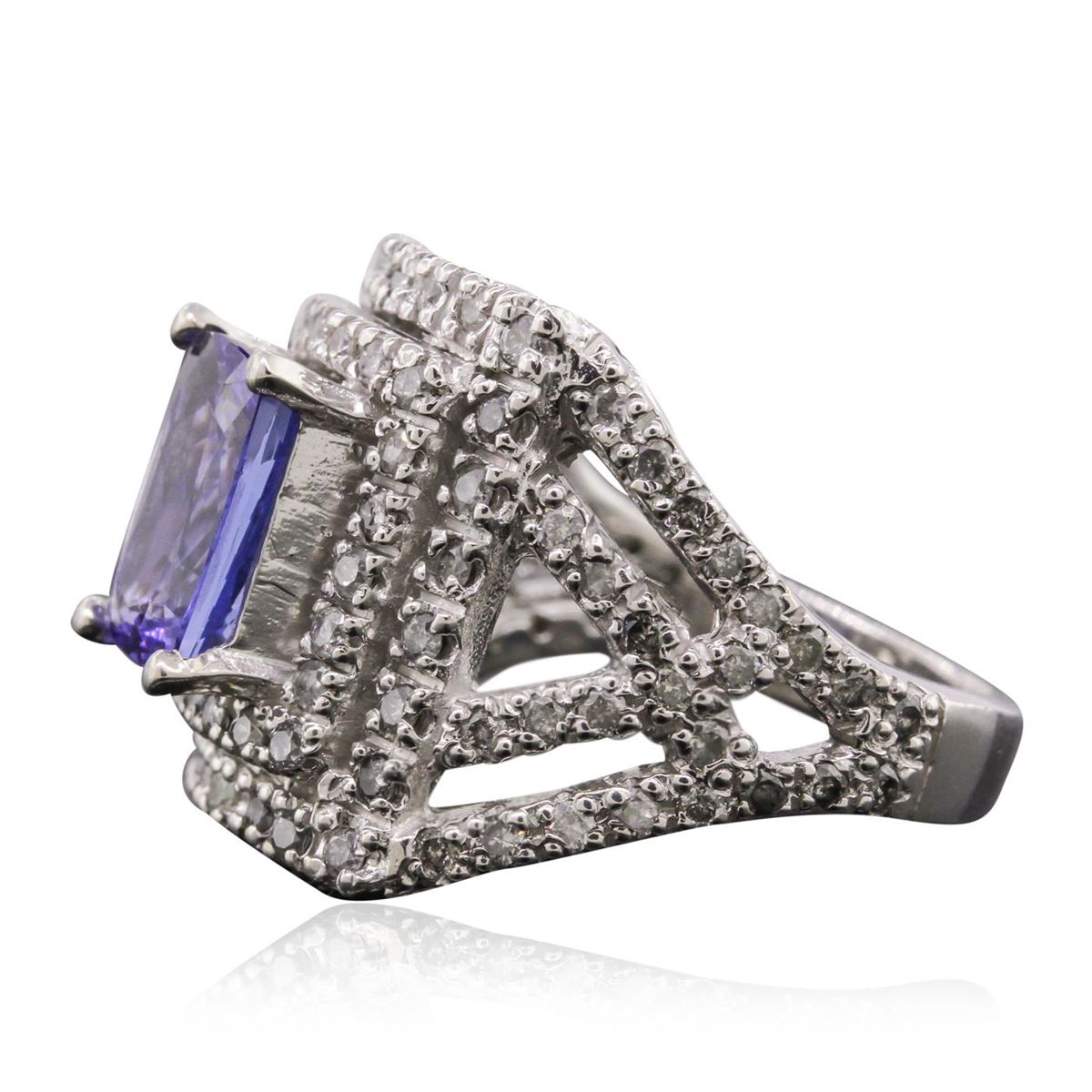 One electronically tested 14KT white gold ladies cast tanzanite and diamond ring with a bright polish finish. Condition is new, good workmanship. The featured tanzanite is set within a two tiered diamond gallery, supported by diamond set shoulders and completed by a two millimeter wide band. Identified with markings of "K14". Containing: One prong set rectangular step cut natural tanzanite, measuring 9.70 x 7.60 x 4.15mm, approximate weight of 2.80ct, clarity is eye clean, type I, medium, very slightly grayish, bluish violet color (GIA bV 5/3) cut is good. Transmitting light with no distortion, transparent. Graded in the setting. Tanzanite is a very rare gemstone that is only found in the country of Tanzania. Originally discovered in 1967. Tiffany & Company, named the stone Tanzanite. It is found in the Usumburu Mountains that border the Umba Valley of northern Tanzania. Tanzanite occurs in gray, brown, violet, blue, reddish-purple, & green. The gem is interesting because of its exceptional pleochroism. Rotated in different directions a tanzanite will exhibit multiple changes of color. Tanzanite has a low tolerance to ultrasonic cleaning, and should not be cleaned using this method. One hundred four prong set round brilliant cut diamonds, measuring 1.60 - 1.60 x 0.96mm (depth est) approximate total weight of 104 Stones = 1.70ct. Graded in the setting. Clarity I-2 to I-3 Color G-I. Total Weight of Colored Stones 2.80ct. Total Weight of Diamonds 1.70ct. Total Weight of Ring 9.70 grams. AIG Appraised at $11,185.00.
