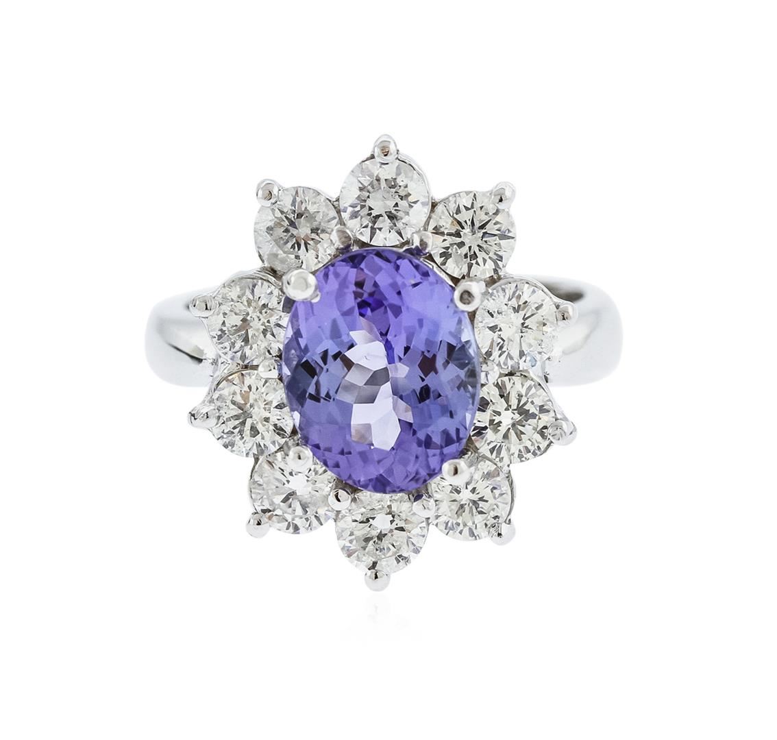 One electronically tested 14KT white gold ladies cast tanzanite and diamond ring with a bright polish finish. Identified with markings of "K14". Condition is new. Containing: One prong set oval modified brilliant cut natural tanzanite, measuring 10.00 x 7.90 x 5.04mm, approximate weight of 2.80ct., clarity is eye clean, type I, medium light, very slightly grayish, violet color, (GIA V 4/3), cut is good. Ten prong set round brilliant cut diamonds, measuring 3.50 - 3.50 x 2.10mm (depth est.) approximate total weight of 10 Stones = 1.57ct. Clarity: SI-2 to I-2. Color: H - I, Cut is Good. Colored gemstones are presumed to have been subjected to commonly used enhancement processes. All diamonds and colored gemstones are graded in the mounting, unless otherwise stated. Total Weight of Colored Stones 2.80ct. Total Weight of Diamonds 1.57ct. Total Weight of Ring 7.60 grams. GGL Appraised at $6,465.00.