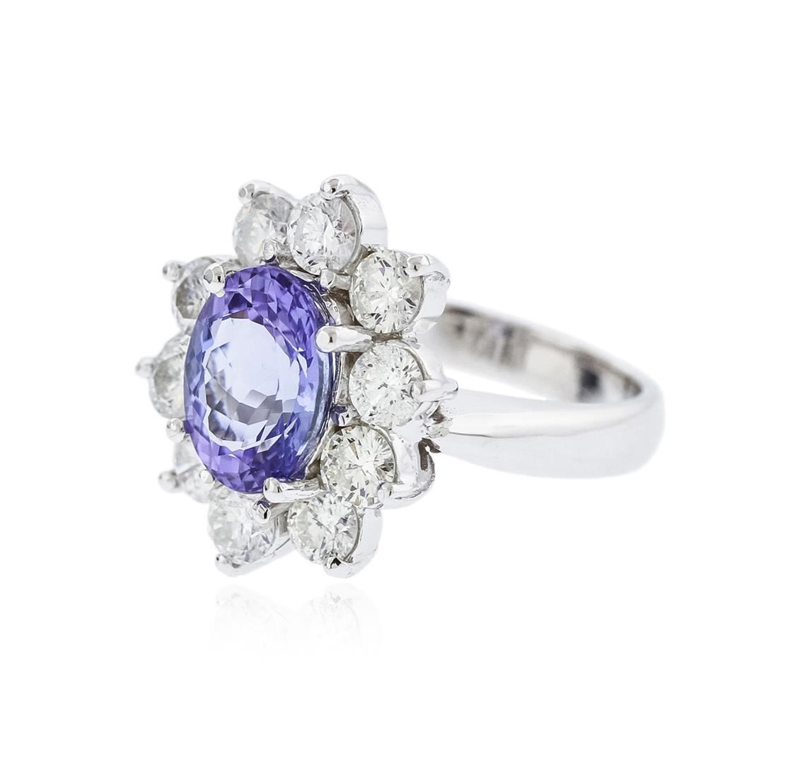 One electronically tested 14KT white gold ladies cast tanzanite and diamond ring with a bright polish finish. Identified with markings of "K14". Condition is new. Containing: One prong set oval modified brilliant cut natural tanzanite, measuring 10.00 x 7.90 x 5.04mm, approximate weight of 2.80ct., clarity is eye clean, type I, medium light, very slightly grayish, violet color, (GIA V 4/3), cut is good. Ten prong set round brilliant cut diamonds, measuring 3.50 - 3.50 x 2.10mm (depth est.) approximate total weight of 10 Stones = 1.57ct. Clarity: SI-2 to I-2. Color: H - I, Cut is Good. Colored gemstones are presumed to have been subjected to commonly used enhancement processes. All diamonds and colored gemstones are graded in the mounting, unless otherwise stated. Total Weight of Colored Stones 2.80ct. Total Weight of Diamonds 1.57ct. Total Weight of Ring 7.60 grams. GGL Appraised at $6,465.00.
