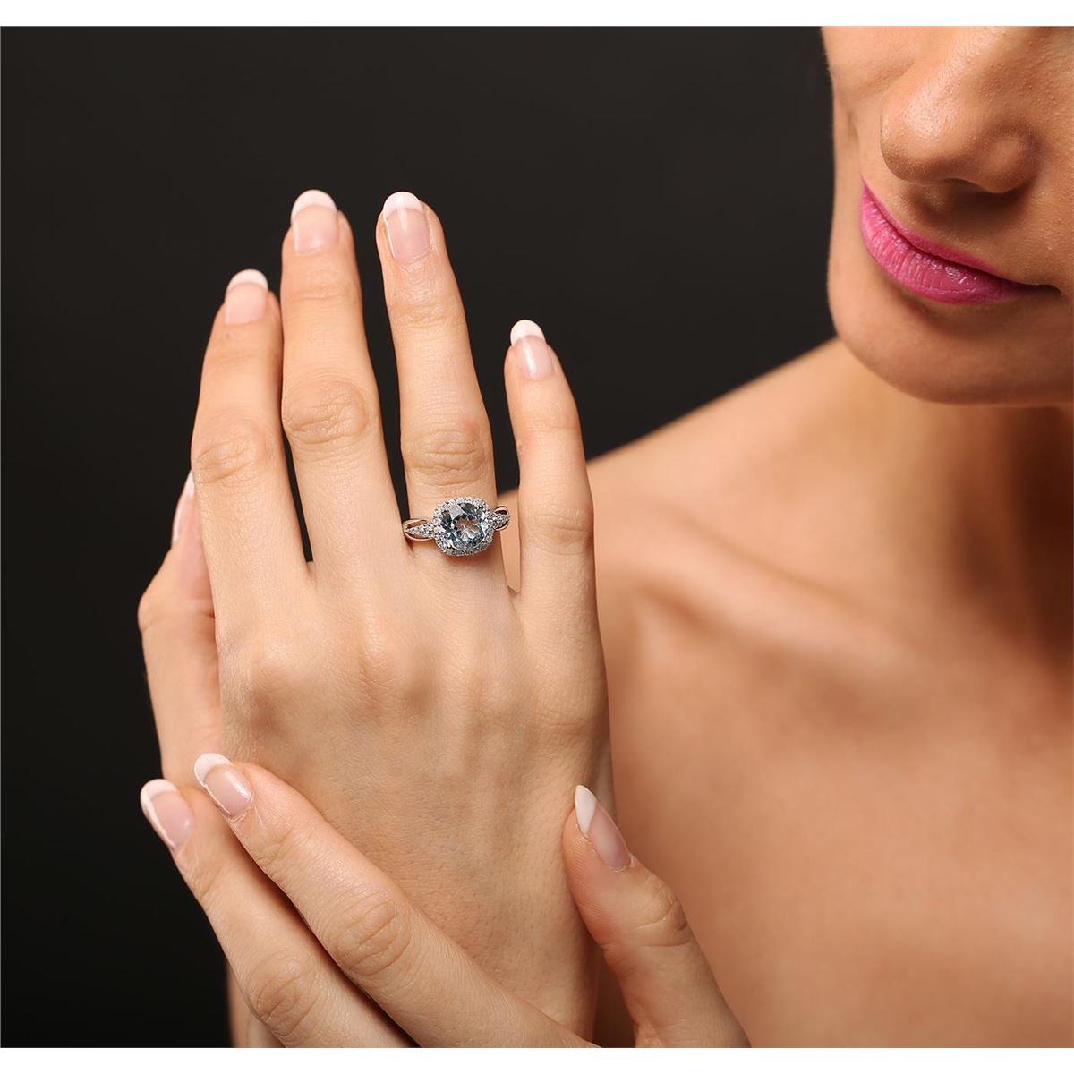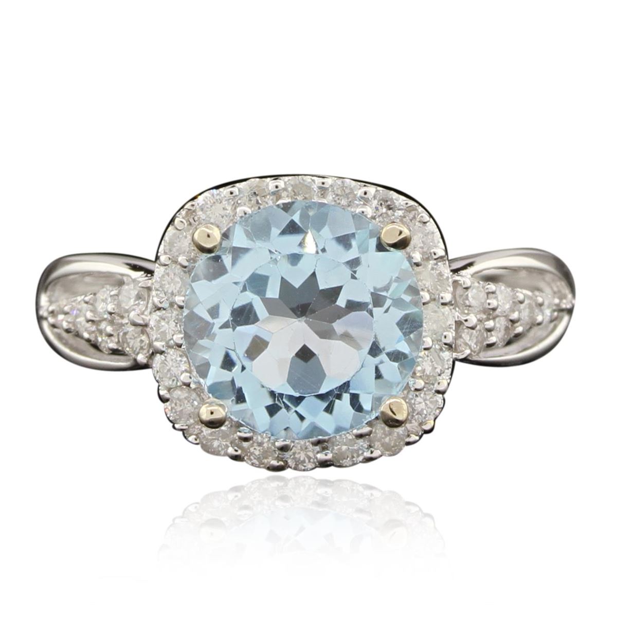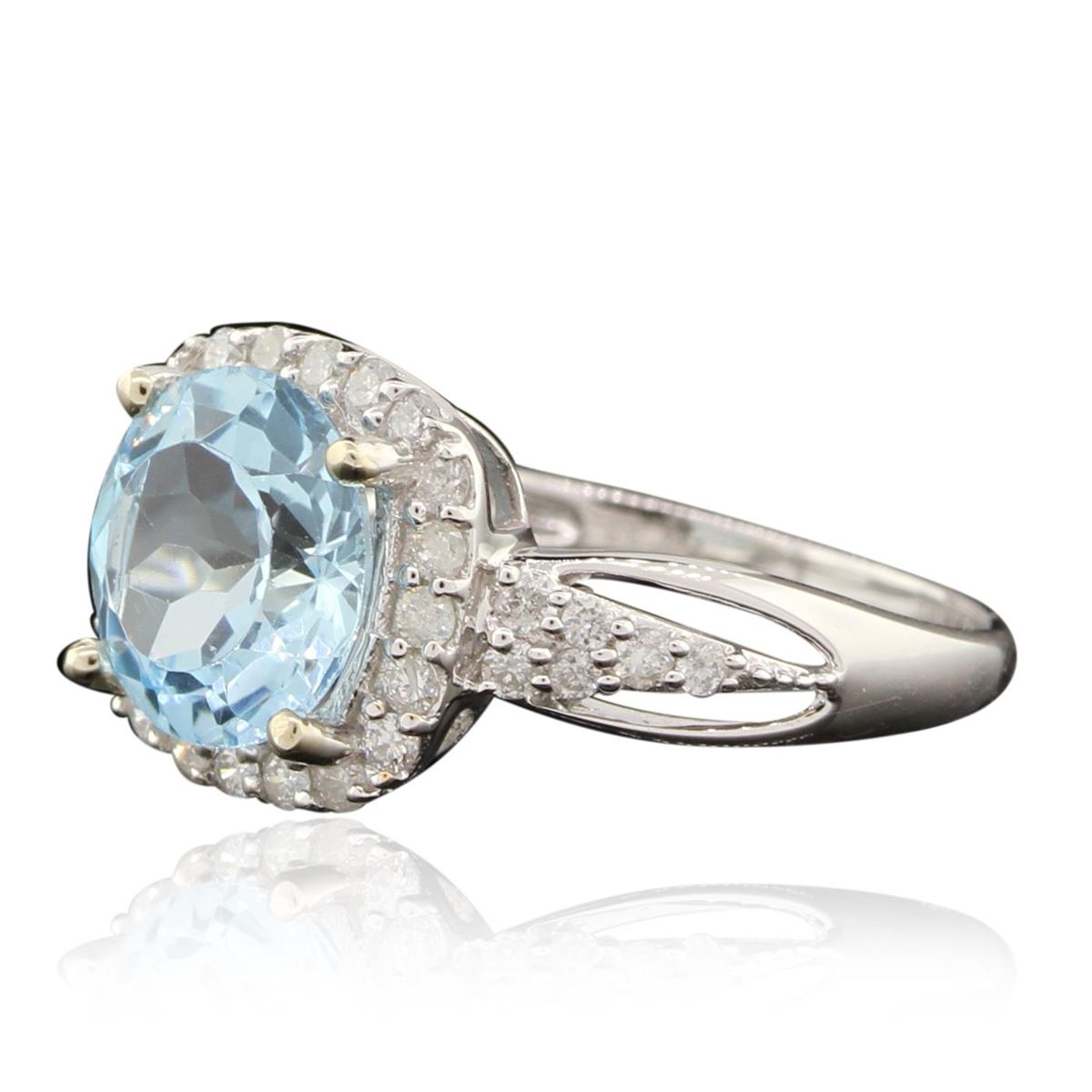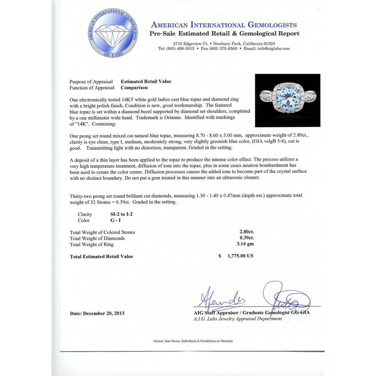 14KT white gold 2.80ct Blue Topaz and Diamond Ring A6561. One electronically tested 14KT white gold ladies cast blue topaz and diamond ring with a bright polish finish. The featured blue topaz is set within a diamond bezel supported by diamond set shoulders, completed by a one millimeter wide band. Trademark is Orianne. Identified with markings of "14K". Condition is new, good workmanship. Containing: One prong set round mixed cut natural blue topaz, measuring 8.70 - 8.60 x 5.00 mm, approximate weight of 2.80ct., clarity is eye clean, type I, medium, moderately strong, very slightly greenish blue color, (GIA vslgB 5/4), cut is good. Transmitting light with no distortion, transparent. Graded in the setting.A deposit of a thin layer has been applied to the topaz to produce the intense color effect. The process utilizes a very high temperature treatment, diffusion of ions into the topaz, plus in some cases neutron bombardment has been used to create the color center. Diffusion processes causes the added ions to become part of the crystal surface with no distinct boundary. Do not put a gem treated in this manner into an ultrasonic cleaner.Thirty-Two prong set round brilliant cut diamonds, measuring 1.50 - 1.40 x 0.87mm (depth est.) approximate. Total Weight of 32 Stones = 0.39ct. Graded in the setting. Clarity: SI-2 to I-2. Color: G - I. Total Weight of Colored Stones 2.80ct. Total Weight of Diamonds 0.39ct. AIG Appraised at $1,775.00.