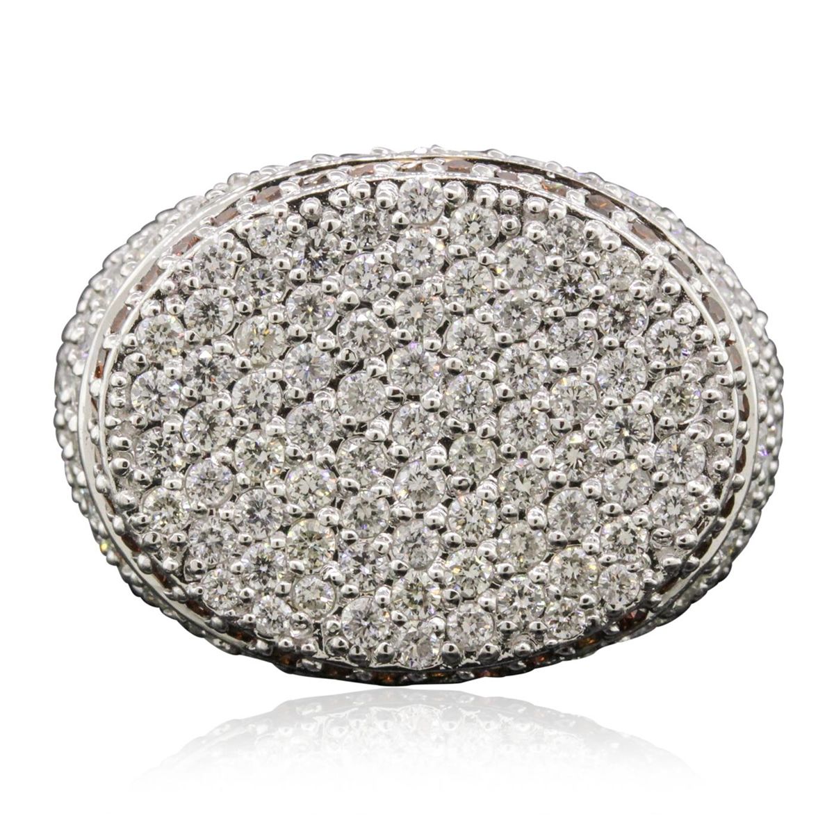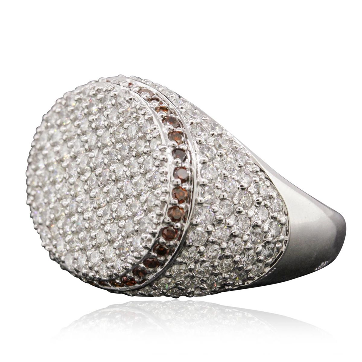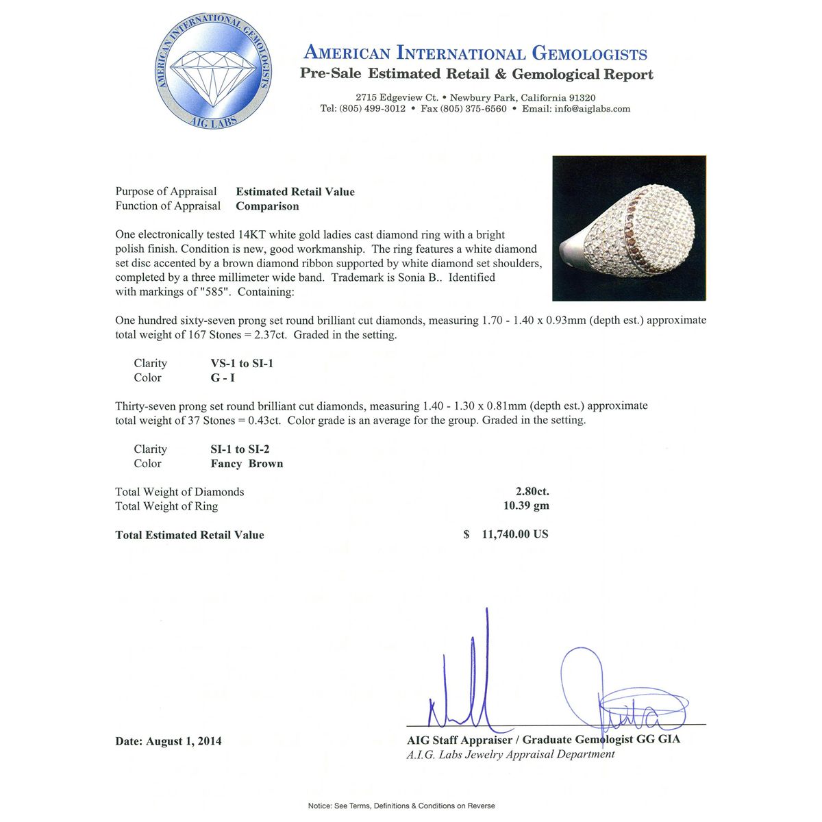 One electronically tested 14KT white gold ladies cast diamond ring with a bright polish finish. Condition is new, good workmanship. The ring features a white diamond set disc accented by a brown diamond ribbon supported by white diamond set shoulders, completed by a three millimeter wide band. Trademark is Sonia B. Identified with markings of "585". Containing: One Hundred Sixty-Seven prong set round brilliant cut diamonds, measuring 1.70 - 1.40 x 0.93mm (depth est.) approximate. Total Weight of 167 Stones = 2.37ct. Graded in the setting. Clarity: VS-1 to SI-1. Color: G - I Thirty-Seven prong set round brilliant cut diamonds, measuring 1.40 - 1.30 x 0.81mm (depth est.) approximate. Total Weight of 37 Stones = 0.43ct. Color grade is an average for the group. Graded in the setting. Clarity: SI-1 to SI-2. Total Weight of Diamonds 2.80ct. Total Weight of Ring 10.39 grams. AIG Appraised at $11,740.00.