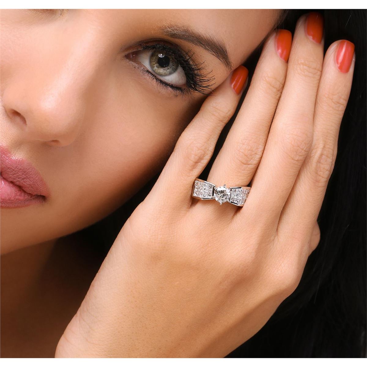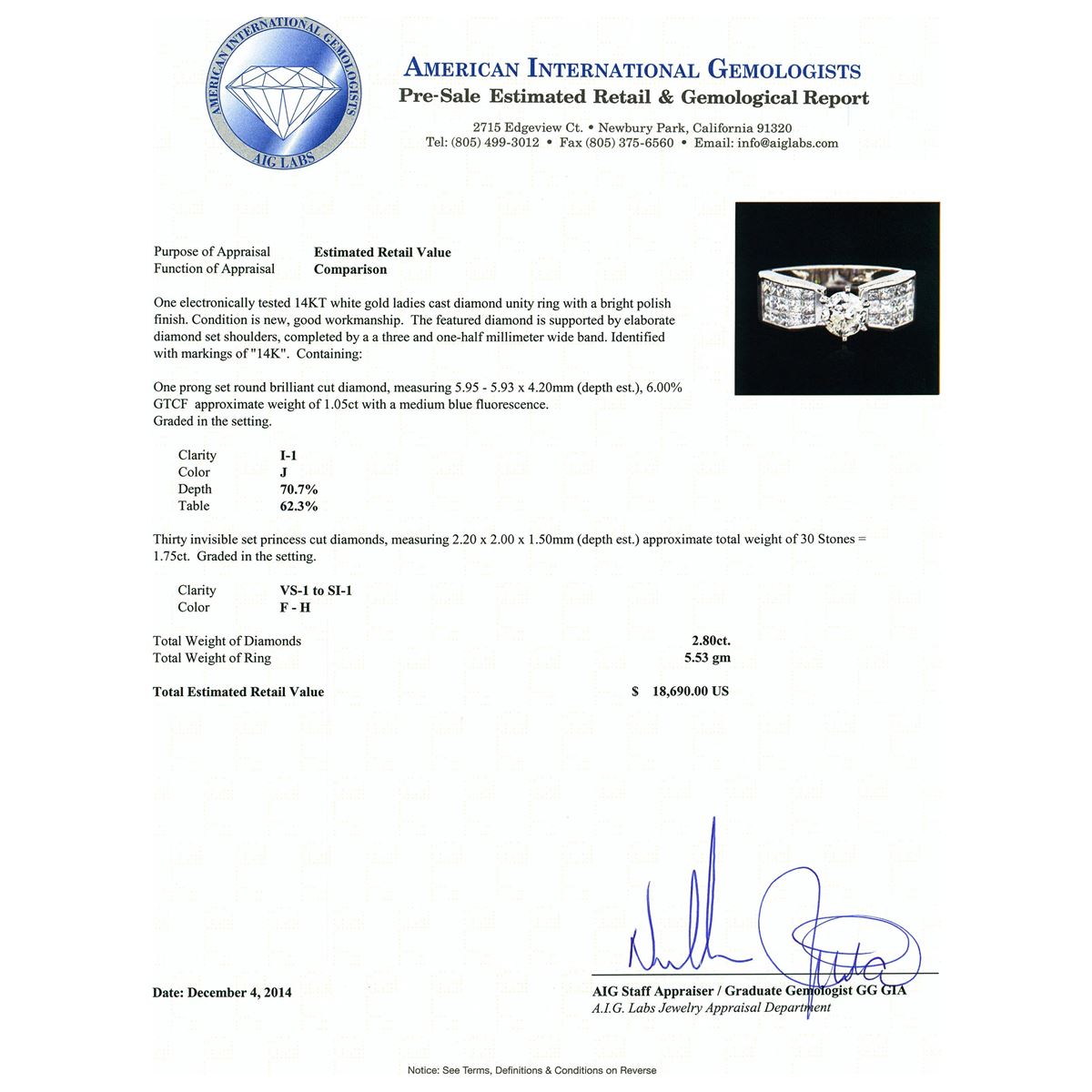 One electronically tested 14KT white gold ladies cast diamond unity ring with a bright polish finish. The featured diamond is supported by elaborate diamond set shoulders, completed by a a three and one-half millimeter wide band. Identified with markings of "14K". Condition is new, good workmanship. Containing: One prong set round brilliant cut diamond, measuring 5.95 - 5.93 x 4.20mm (depth est.), 6.00.%. GTCF approximate weight of 1.05ct with a medium blue fluorescence. Graded in the setting. Clarity: I-1. Color: 70.7%. Table 62.3%. Thirty invisible set princess cut diamonds, measuring 2.20 x 2.00 x 1.50mm (depth est.) approximate total weight of 30 Stones = 1.75ct. Graded in the setting. Clarity: VS-1 to SI-1. Color: F - H. Total Weight of Diamonds 2.80ct. Total Weight of Ring 5.53 grams. AIG Appraised at $18,690.00.