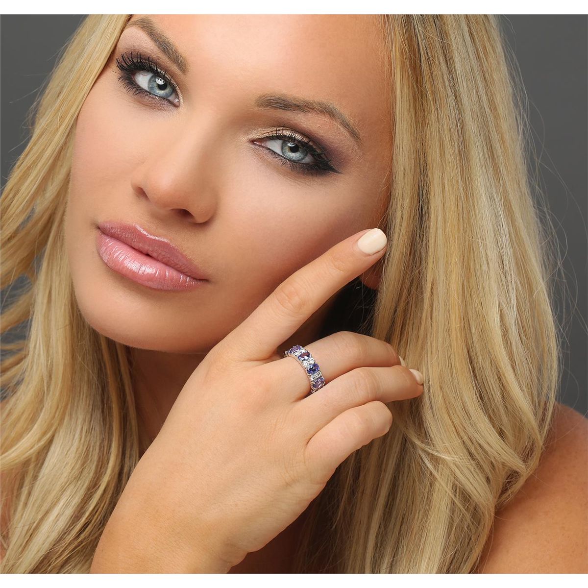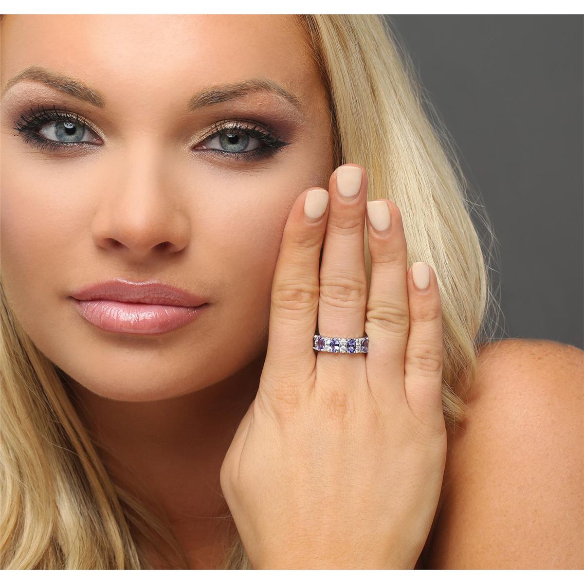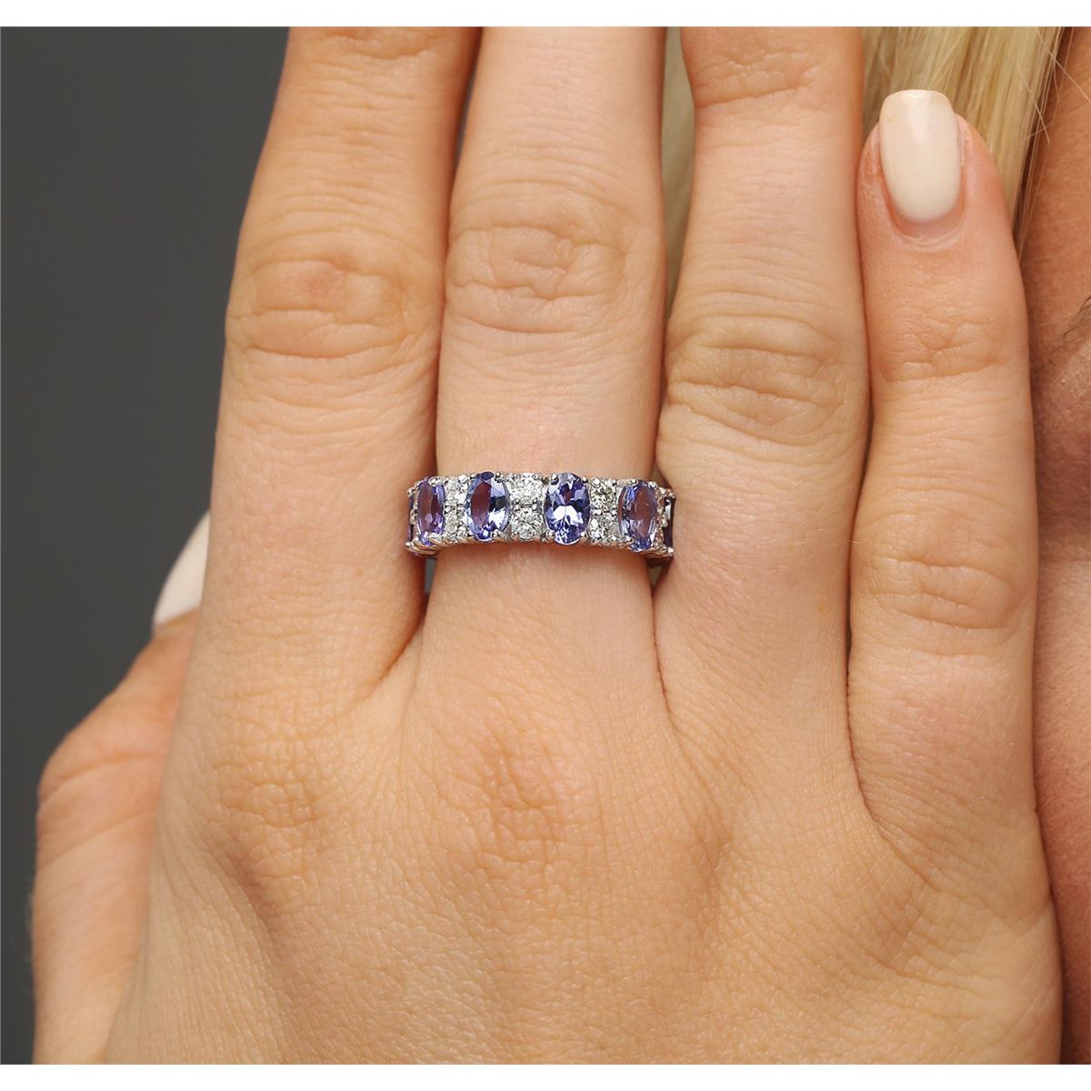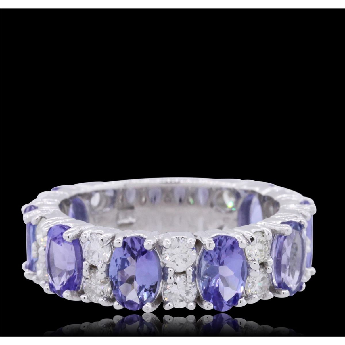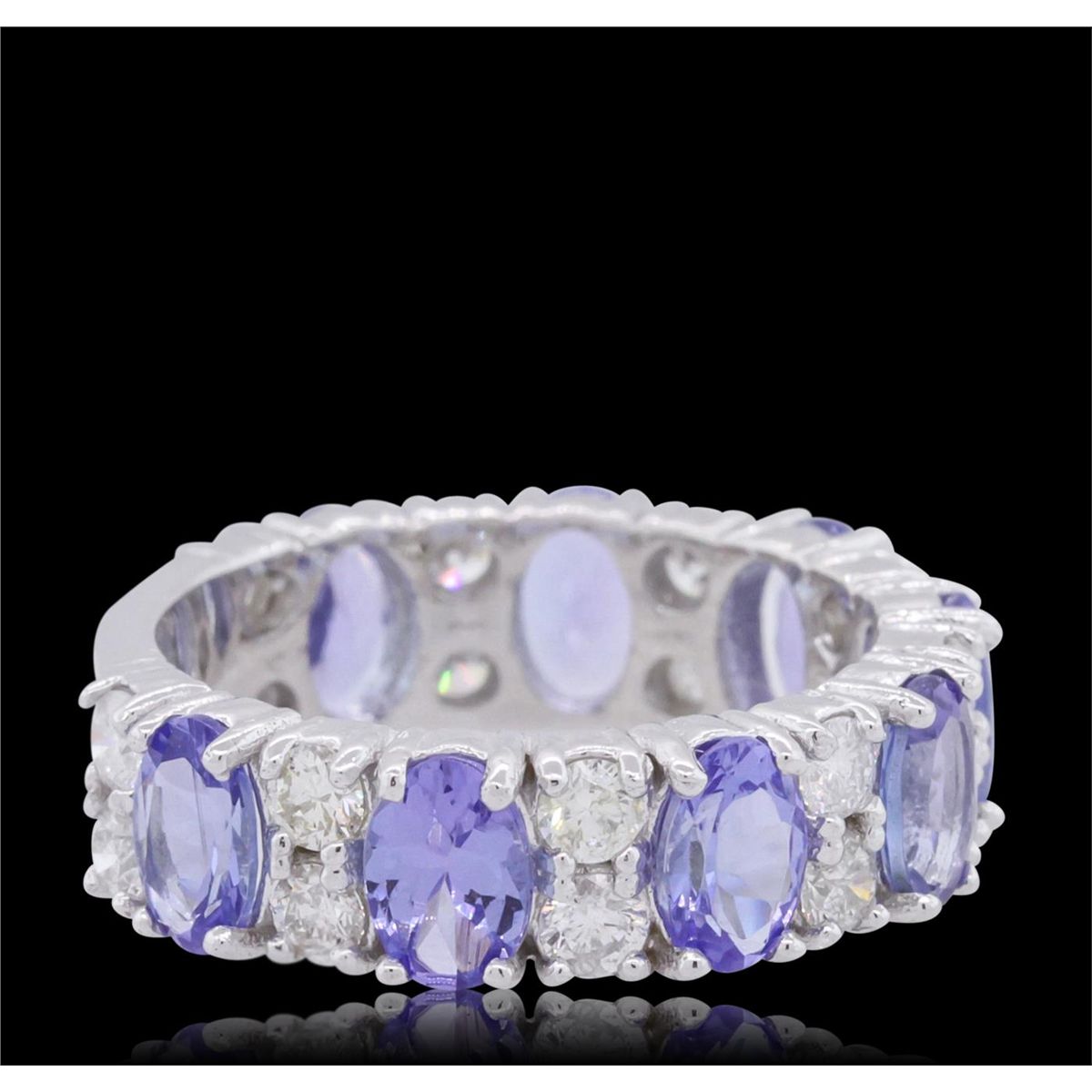 One electronically tested 14KT white gold ladies combination cast & assembled tanzanite and diamond ring with a flat shank with a bright polish finish. Identified with markings of "K14". Condition is new. Containing: Eight prong set oval modified brilliant cut natural tanzanites, measuring 5.81 x 4.00 x 2.16mm, approximate total weight of 2.80ct., clarity is eye clean, type I, medium light, very slightly grayish, violet color, (GIA V 4/3), cut is good. Eighteen prong set round brilliant cut diamonds, measuring 2.60 - 2.60 x 1.56mm (depth est.) approximate total weight of 18 Stones = 1.16ct. Clarity: SI-1 to I-1. Color: I - J, Cut is Good. Colored gemstones are presumed to have been subjected to commonly used enhancement processes. All diamonds and colored gemstones are graded in the mounting, unless otherwise stated. Total Weight of Colored Stones 2.80ct. Total Weight of Diamonds 1.16ct. Total Weight of Ring 5.90 grams. GGL Appraised at $4,755.00.