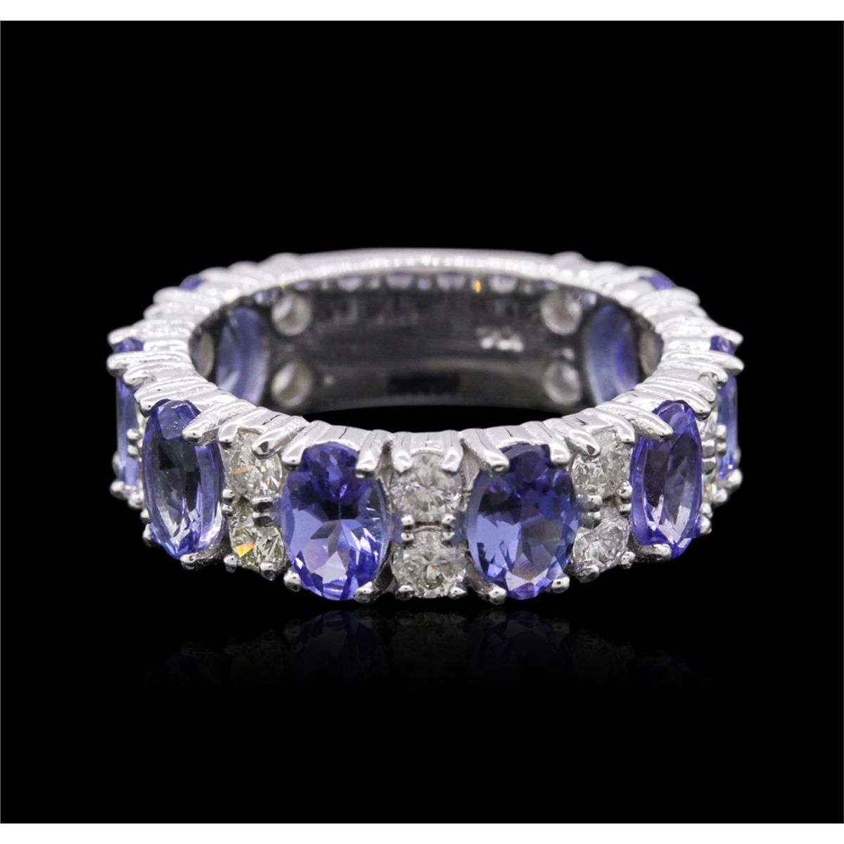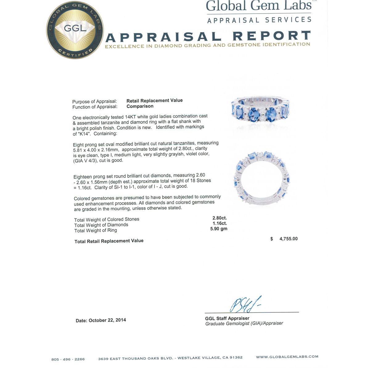 One electronically tested 14KT white gold ladies combination cast & assembled tanzanite and diamond ring with a flat shank with a bright polish finish. Identified with markings of "K14". Condition is new. Containing: Eight prong set oval modified brilliant cut natural tanzanites, measuring 5.81 x 4.00 x 2.16mm, approximate total weight of 2.80ct., clarity is eye clean, type I, medium light, very slightly grayish, violet color, (GIA V 4/3), cut is good. Eighteen prong set round brilliant cut diamonds, measuring 2.60 - 2.60 x 1.56mm (depth est.) approximate total weight of 18 Stones = 1.16ct. Clarity: SI-1 to I-1. Color: I - J, Cut is Good. Colored gemstones are presumed to have been subjected to commonly used enhancement processes. All diamonds and colored gemstones are graded in the mounting, unless otherwise stated. Total Weight of Colored Stones 2.80ct. Total Weight of Diamonds 1.16ct. Total Weight of Ring 5.90 grams. GGL Appraised at $4,755.00.