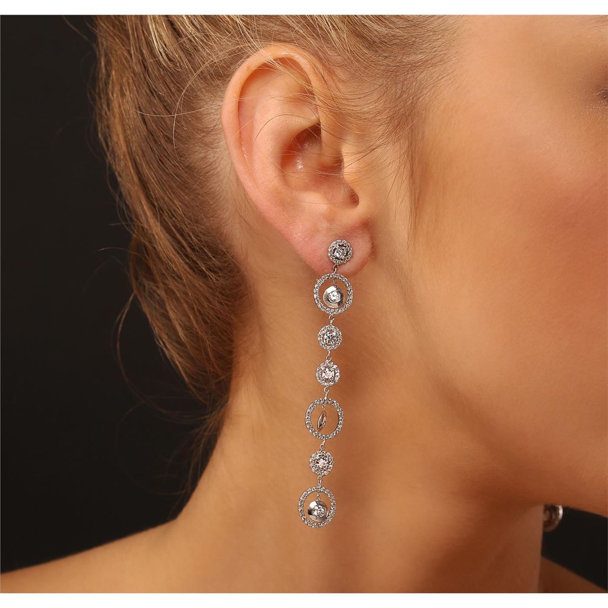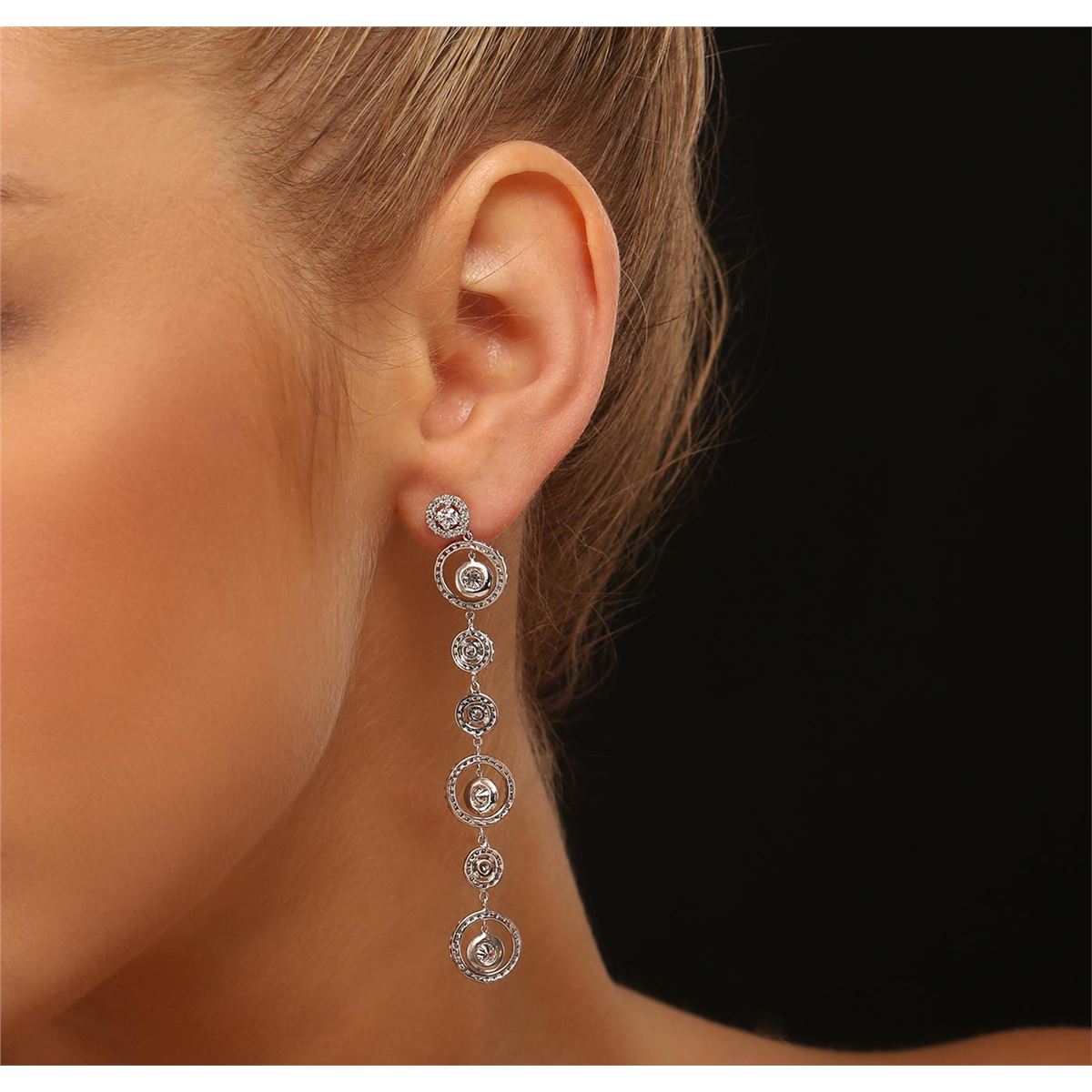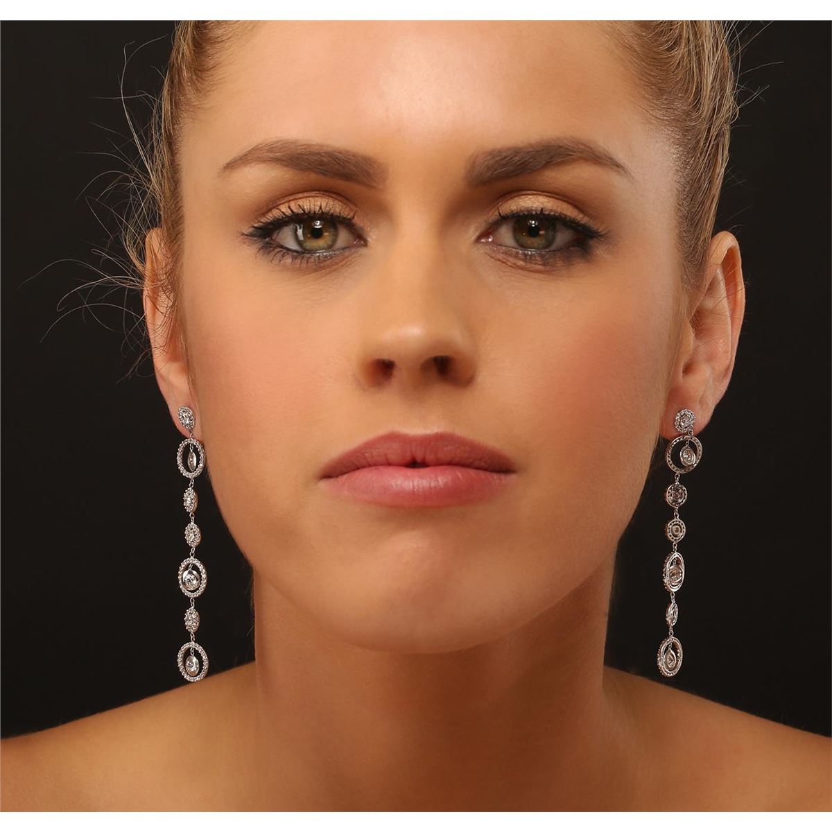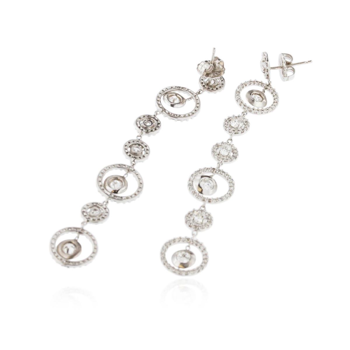 One pair electronically tested 14KT White Gold ladies cast & assembled diamond dangle earrings with standard backs. Condition is good. Each earring features a ribbon of diamond bezels. Bright polish finish. Identified with markings of "14K". Containing: Fourteen prong and bezel set round brilliant cut diamonds, measuring 3.00 - 3.20 x 1.86mm (depth est.) approximate. Total Weight of 14 Stones = 1.62ct. Graded in the setting. Clarity: VS-1 to VS-2 . Color: G - H. Two Hundred Sixty prong set round brilliant cut diamonds, measuring 1.10 - 1.00 x 0.63mm (depth est.) approximate. Total Weight of 260 Stones = 1.19ct. Graded in the setting. Clarity: SI-1 to SI-2 . Color: G - H. Total Weight of Diamonds 2.81ct. Total Weight of Earrings 7.23 grams. AIG Appraised at $10,915.00.