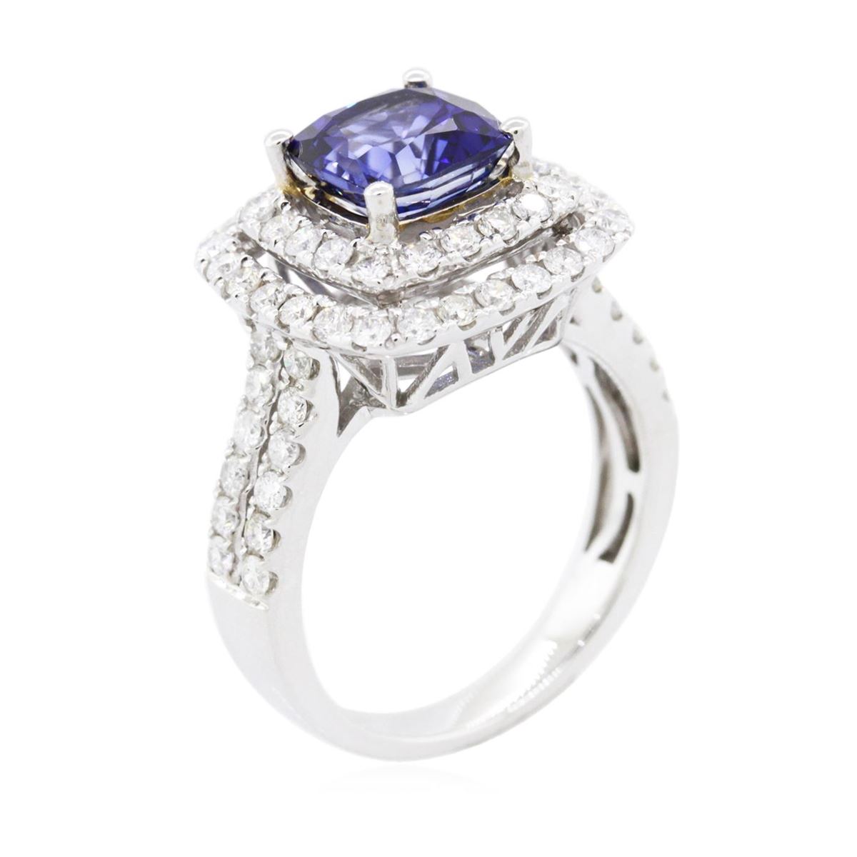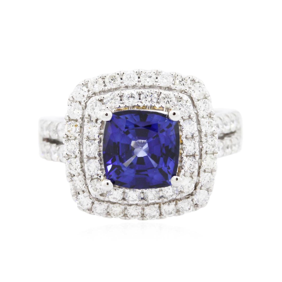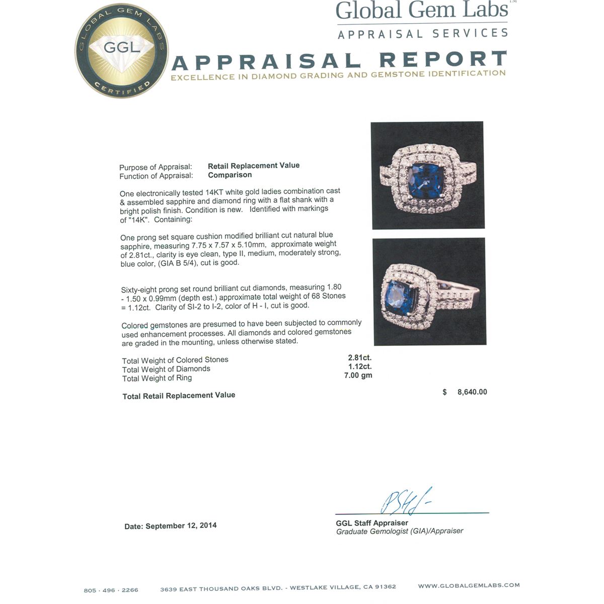 One electronically tested 14KT white gold ladies combination cast & assembled sapphire and diamond ring with a flat shank with a bright polish finish. Identified with markings of "14K". Condition is new. Containing: One prong set square cushion modified brilliant cut natural blue sapphire, measuring 7.75 x 7.57 x 5.10mm, approximate weight of 2.81ct., clarity is eye clean, type II, medium, moderately strong, blue color, (GIA B 5/4), cut is good. Sixty-Eight prong set round brilliant cut diamonds, measuring 1.80 - 1.50 x 0.99mm (depth est.) approximate total weight of 68 Stones = 1.12ct. Clarity: SI-2 to I-2. Color: H - I, Cut is Good. Colored gemstones are presumed to have been subjected to commonly used enhancement processes. All diamonds and colored gemstones are graded in the mounting, unless otherwise stated total weight of Colored Stones 2.81ct. Total Weight of Diamonds 1.12ct. Total Weight of Ring 7.00 grams. GGL Appraised at $8,640.00.