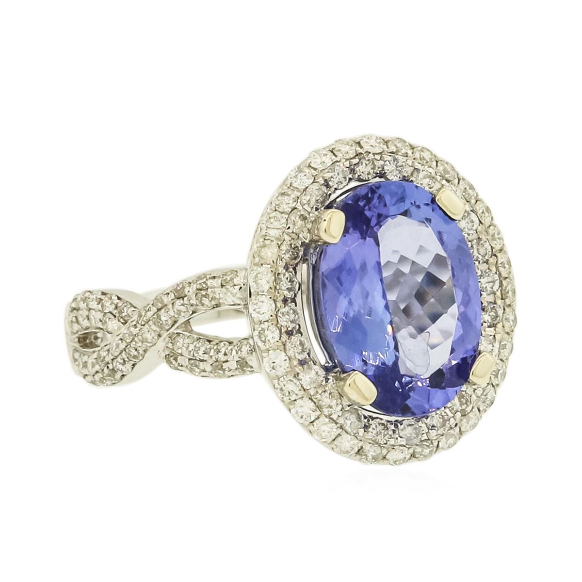 One electronically tested 14KT white gold ladies cast tanzanite and diamond ring with a bright polish finish. The featured tanzanite is set within a tiered diamond bezel supported by intertwining diamond set shoulders, completed by a two millimeter wide band. Trademark is UCG. Identified with markings of "14K 585". Condition is new, good workmanship. Containing: One prong set oval brilliant cut natural tanzanite, measuring 11.00 x 8.00 x 4.39mm, 6% bulge factor, approximate weight of 2.81ct., clarity is eye clean, type I, medium dark, very slightly grayish, bluish violet color, (GIA bV 6/3), cut is good. Transmitting light with no distortion, transparent. Graded in the setting. Tanzanite is a very rare gemstone that is only found in the country of Tanzania. Originally discovered in 1967. Tiffany & Company, named the stone Tanzanite. It is found in the Usumburu Mountains that border the Umba Valley of northern Tanzania. Tanzanite occurs in gray, brown, violet, blue, reddish-purple, & green. The gem is interesting because of its exceptional pleochroism. Rotated in different directions a tanzanite will exhibit multiple changes of color. Tanzanite has a low tolerance to ultrasonic cleaning, and should not be cleaned using this method. One Hundred Thirty-Four prong set round brilliant cut diamonds, measuring 1.20 - 1.00 x 0.66mm (depth est.) approximate total weight of 134 Stones = 0.74ct. Graded in the setting. Clarity: SI-2 to I-1. Color: G - I. Total Weight of Colored Stones 2.81ct. Total Weight of Diamonds 0.74ct. Total Weight of Ring 4.80 grams. AIG Appraised at $10,040.00.