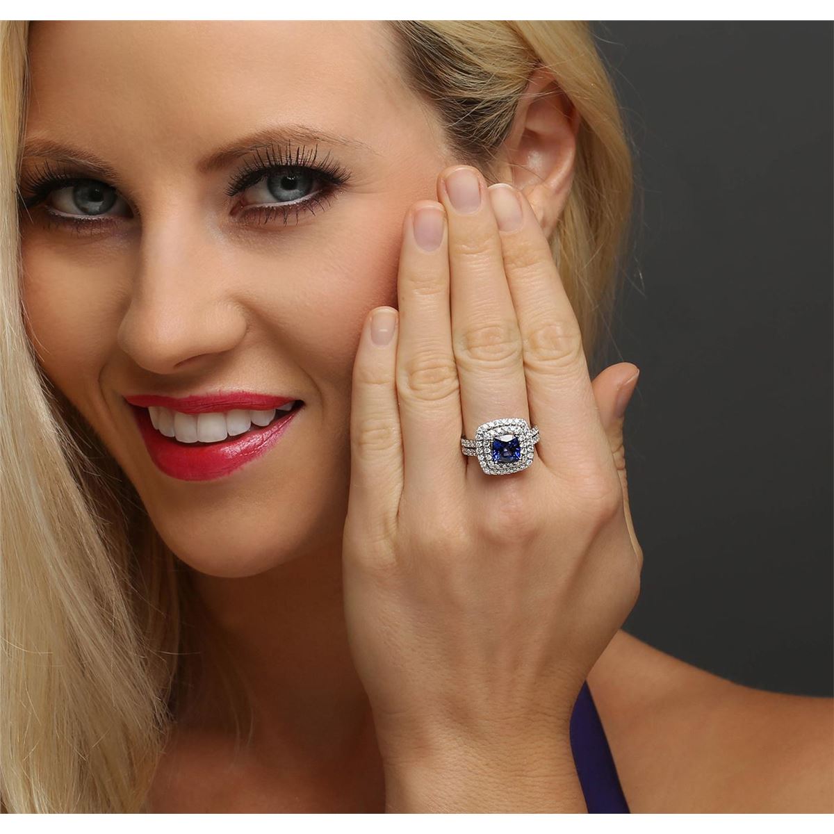 One electronically tested 14KT white gold ladies combination cast & assembled sapphire and diamond ring with a flat shank with a bright polish finish. Identified with markings of "14K". Condition is new. Containing: One prong set square cushion modified brilliant cut natural blue sapphire, measuring 7.75 x 7.57 x 5.10mm, approximate weight of 2.81ct., clarity is eye clean, type II, medium, moderately strong, blue color, (GIA B 5/4), cut is good. Sixty-Eight prong set round brilliant cut diamonds, measuring 1.80 - 1.50 x 0.99mm (depth est.) approximate total weight of 68 Stones = 1.12ct. Clarity: SI-2 to I-2. Color: H - I, Cut is Good. Colored gemstones are presumed to have been subjected to commonly used enhancement processes. All diamonds and colored gemstones are graded in the mounting, unless otherwise stated total weight of Colored Stones 2.81ct. Total Weight of Diamonds 1.12ct. Total Weight of Ring 7.00 grams. GGL Appraised at $8,640.00.