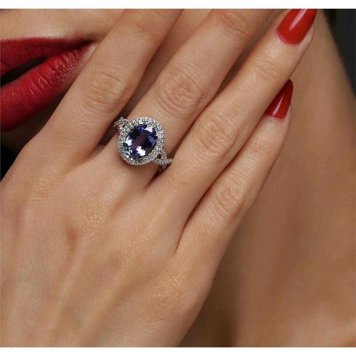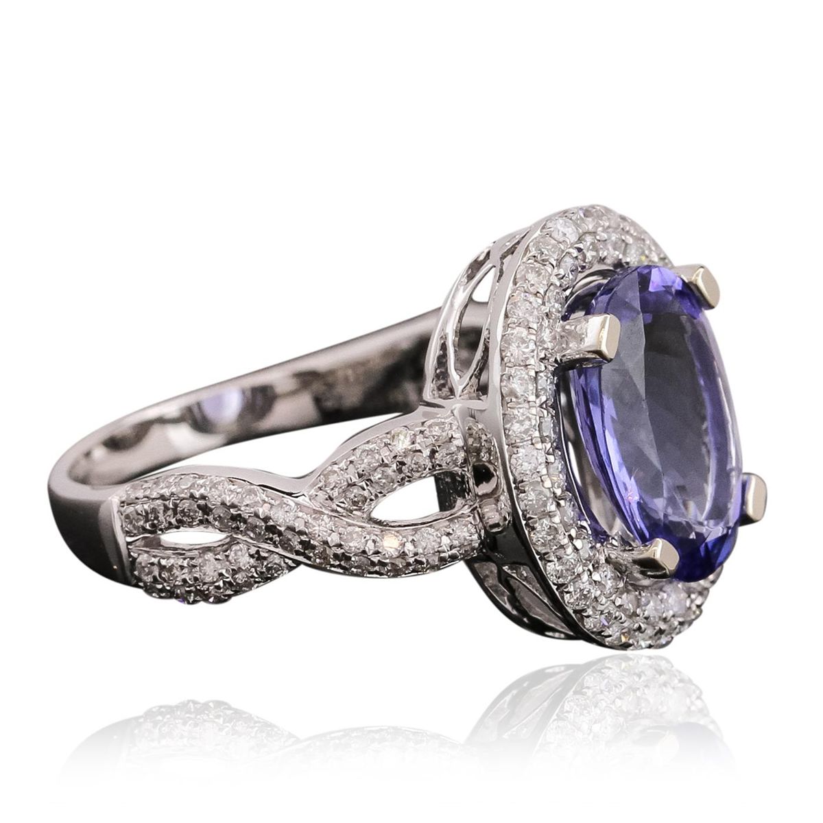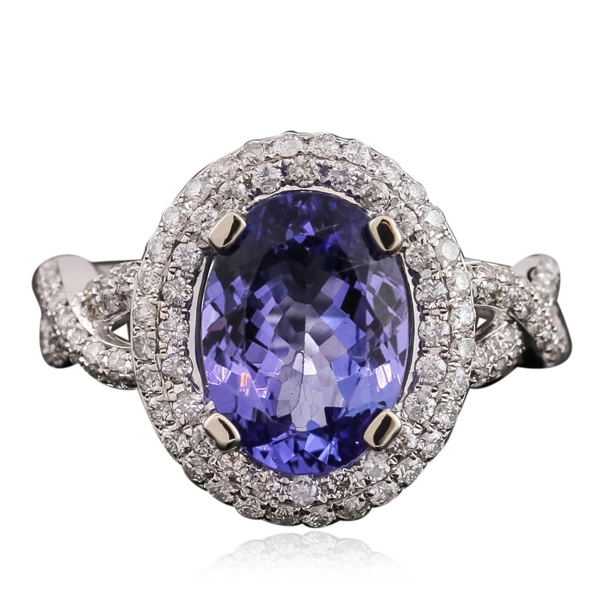 One electronically tested 14KT white gold ladies cast tanzanite and diamond ring with a bright polish finish. The featured tanzanite is set within a tiered diamond bezel supported by intertwining diamond set shoulders, completed by a two millimeter wide band. Trademark is UCG. Identified with markings of "14K 585". Condition is new, good workmanship. Containing: One prong set oval brilliant cut natural tanzanite, measuring 11.00 x 8.00 x 4.39mm, 6% bulge factor, approximate weight of 2.81ct., clarity is eye clean, type I, medium dark, very slightly grayish, bluish violet color, (GIA bV 6/3), cut is good. Transmitting light with no distortion, transparent. Graded in the setting. Tanzanite is a very rare gemstone that is only found in the country of Tanzania. Originally discovered in 1967. Tiffany & Company, named the stone Tanzanite. It is found in the Usumburu Mountains that border the Umba Valley of northern Tanzania. Tanzanite occurs in gray, brown, violet, blue, reddish-purple, & green. The gem is interesting because of its exceptional pleochroism. Rotated in different directions a tanzanite will exhibit multiple changes of color. Tanzanite has a low tolerance to ultrasonic cleaning, and should not be cleaned using this method. One Hundred Thirty-Four prong set round brilliant cut diamonds, measuring 1.20 - 1.00 x 0.66mm (depth est.) approximate total weight of 134 Stones = 0.74ct. Graded in the setting. Clarity: SI-2 to I-1. Color: G - I. Total Weight of Colored Stones 2.81ct. Total Weight of Diamonds 0.74ct. Total Weight of Ring 4.80 grams. AIG Appraised at $10,040.00.