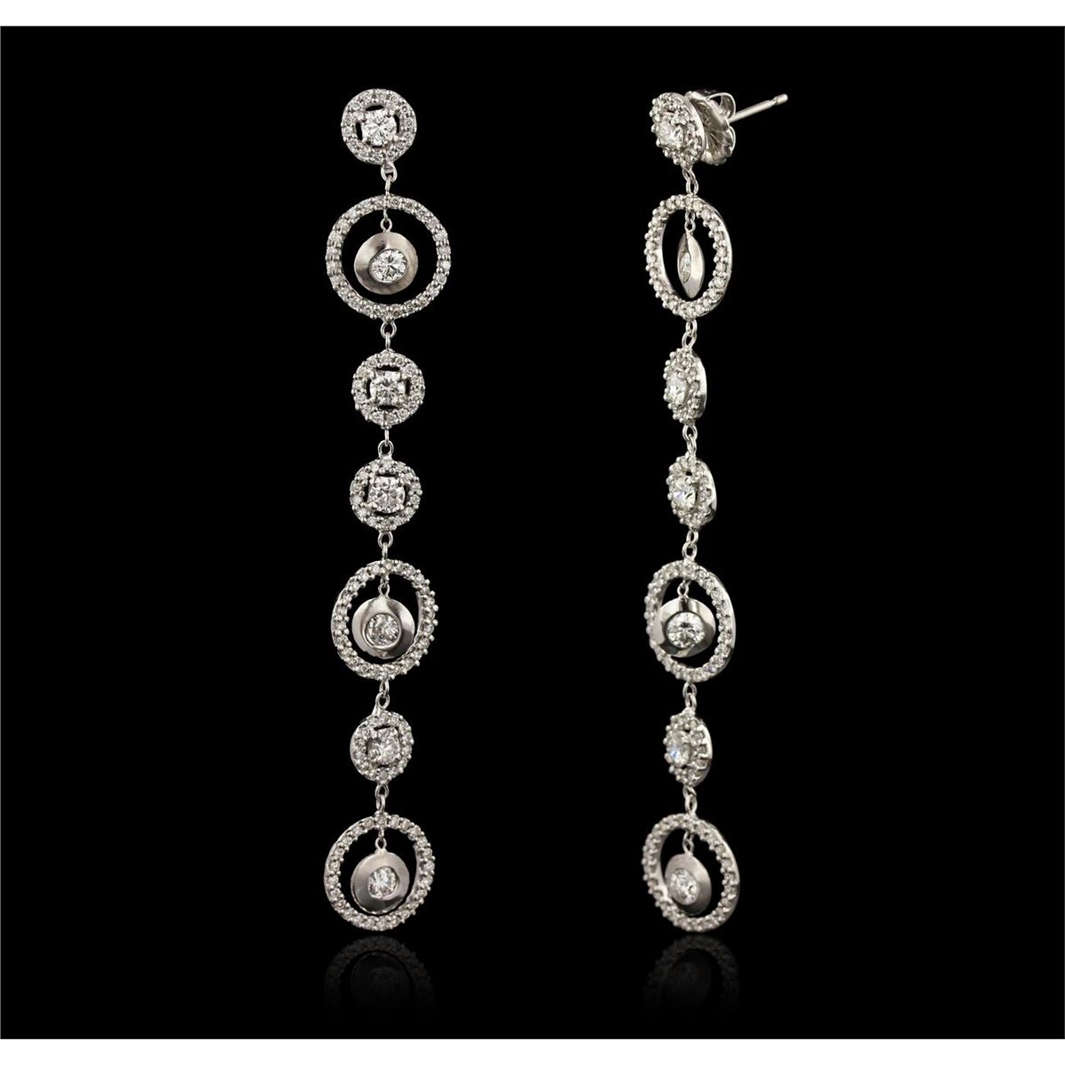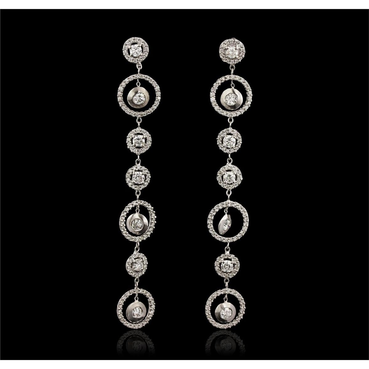 One pair electronically tested 14KT White Gold ladies cast & assembled diamond dangle earrings with standard backs. Condition is good. Each earring features a ribbon of diamond bezels. Bright polish finish. Identified with markings of "14K". Containing: Fourteen prong and bezel set round brilliant cut diamonds, measuring 3.00 - 3.20 x 1.86mm (depth est.) approximate. Total Weight of 14 Stones = 1.62ct. Graded in the setting. Clarity: VS-1 to VS-2 . Color: G - H. Two Hundred Sixty prong set round brilliant cut diamonds, measuring 1.10 - 1.00 x 0.63mm (depth est.) approximate. Total Weight of 260 Stones = 1.19ct. Graded in the setting. Clarity: SI-1 to SI-2 . Color: G - H. Total Weight of Diamonds 2.81ct. Total Weight of Earrings 7.23 grams. AIG Appraised at $10,915.00.