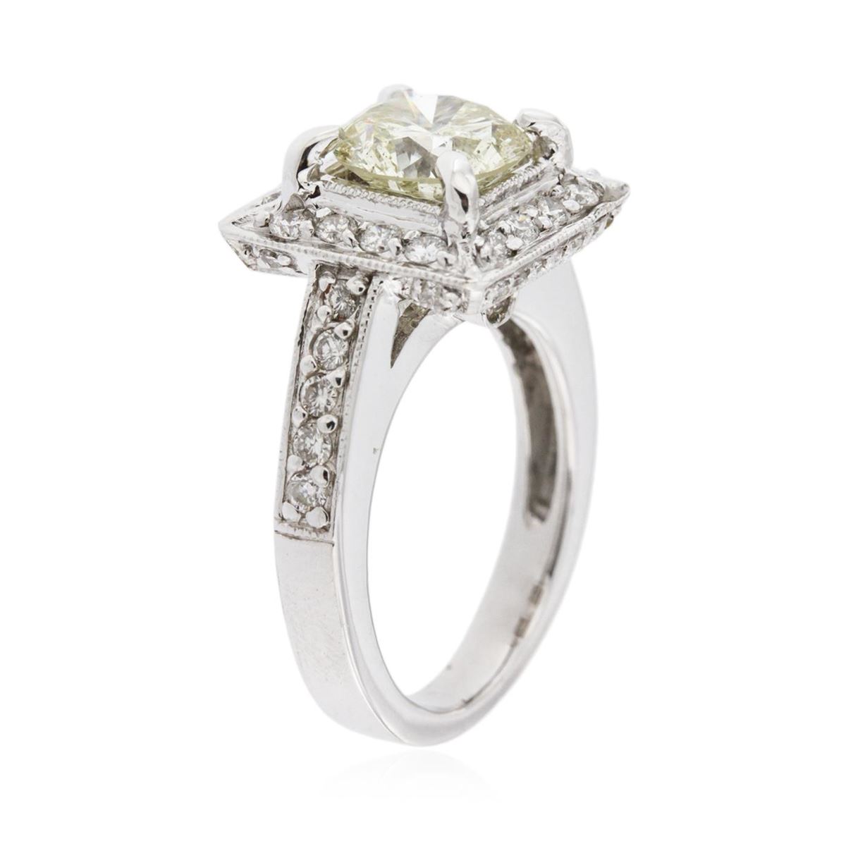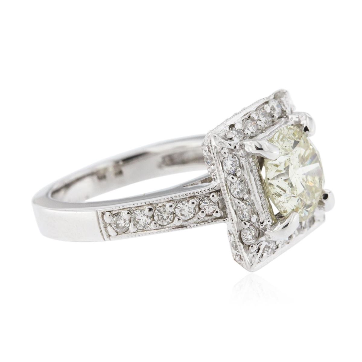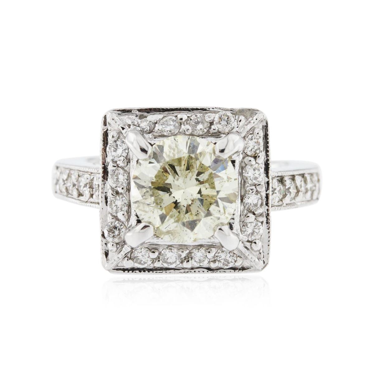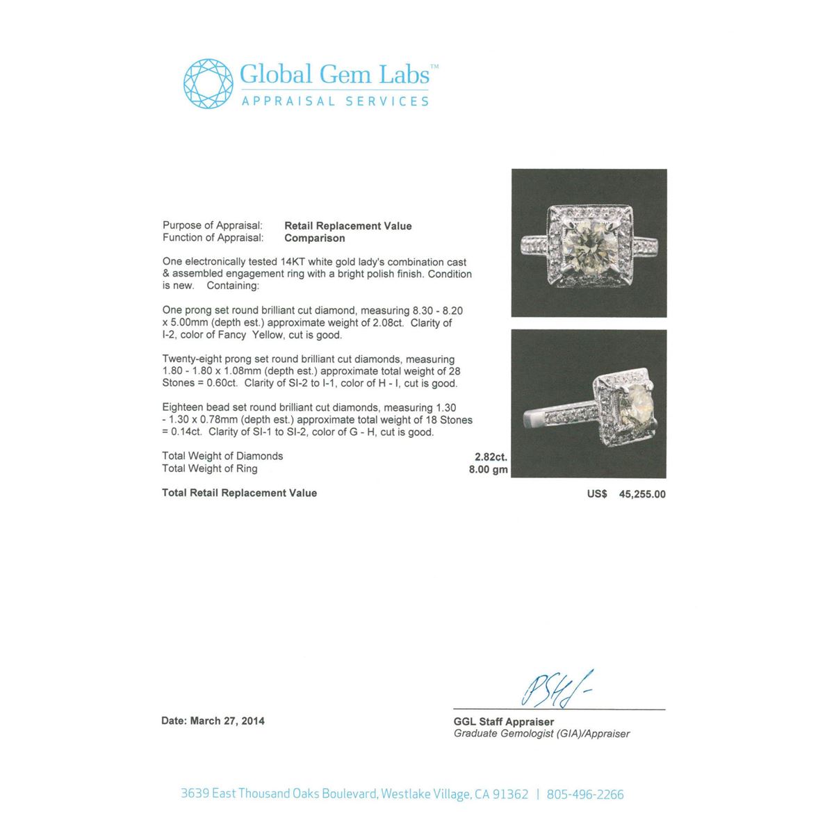 One electronically tested 14KT white gold Ladies combination cast & assembled engagement ring with a bright polish finish. Condition is new. Containing: One prong set round brilliant cut diamond, measuring 8.30 - 8.20 x 5.00.mm (depth est.) approximate weight of 2.08ct. Clarity: I-2, Cut is Good. Twenty-Eight prong set round brilliant cut diamonds, measuring 1.80 - 1.80 x 1.08mm (depth est.) approximate. Total Weight of 28 Stones = 0.60ct. Clarity: SI-2 to I-1. Color: H - I, Cut is Good. Eighteen bead set round brilliant cut diamonds, measuring 1.30 - 1.30 x 0.78mm (depth est.) approximate. Total Weight of 18 Stones = 0.14ct. Clarity: SI-1 to SI-2. Color: G - H, Cut is Good. Total Weight of Diamonds 2.82ct. Total Weight of Ring 8.00 grams. GGL Appraised at $45,255.00.