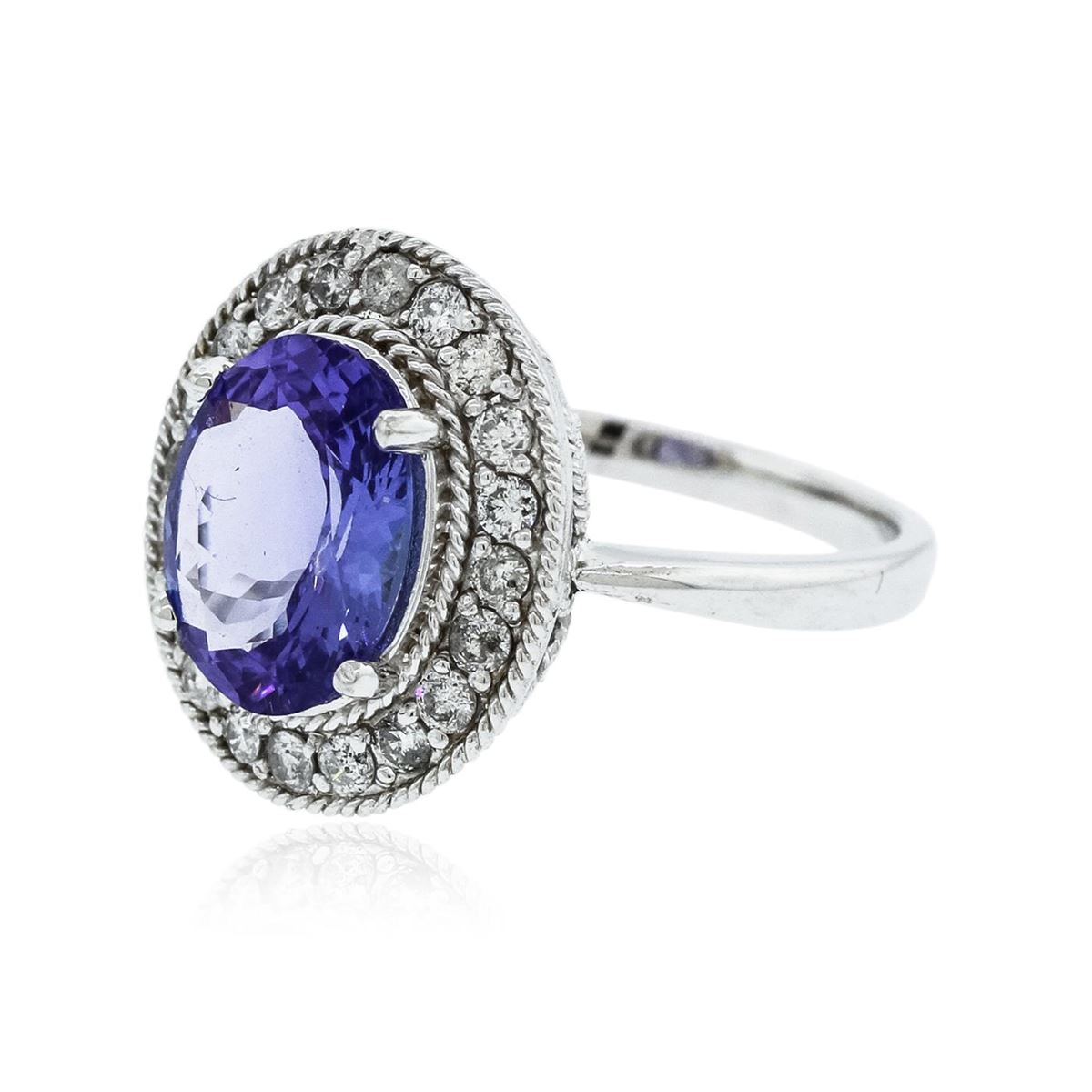 One electronically tested 14KT white gold ladies cast tanzanite and diamond ring with a bright and milgrain finish. The featured tanzanite is set within a diamond lattice gallery, completed by a two millimeter wide band. Identified with markings of "K14". Condition is new, good workmanship. Containing: One prong set oval mixed cut natural tanzanite, measuring 11.00 x 8.50 x 4.45mm, approximate weight of 2.82ct., clarity is eye clean, type I, medium, very slightly grayish, violet color, (GIA V 5/3), cut is good. Transmitting light with no distortion, transparent. Graded in the setting. Tanzanite is a very rare gemstone that is only found in the country of Tanzania. Originally discovered in 1967. Tiffany & Company, named the stone Tanzanite. It is found in the Usumburu Mountains that border the Umba Valley of northern Tanzania. Tanzanite occurs in gray, brown, violet, blue, reddish-purple, & green. The gem is interesting because of its exceptional pleochroism. Rotated in different directions a tanzanite will exhibit multiple changes of color. Tanzanite has a low tolerance to ultrasonic cleaning, and should not be cleaned using this method. Twenty bead set round brilliant cut diamonds, measuring 2.00 - 1.80 x 1.14mm (depth est.) approximate. Total Weight of 20 Stones = 0.51ct. Graded in the setting. Clarity: SI-2 to I-2 . Color: G - I. Total Weight of Colored Stones 2.82ct.. Total Weight of Diamonds 0.51ct. AIG Appraised at $8,025.00.