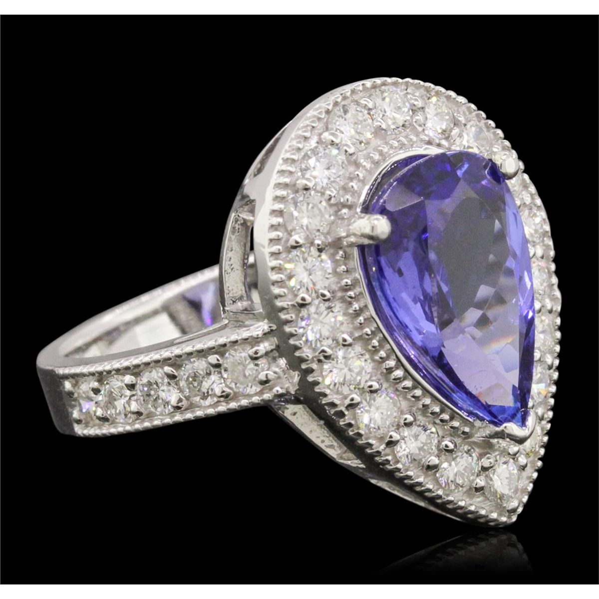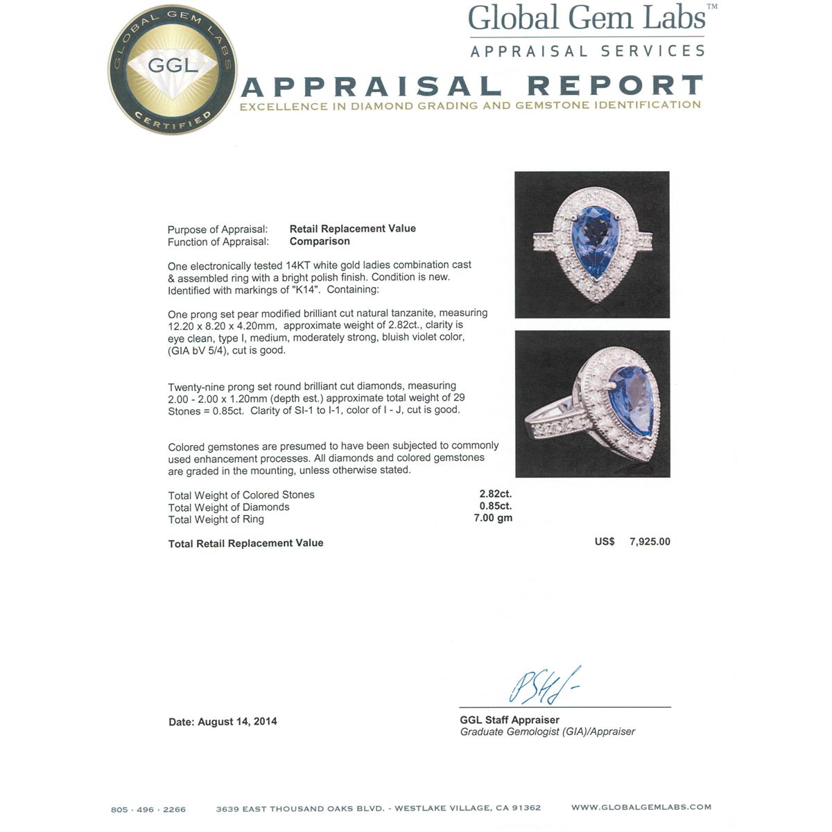 One electronically tested 14KT white gold ladies combination cast & assembled ring with a bright polish finish. Condition is new. Identified with markings of "K14". Containing: One prong set pear modified brilliant cut natural tanzanite, measuring 12.20 x 8.20 x 4.20mm, approximate weight of 2.82ct., clarity is eye clean, type I, medium, moderately strong, bluish violet color, (GIA bV 5/4), cut is good. Twenty-Nine prong set round brilliant cut diamonds, measuring 2.00 - 2.00 x 1.20mm (depth est.) approximate total weight of 29 Stones = 0.85ct. Clarity: SI-1 to I-1. Color: I - J, Cut is Good. Colored gemstones are presumed to have been subjected to commonly used enhancement processes. All diamonds and colored gemstones are graded in the mounting, unless otherwise stated. Total Weight of Colored Stones 2.82ct. Total Weight of Diamonds 0.85ct. Total Weight of Ring 7.00 grams. GGL Appraised at $7,925.00.