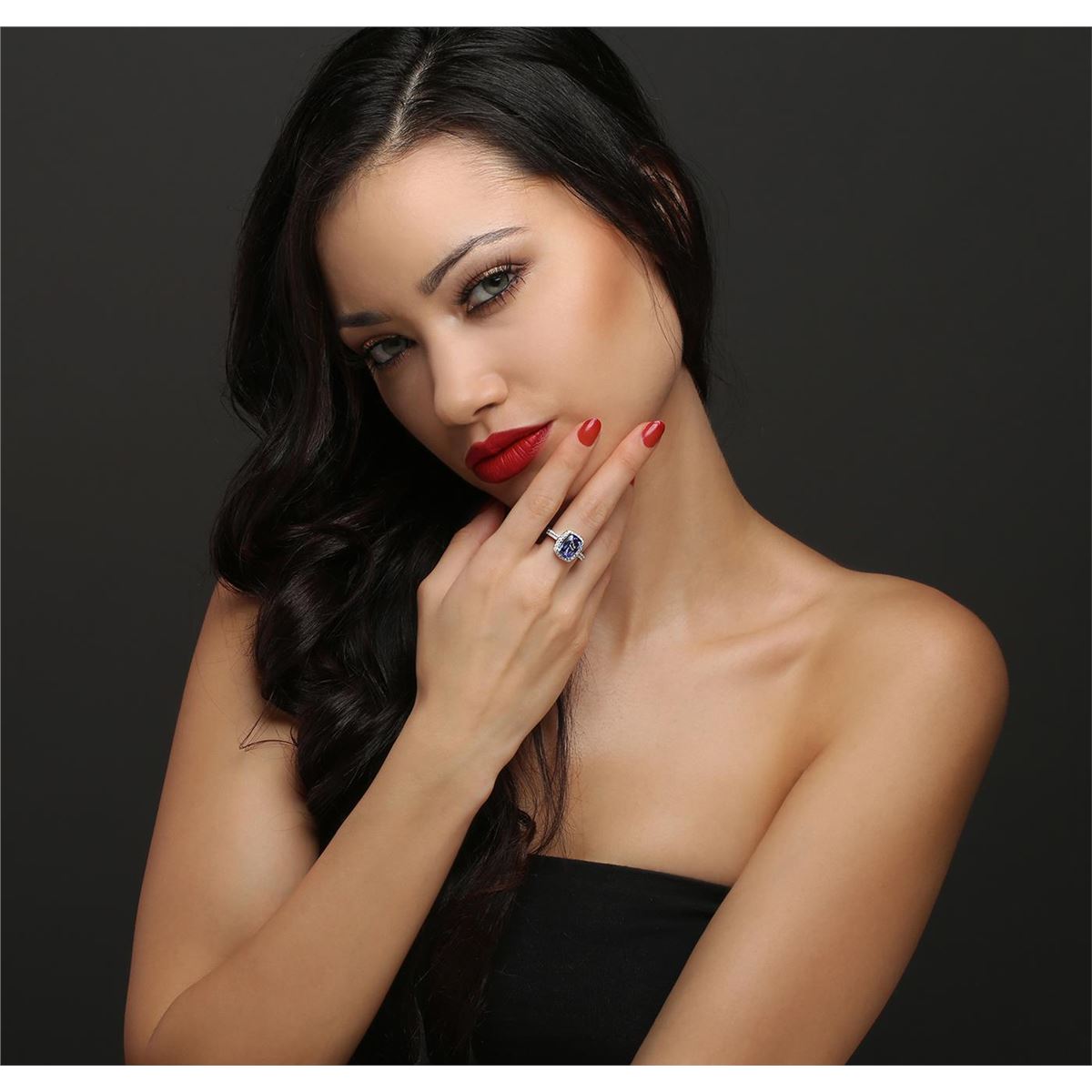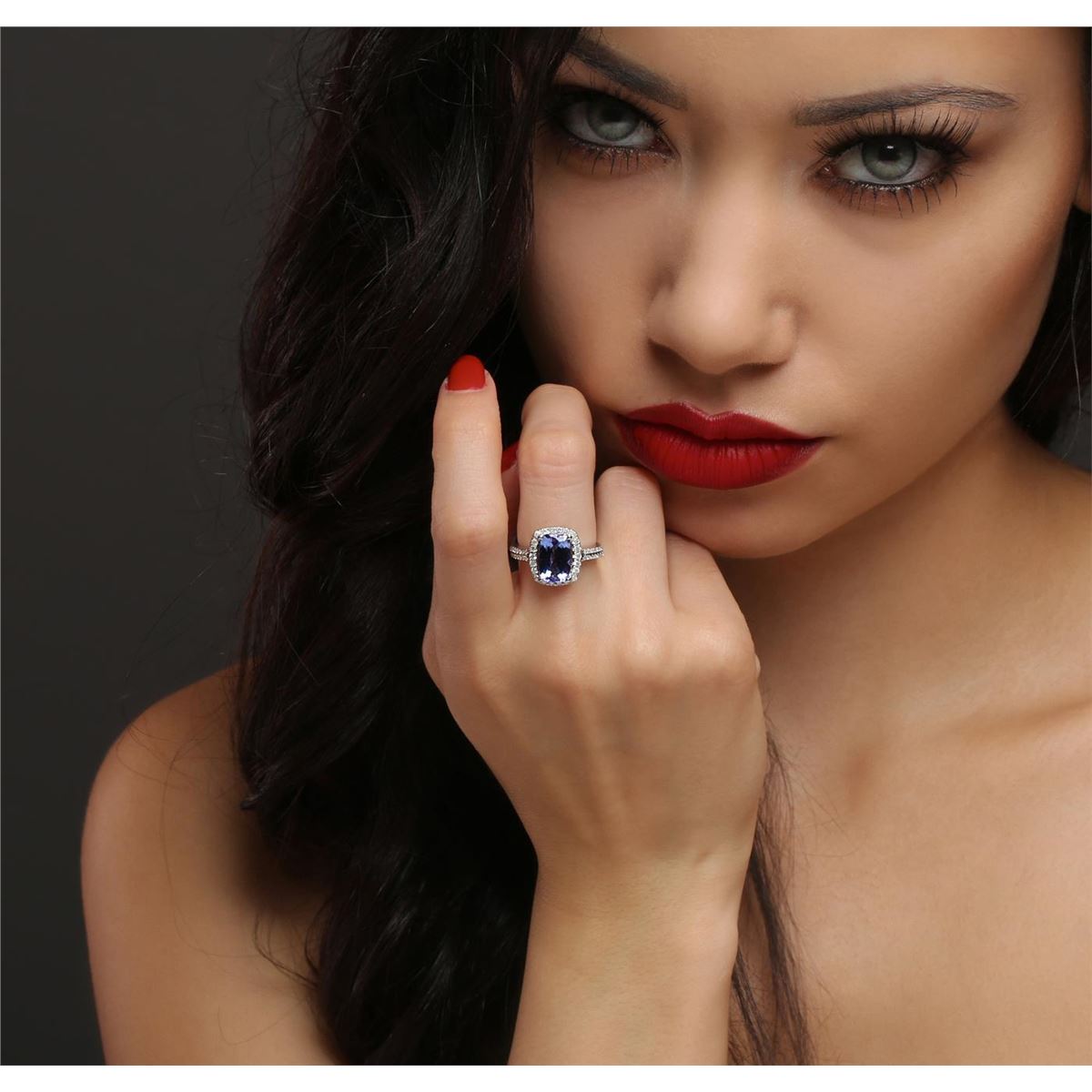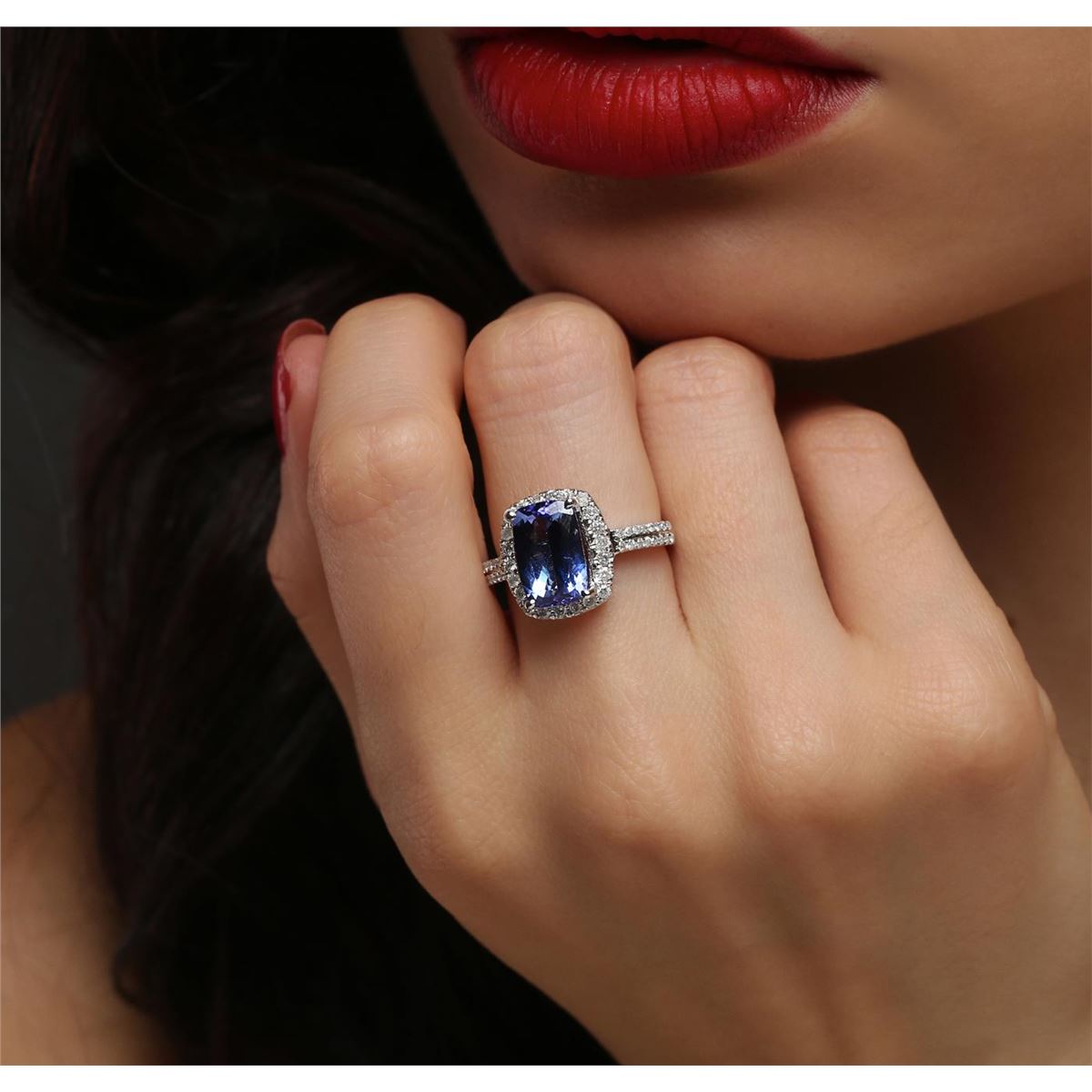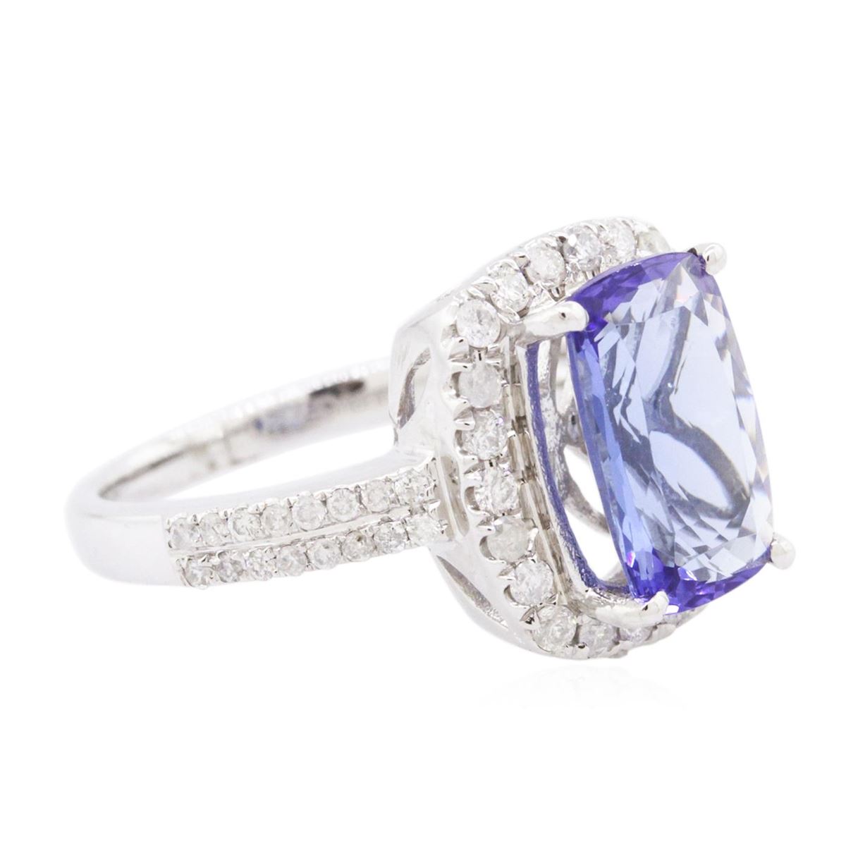 One electronically tested 14KT white gold ladies combination cast & assembled tanzanite and diamond ring with a flat shank with a bright polish finish. Identified with markings of "14K". Condition is new. Containing: One prong set rectangular cushion modified brilliant cut natural tanzanite, measuring 11.00 x 7.07 x 4.60mm, approximate weight of 2.82ct., clarity is eye clean, type I, medium, moderately strong, violet color, (GIA V 5/4), cut is good. Fifty-Four prong set round brilliant cut diamonds, measuring 1.30 - 1.20 x 0.75mm (depth est.) approximate total weight of 54 Stones = 0.38ct. Clarity: I-1 to I-2. Color: I - J, Cut is Good. Colored gemstones are presumed to have been subjected to commonly used enhancement processes. All diamonds and colored gemstones are graded in the mounting, unless otherwise stated. Total Weight of Colored Stones 2.82ct. Total Weight of Diamonds 0.38ct. Total Weight of Ring 4.80 grams. GGL Appraised at $6,300.00.
