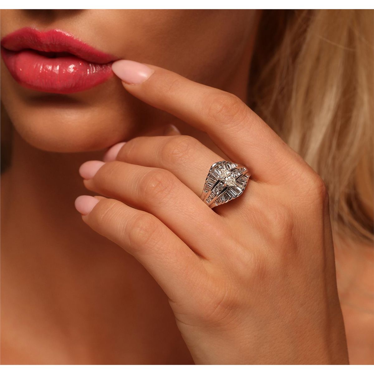 One electronically tested 14KT white gold Ladies combination cast & assembled engagement ring with a bright polish finish. Condition is new. Identified with markings of "14K". Containing: One prong set marquise shaped cut diamond, measuring 8.62 x 4.46 x 2.81mm (depth est.) approximate weight of 0.63ct. Clarity: SI-1. Color: K, Cut is Very Good. Eight channel set round brilliant cut diamonds, measuring 2.50 - 2.00 x 1.35mm (depth est.) approximate. Total Weight of 8 Stones = 0.33ct. Clarity: SI-2 to I-1. Color: K - L, Cut is Very Good. Twenty-Six channel set baguette cut diamonds, measuring from 1.50 x 1.50 x 1.28mm (depth est.) to 4.50 x 2.00 x 1.70mm (depth est.) approximate. Total Weight of 26 Stones = 1.86ct. Clarity: SI-2 to I-1. Color: J - K, Cut is Good. Total Weight of Diamonds 2.82ct. Total Weight of Ring 9.40 grams. GGL Appraised at $10,730.00.