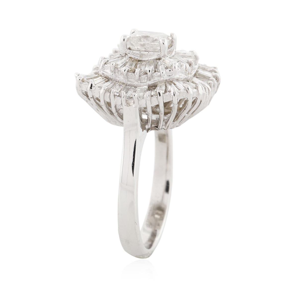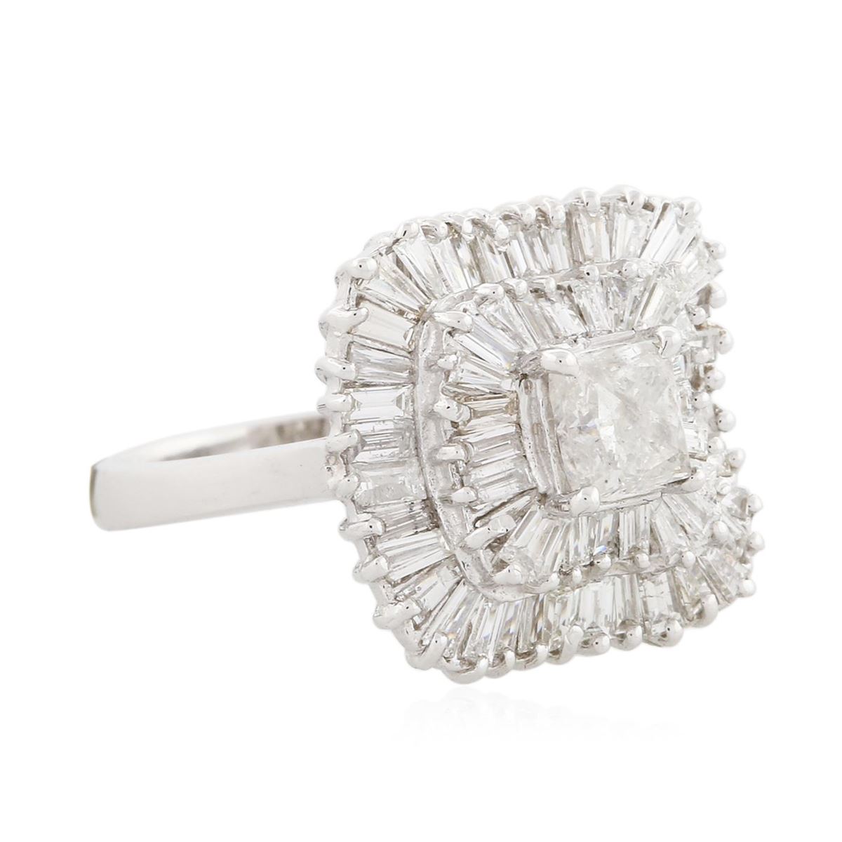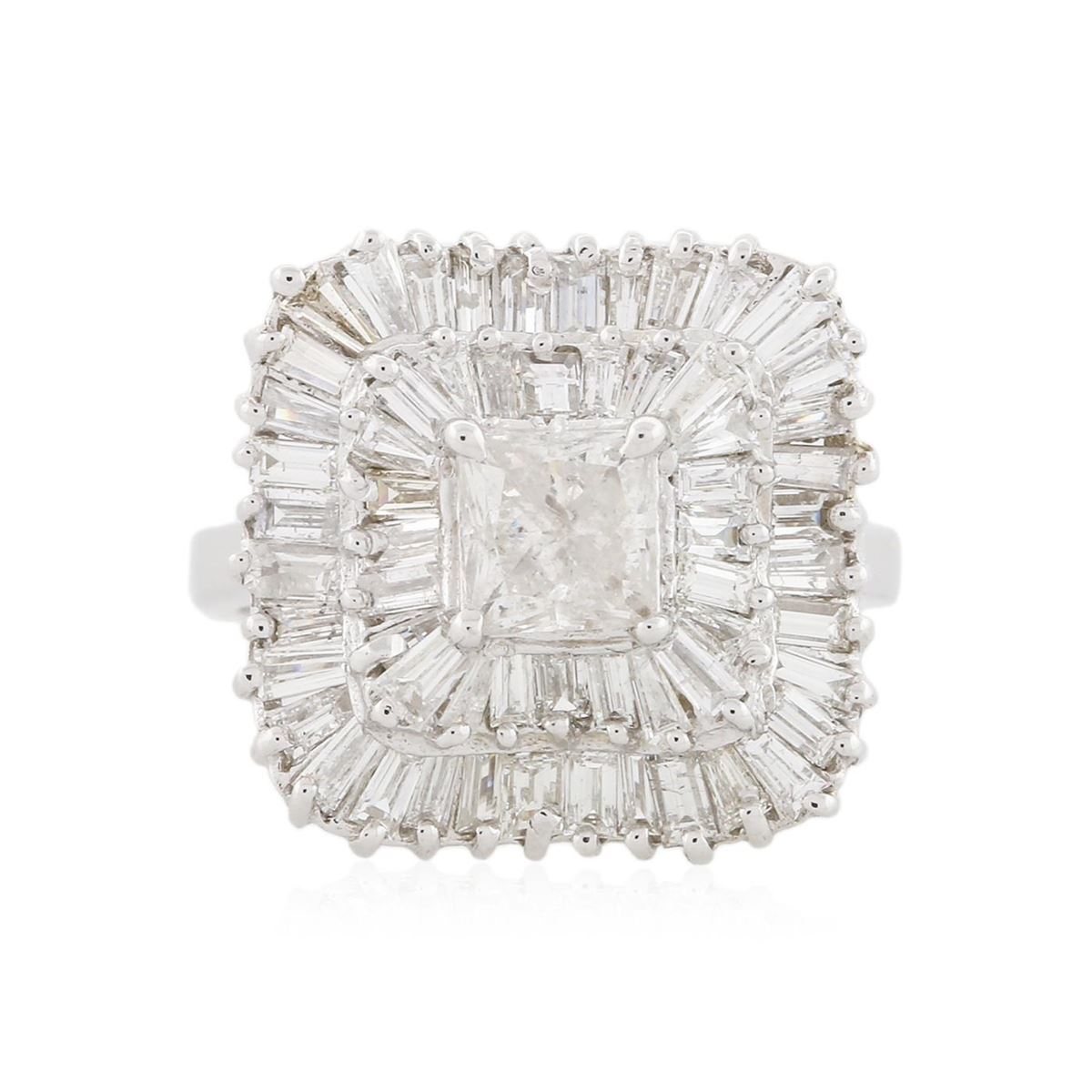 New Condition! One electronically tested 14KT white gold Ladies combination cast & assembled ballerina ring with a bright polish finish. Identified with markings of "14K". Condition is excellent. Containing: One prong set princess cut diamond, measuring 5.23 x 5.10 x 3.64mm (depth est.) approximate weight of 0.80ct. Clarity of I-2 to I-3, Color of G - H. Fifty prong set baguette cut diamonds, measuring 2.40 x 1.50 x 1.28mm (depth est.) approximate total weight of 50 Stones = 2.03ct. Clarity of VS-1 to VS-2, Color of F. Total Weight of Diamonds 2.83 ct. Total Weight of Ring 6.50 gm. GGL Appraised at $11,025.00.