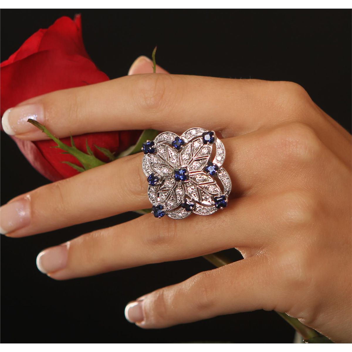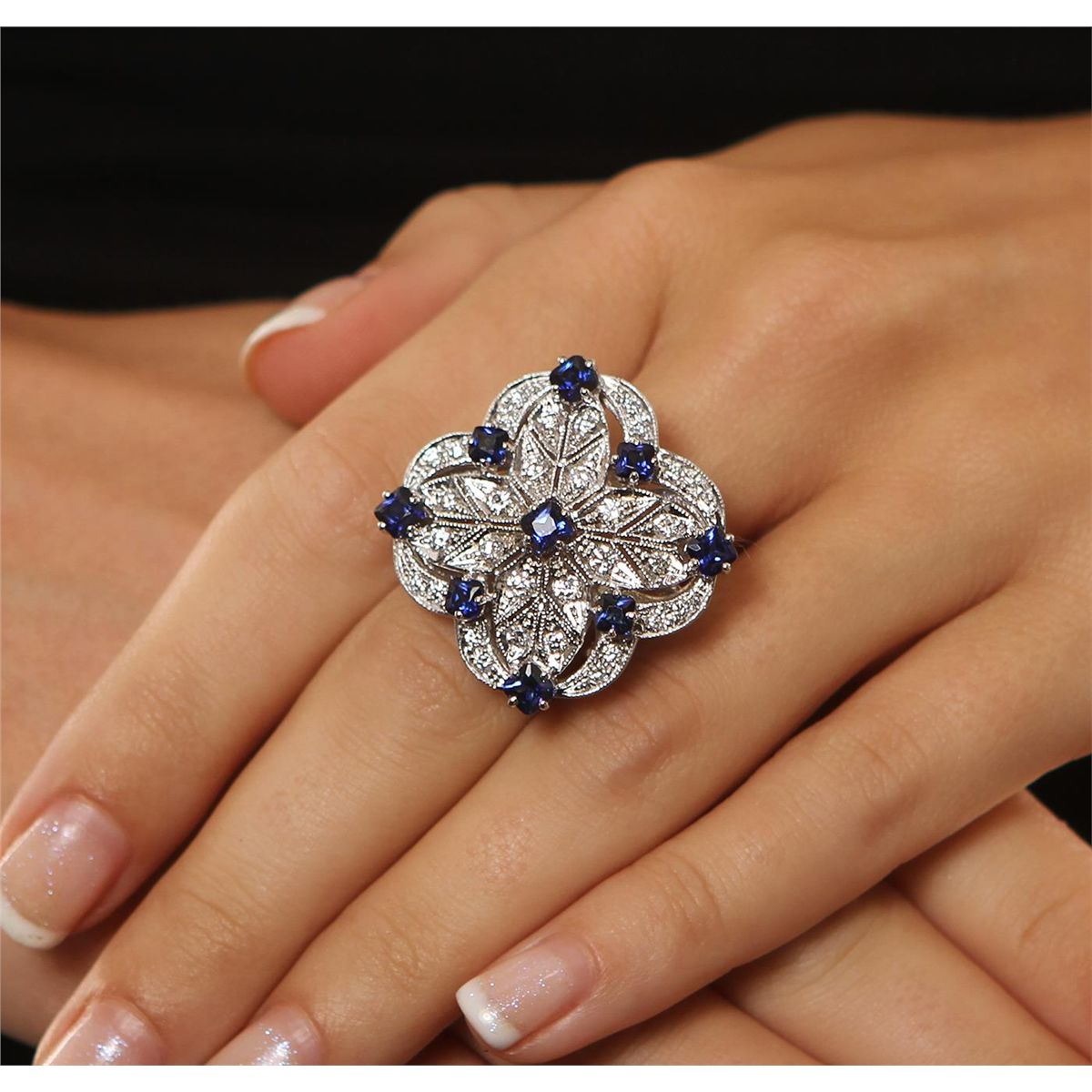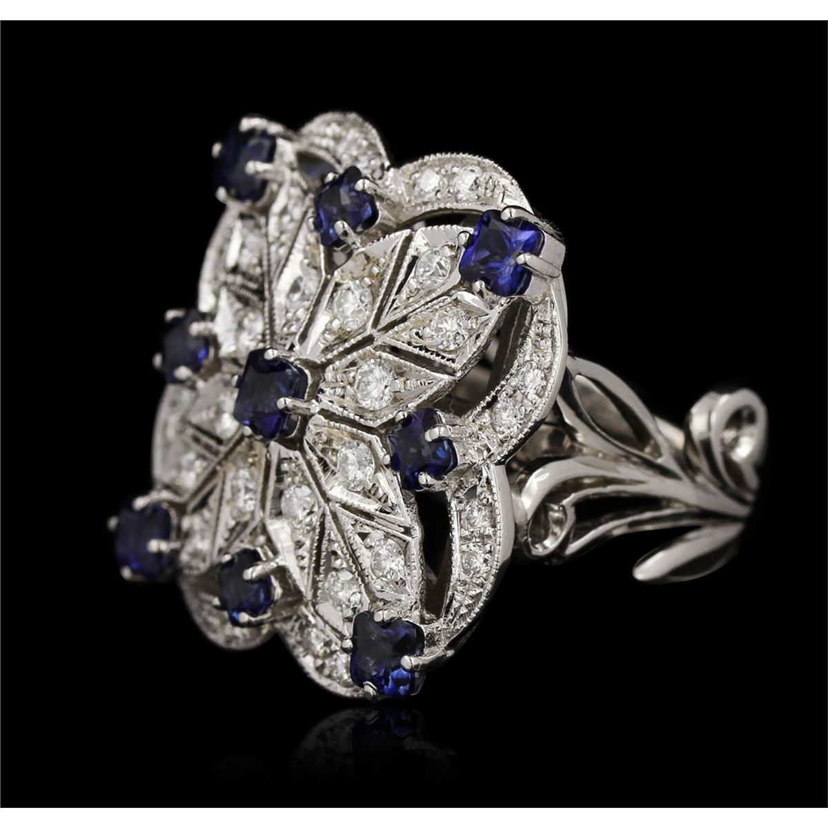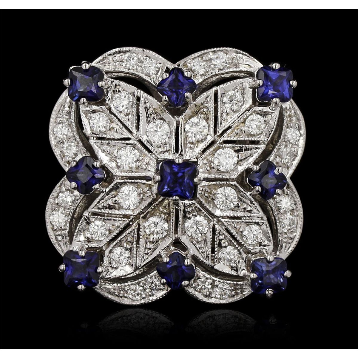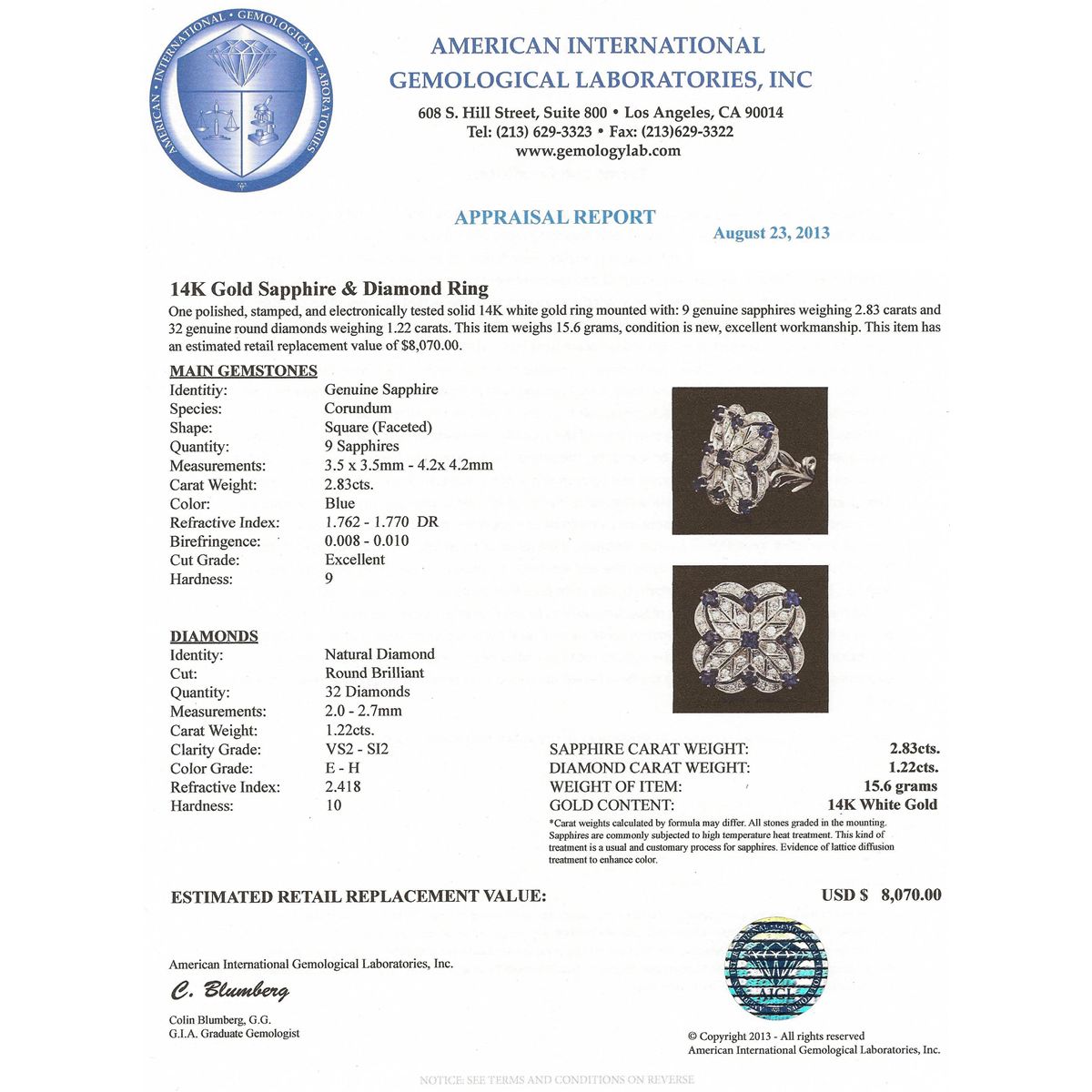 One polished, stamped, and electronically tested solid 14KT White Gold ring mounted with: 9 genuine sapphires weighing 2.83 carats and 32 genuine round diamonds weighing 1.22 carats. This item weighs 15.6 grams, condition is new, excellent workmanship. AIGL Appraised at $8,070.00.