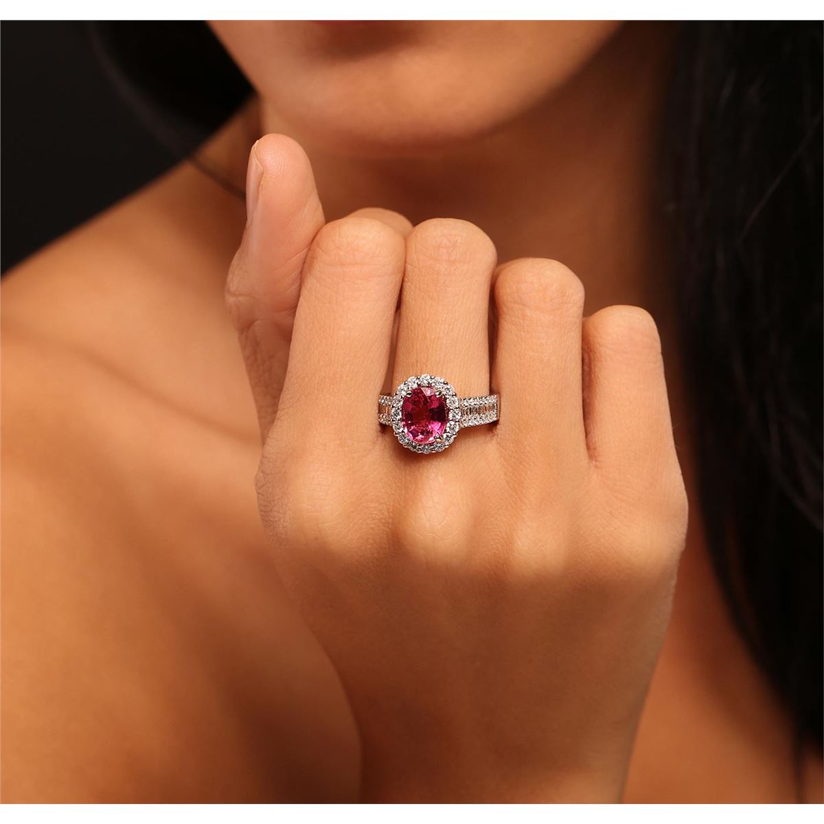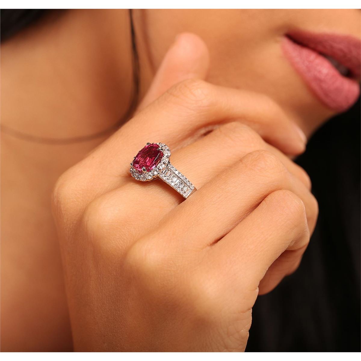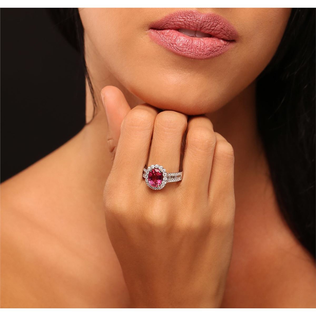 One electronically tested 14KT white gold Ladies combination cast & assembled ring with a bright polish finish. Condition is new. Identified with markings of "14K". Containing: Thirty-Two prong set round brilliant cut diamonds, measuring 1.00 - 1.00 x 0.60mm (depth est.) approximate. Total Weight of 32 Stones = 0.12ct. Clarity: I-1 to I-2. Color: H, Cut is Good. Sixteen prong set round brilliant cut diamonds, measuring 2.00 - 2.00 x 1.20mm (depth est.) approximate. Total Weight of 16 Stones = 0.68ct. Clarity: I-1 to I-2. Color: I - J, Cut is Good. Eighteen channel set baguette cut diamonds, measuring 1.80 x 1.30 x 1.11mm (depth est.) approximate. Total Weight of 18 Stones = 0.48ct. Clarity: SI-1 to SI-2. Color: J - K, Cut is Good. One prong set oval modified brilliant cut natural pink tourmaline, measuring 10.00 x 8.00 x 5.20mm, approximate weight of 2.84ct., clarity is eye clean, type II, medium, moderately strong, reddish purple color, (GIA rP 5/4), cut is very good. Colored gemstones are presumed to have been subjected to commonly used color/clarity enhancement processes. Total Weight of Colored Stones 2.84ct. Total Weight of Diamonds 1.27ct. Total Weight of Ring 5.80 grams. GGL Appraised at $7,920.00.