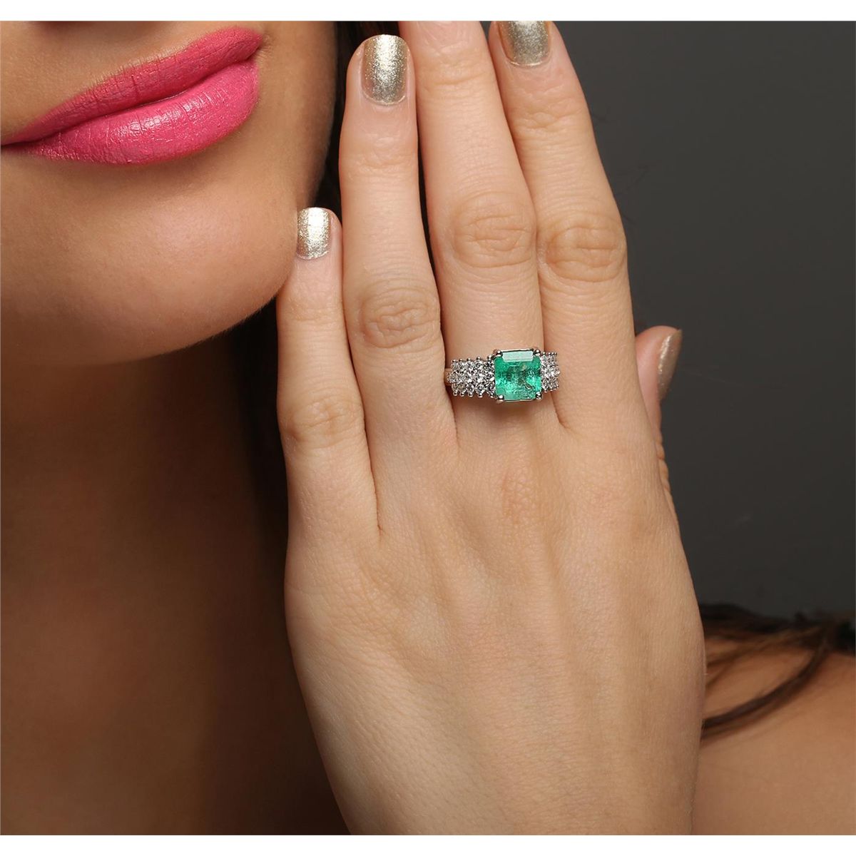 One electronically tested 14KT white gold ladies cast emerald and diamond ring with a bright polish finish. The featured emerald is supported by diamond set shoulders, completed by a two millimeter wide band. Identified with markings of "14K". Condition is new, good workmanship. Containing: One prong set rectangular step cut natural emerald, measuring 8.35 x 8.10 x 4.85mm, 6% bulge factor, approximate weight of 2.84ct., clarity is heavily included, type III, medium, very slightly grayish, very slightly bluish green color, (GIA vslbG 5/3), cut is good. Transmitting light with a minimum of distortion, transparent. Naturally occurring internal & external characteristics are present. Indications of oil residue. Graded in the setting. Thirty prong set round brilliant cut diamonds, measuring 1.90 - 1.80 x 1.11mm (depth est.) approximate total weight of 30 Stones = 0.78ct. Graded in the setting. Clarity: SI-2 to I-1. Color: G - I. Total Weight of Colored Stones 2.84ct. Total Weight of Diamonds 0.78ct. Total Weight of Ring 5.33 grams. AIG Appraised at $7,285.00.