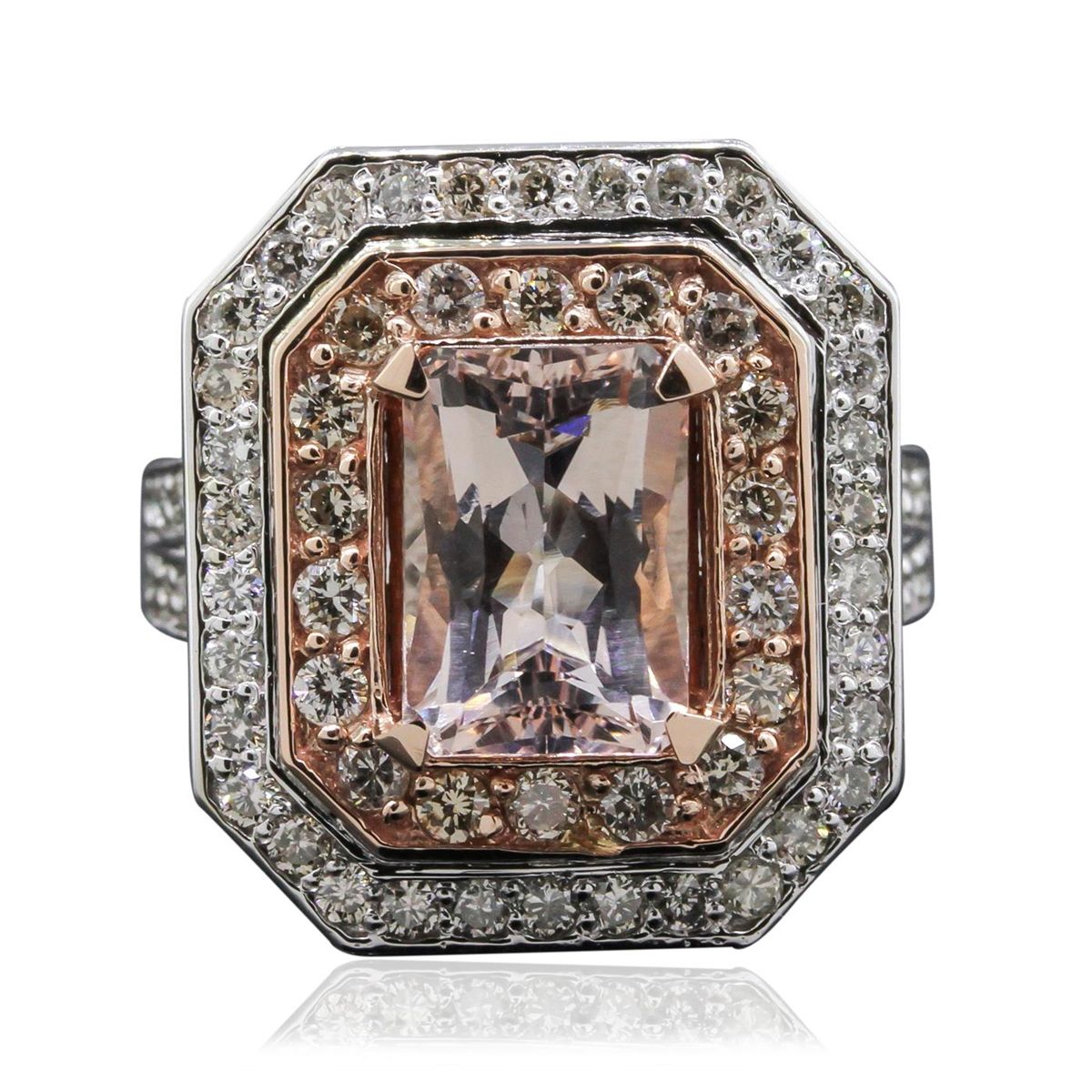 One electronically tested 14KT white gold ladies cast morganite and diamond ring. Condition is new, good workmanship. The featured morganite is set within tiered diamond bezels supported by diamond set split shoulders, completed by a three and one-half millimeter wide band. Bright polish finish with rose gold accents. Identified with markings of "14K". Containing: One prong set rectangular mixed cut natural morganite, measuring 9.65 x 6.68 x 5.00mm, 8%. bulge factor, approximate weight of 2.84ct., clarity is eye clean, type I, light, very slightly brownish, orangy red color, (GIA oR 3/3), cut is good. Transmitting light with no distortion, transparent. Graded in the setting. Eighteen bead set round brilliant cut diamonds, measuring 1.90 - 1.80 x 1.11mm (depth est.) approximate. Total Weight of 18 Stones = 0.51ct. Color grade is an average for the group. Graded in the setting. Clarity: SI-1 to I-1 Fifty-Four bead set round brilliant cut diamonds, measuring 1.90 - 1.80 x 1.11mm (depth est.) approximate. Total Weight of 54 Stones = 1.34ct. Graded in the setting. Clarity: SI-1 to I-1. Color: H - J. Total Weight of Colored Stones 2.84ct. Total Weight of Diamonds 1.85ct. Total Weight of Ring 11.24 grams. AIG Appraised at $9,035.00.