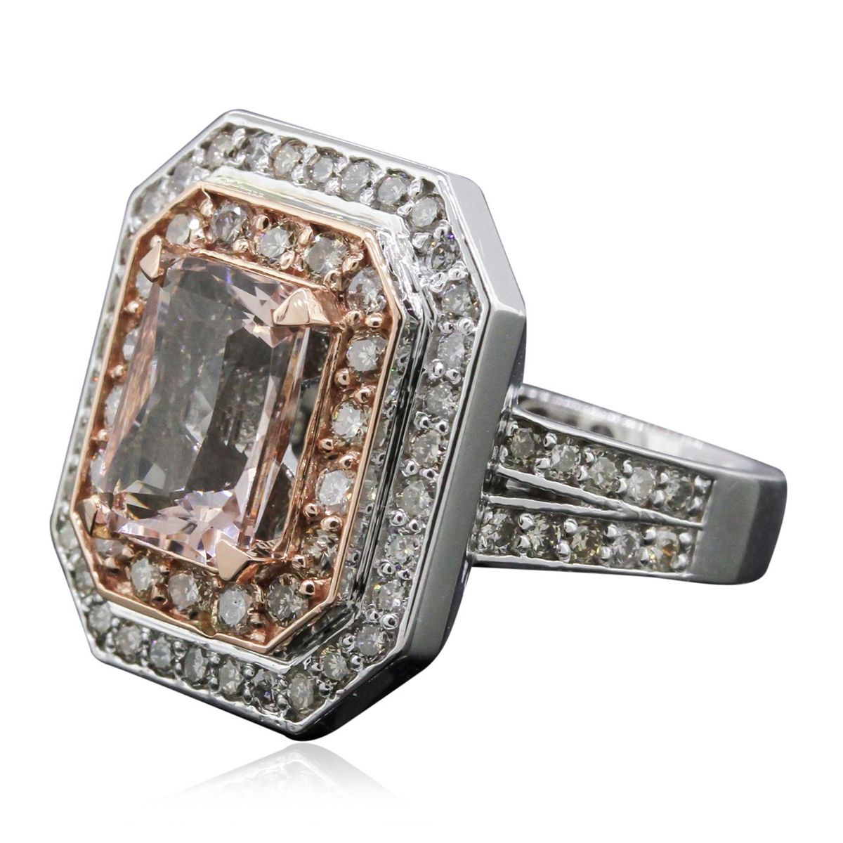 One electronically tested 14KT white gold ladies cast morganite and diamond ring. Condition is new, good workmanship. The featured morganite is set within tiered diamond bezels supported by diamond set split shoulders, completed by a three and one-half millimeter wide band. Bright polish finish with rose gold accents. Identified with markings of "14K". Containing: One prong set rectangular mixed cut natural morganite, measuring 9.65 x 6.68 x 5.00mm, 8%. bulge factor, approximate weight of 2.84ct., clarity is eye clean, type I, light, very slightly brownish, orangy red color, (GIA oR 3/3), cut is good. Transmitting light with no distortion, transparent. Graded in the setting. Eighteen bead set round brilliant cut diamonds, measuring 1.90 - 1.80 x 1.11mm (depth est.) approximate. Total Weight of 18 Stones = 0.51ct. Color grade is an average for the group. Graded in the setting. Clarity: SI-1 to I-1 Fifty-Four bead set round brilliant cut diamonds, measuring 1.90 - 1.80 x 1.11mm (depth est.) approximate. Total Weight of 54 Stones = 1.34ct. Graded in the setting. Clarity: SI-1 to I-1. Color: H - J. Total Weight of Colored Stones 2.84ct. Total Weight of Diamonds 1.85ct. Total Weight of Ring 11.24 grams. AIG Appraised at $9,035.00.