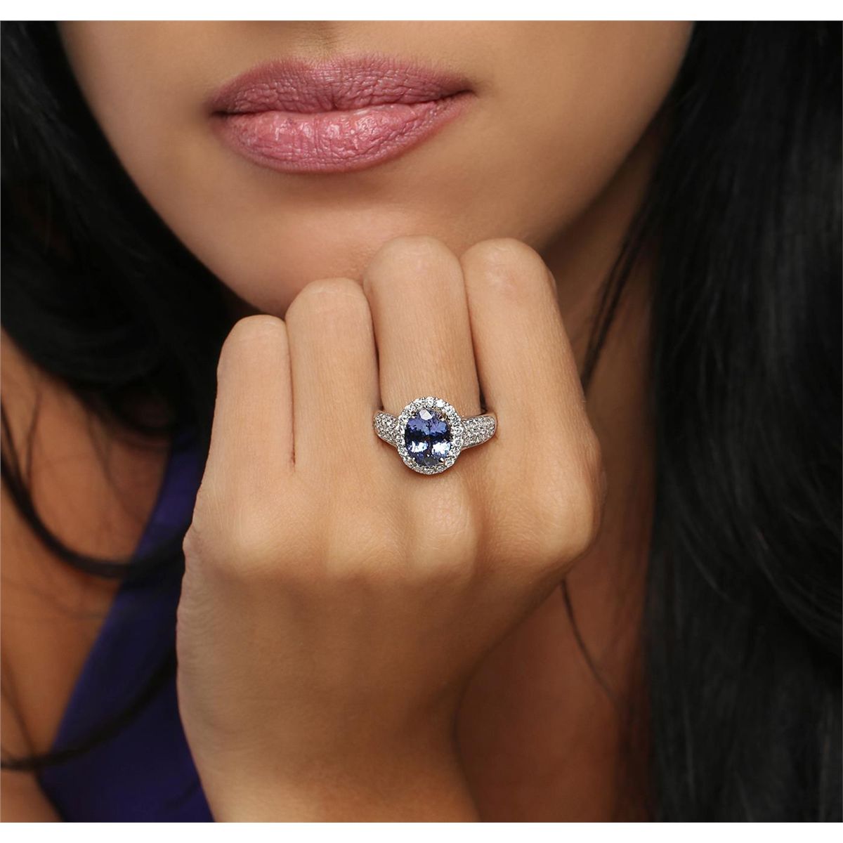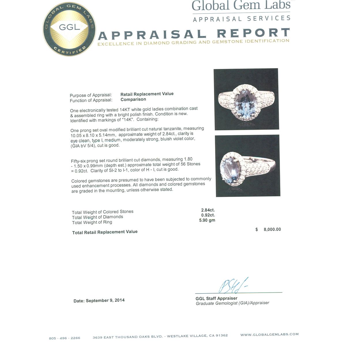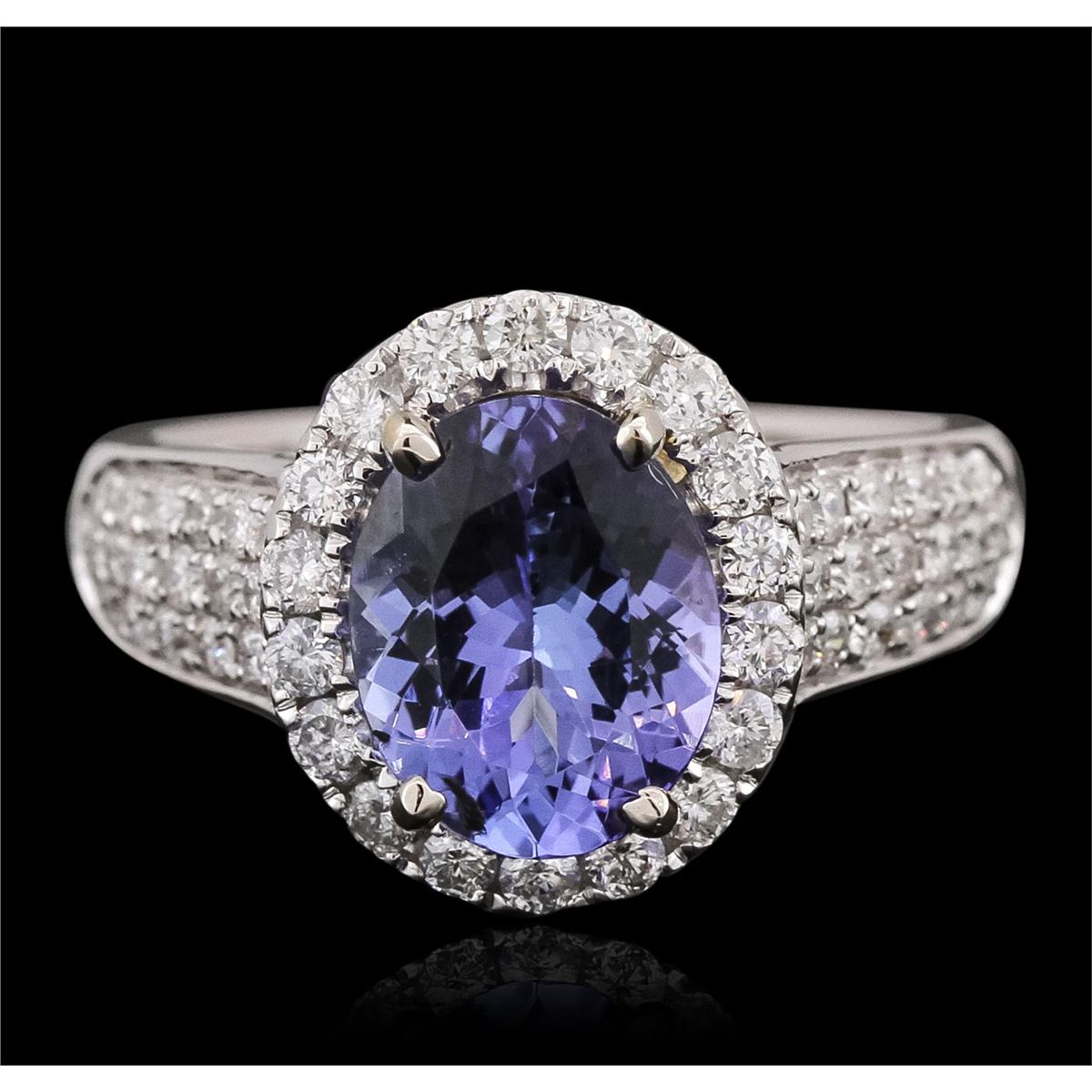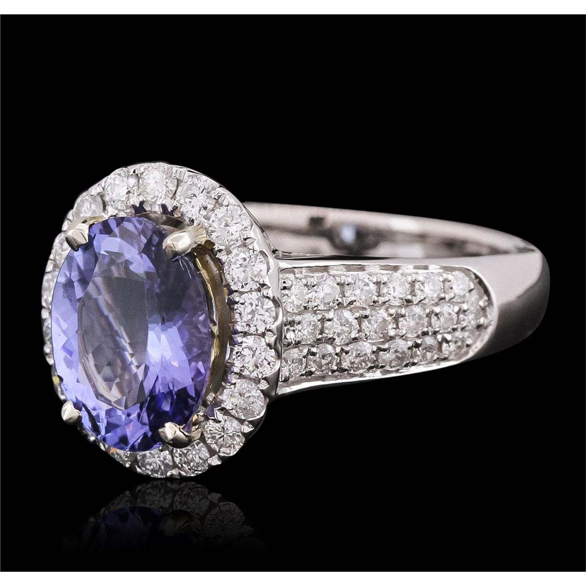 One electronically tested 14KT white gold ladies combination cast & assembled ring with a bright polish finish. Identified with markings of "14K". Condition is new. Containing: One prong set oval modified brilliant cut natural tanzanite, measuring 10.05 x 8.10 x 5.14mm, approximate weight of 2.84ct., clarity is eye clean, type I, medium, moderately strong, bluish violet color, (GIA bV 5/4), cut is good. Fifty-Six prong set round brilliant cut diamonds, measuring 1.80 - 1.50 x 0.99mm (depth est.) approximate total weight of 56 Stones = 0.92ct. Clarity: SI-2 to I-1. Color: H - I, Cut is Good. Colored gemstones are presumed to have been subjected to commonly used enhancement processes. All diamonds and colored gemstones are graded in the mounting, unless otherwise stated. Total Weight of Colored Stones 2.84ct. Total Weight of Diamonds 0.92ct. Total Weight of Ring 5.90 grams. GGL Appraised at $8,000.00.