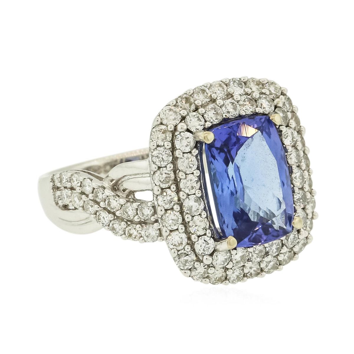 One electronically tested 14KT white gold ladies combination cast & assembled tanzanite and diamond ring with a flat shank with a bright polish finish. Identified with markings of "14K". Condition is new. Containing: One prong set rectangular cushion modified brilliant cut natural tanzanite, measuring 10.21 x 7.53 x 4.70mm, approximate weight of 2.84ct., clarity is eye clean, type I, medium, moderately strong, violet color, (GIA V 5/4), cut is good. Seventy-One prong set round brilliant cut diamonds, measuring 1.40 - 1.40 x 0.84mm (depth est.) approximate total weight of 71 Stones = 0.71ct. Clarity: I-1 to I-2. Color: I - J, Cut is Good. Colored gemstones are presumed to have been subjected to commonly used enhancement processes. All diamonds and colored gemstones are graded in the mounting, unless otherwise stated. Total Weight of Colored Stones 2.84ct. Total Weight of Diamonds 0.71ct. Total Weight of Ring 6.50 grams. GGL Appraised at $7,245.00.