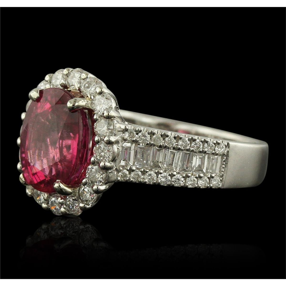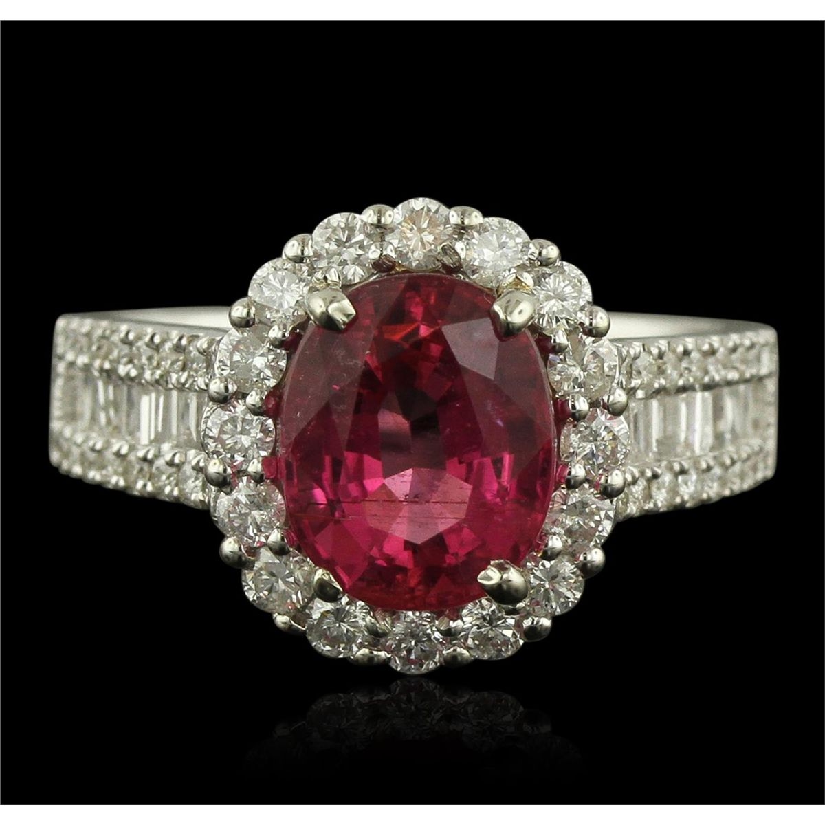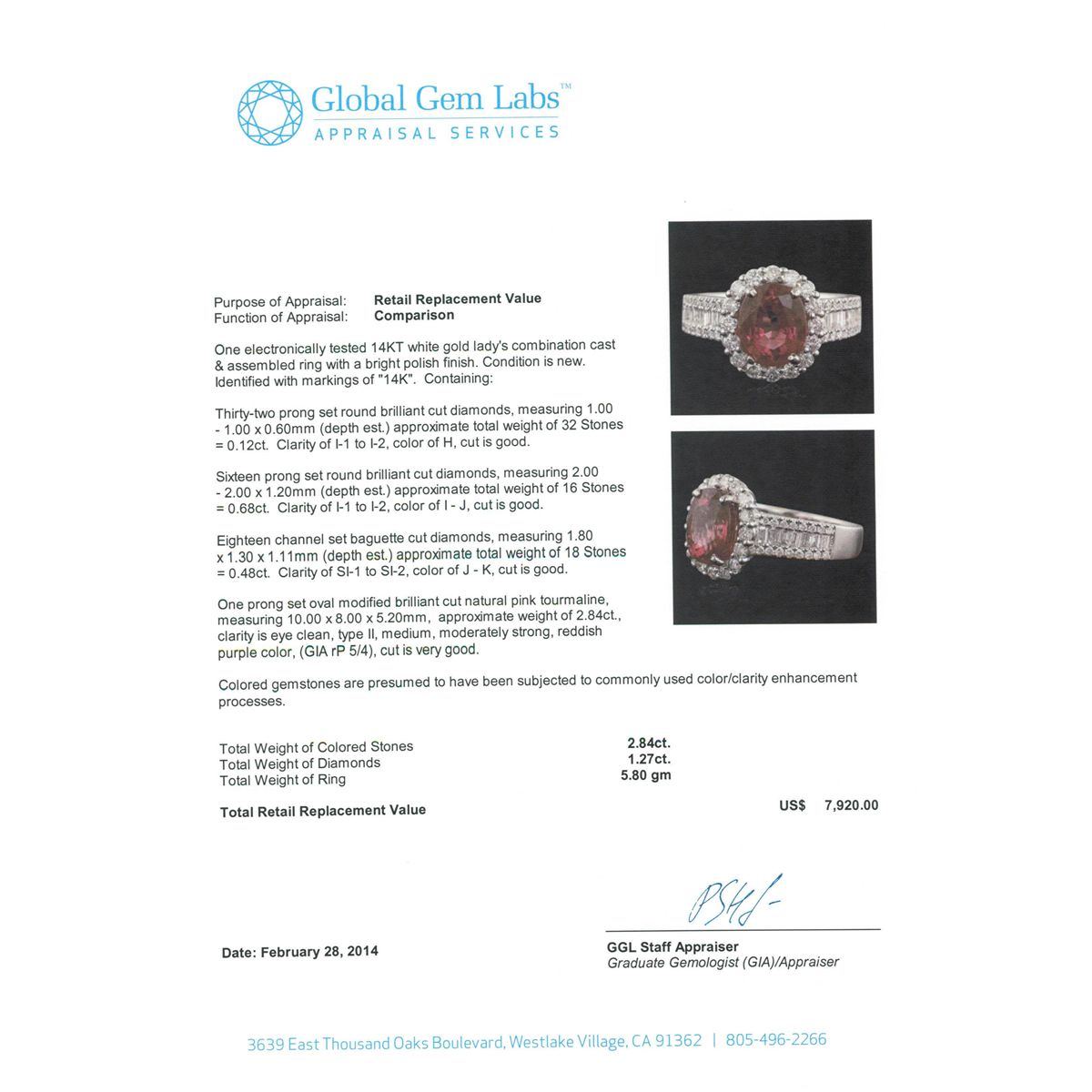One electronically tested 14KT white gold Ladies combination cast & assembled ring with a bright polish finish. Condition is new. Identified with markings of "14K". Containing: Thirty-Two prong set round brilliant cut diamonds, measuring 1.00 - 1.00 x 0.60mm (depth est.) approximate. Total Weight of 32 Stones = 0.12ct. Clarity: I-1 to I-2. Color: H, Cut is Good. Sixteen prong set round brilliant cut diamonds, measuring 2.00 - 2.00 x 1.20mm (depth est.) approximate. Total Weight of 16 Stones = 0.68ct. Clarity: I-1 to I-2. Color: I - J, Cut is Good. Eighteen channel set baguette cut diamonds, measuring 1.80 x 1.30 x 1.11mm (depth est.) approximate. Total Weight of 18 Stones = 0.48ct. Clarity: SI-1 to SI-2. Color: J - K, Cut is Good. One prong set oval modified brilliant cut natural pink tourmaline, measuring 10.00 x 8.00 x 5.20mm, approximate weight of 2.84ct., clarity is eye clean, type II, medium, moderately strong, reddish purple color, (GIA rP 5/4), cut is very good. Colored gemstones are presumed to have been subjected to commonly used color/clarity enhancement processes. Total Weight of Colored Stones 2.84ct. Total Weight of Diamonds 1.27ct. Total Weight of Ring 5.80 grams. GGL Appraised at $7,920.00.