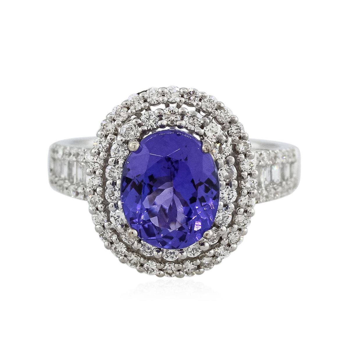 One electronically tested 14KT white gold Ladies combination cast & assembled ring with a bright polish finish. Condition is new. Identified with markings of "14K". Containing: One prong set oval modified mixed cut natural tanzanite, measuring 10.00 x 8.00 x 5.00mm, approximate weight of 2.86ct., clarity is eye clean, type I, medium, moderately strong, bluish violet color, (GIA bV 5/4), cut is very good. Colored gemstones are presumed to have been subjected to commonly used color/clarity enhancement processes. Seventy-Nine prong set round brilliant cut diamonds, measuring 1.40 - 1.10 x 0.75mm (depth est.) approximate. Total Weight of 79 Stones = 0.80ct. Clarity: I-1 to I-2. Color: H - I, Cut is Good. Fourteen channel set baguette cut diamonds, measuring from 1.50 x 1.30 x 1.11mm (depth est.) to 2.50 x 1.50 x 1.28mm (depth est.) approximate. Total Weight of 14 Stones = 0.45ct. Clarity: VS-2. Color: I - J, Cut is Good. Total Weight of Colored Stones 2.86ct. Total Weight of Diamonds 1.25ct. Total Weight of Ring 5.90 grams. GGL Appraised at $6,940.00.