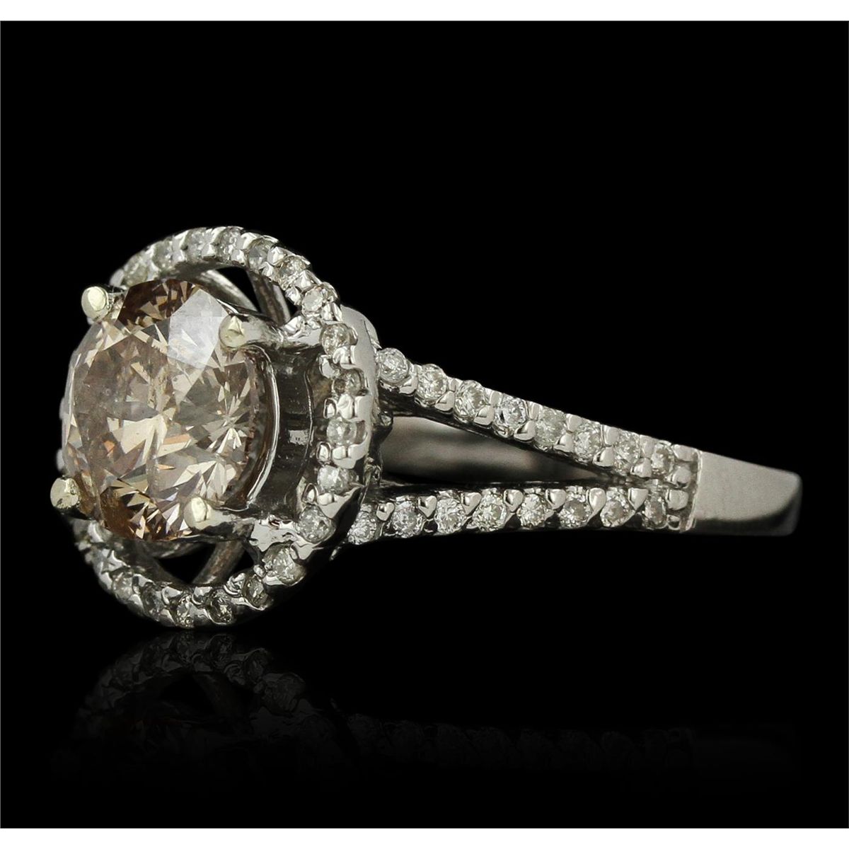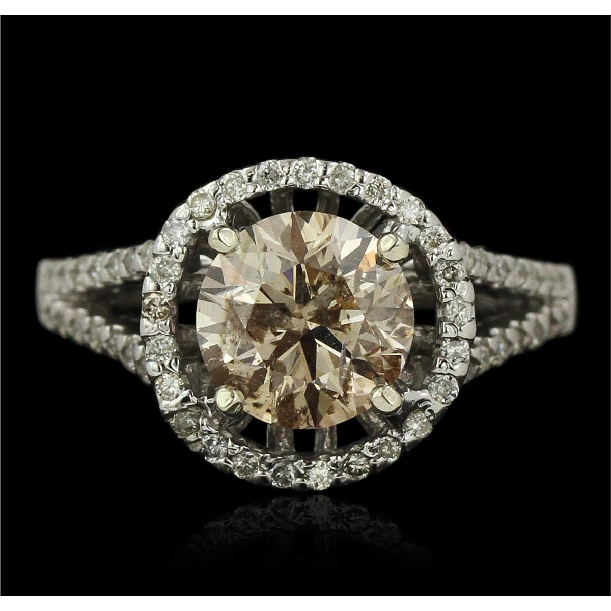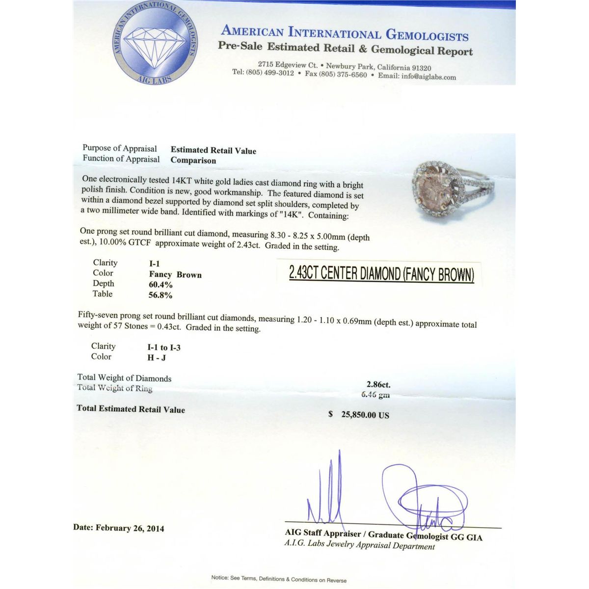 One electronically tested 14KT white gold ladies cast diamond ring with a bright polish finish. Condition is new, good workmanship. The featured diamond is set within a diamond bezel supported by diamond set split shoulders, completed by a two millimeter wide band. Identified with markings of "14K". Containing: One prong set round brilliant cut diamond, measuring 8.30 - 8.25 x 5.00mm (depth est.), 10.00% GTCF approximate weight of 2.43ct. Graded in the setting. 2.43ct center diamond (fancy brown). Clarity I-1. Color Fancy Brown. Depth 60.4%. Table 56.8%. Fifty-seven prong set round brilliant cut diamonds, measuring 1.20 - 1.10 x 0.69mm (depth est.) approximate total weight of 57 Stones = 0.43ct. Graded in the setting. Clarity I-1 to I-3. Color H-J. Total Weight of Diamonds 2.86ct. Total Weight of Ring 6.46 grams. AIG Appraised at $25,850.00.