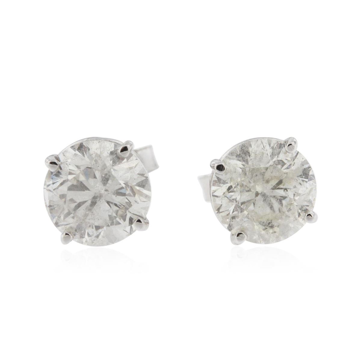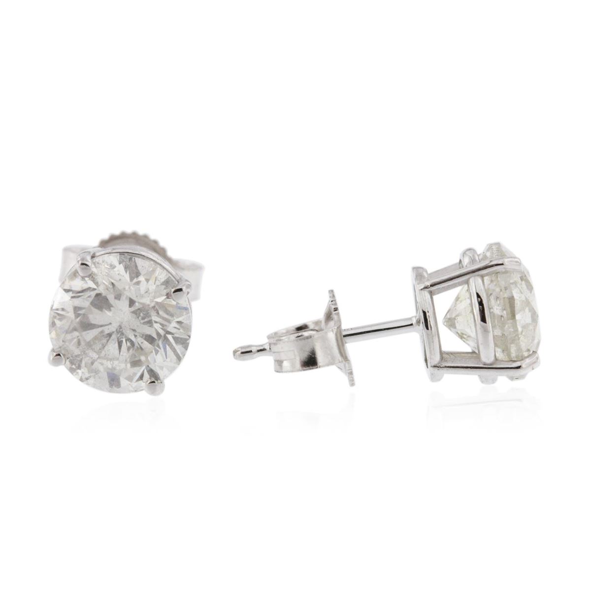 One electronically tested 14KT white gold Ladies cast stud earrings with friction posts with a bright polish finish. Condition is new. Identified with markings of "14K". Containing: One prong set round brilliant cut diamond, measuring 7.05 - 7.05 x 4.89mm (depth est.) approximate weight of 1.50ct. Clarity: I-2. Color: I, Cut is Fair. One prong set round brilliant cut diamond, measuring 6.98 - 6.83 x 4.70mm (depth est.) approximate weight of 1.37ct. Clarity: I-3. Color: J, Cut is Fair. Total Weight of Diamonds 2.87ct. Total Weight of Earrings 1.60 grams. GGL Appraised at $21,810.00.