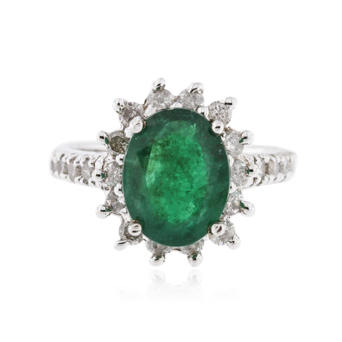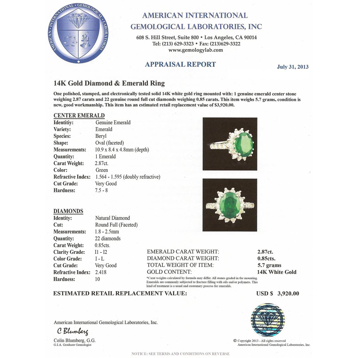 One polished, stamped, and electronically tested solid 14KT White Gold ring mounted with: 1 genuine emerald center stone weighing 2.87 carats and 22 genuine round full cut diamonds weighing 0.85 carats. This item weighs 5.7 grams, condition is new, good workmanship. AIGL Appraised at $3,920.00.