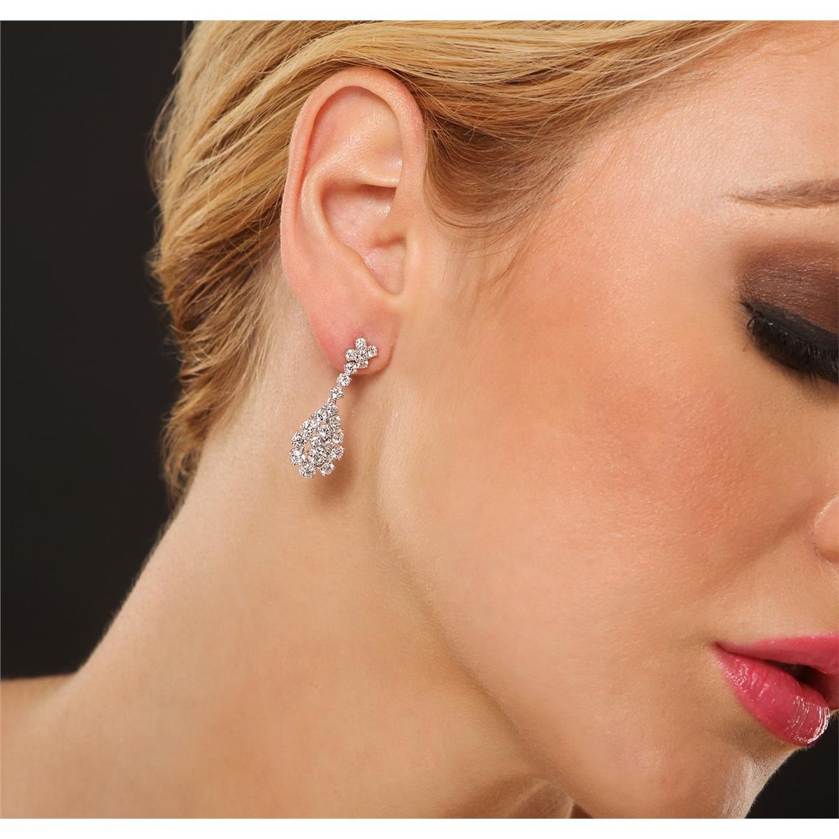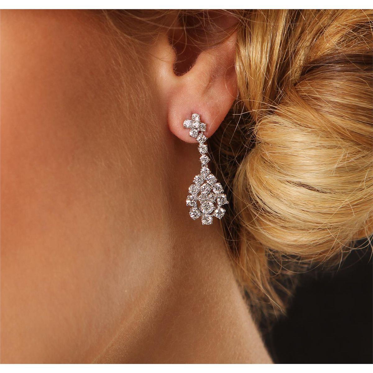 One pair electronically tested 14KT White Gold ladies cast & assembled diamond earrings with standard backs. Each earring features a diamond cluster drop, completed by a diamond floret. Bright polish finish. Identified with markings of "585". Condition is new, good workmanship. Containing: Forty-four prong set round brilliant cut diamonds, measuring 3.50mm to 1.80mm, approximate total weight of 44 stones = 2.87ct. Graded in the setting. Clarity VS-2 to I-1. Color G-I. Total weight of Diamonds 2.87ct. Total weight of Earrings 5.48gm. AIG Appraised at $9,730.00.