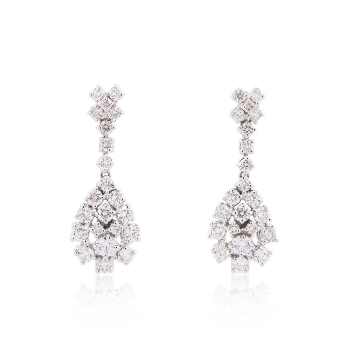 One pair electronically tested 14KT White Gold ladies cast & assembled diamond earrings with standard backs. Each earring features a diamond cluster drop, completed by a diamond floret. Bright polish finish. Identified with markings of "585". Condition is new, good workmanship. Containing: Forty-four prong set round brilliant cut diamonds, measuring 3.50mm to 1.80mm, approximate total weight of 44 stones = 2.87ct. Graded in the setting. Clarity VS-2 to I-1. Color G-I. Total weight of Diamonds 2.87ct. Total weight of Earrings 5.48gm. AIG Appraised at $9,730.00.