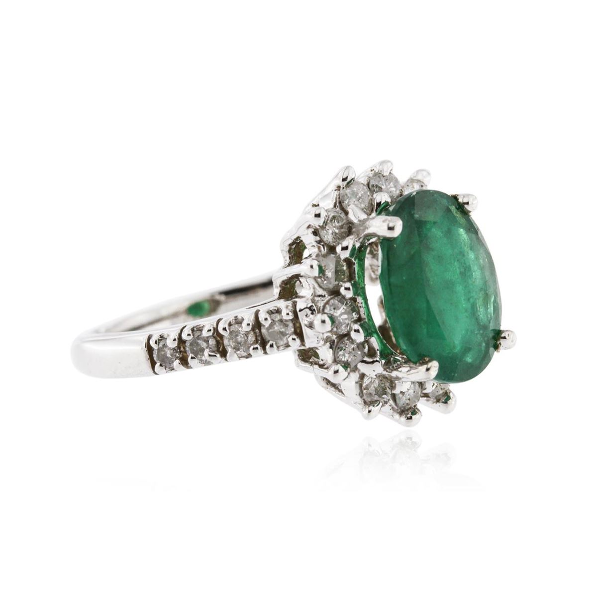One polished, stamped, and electronically tested solid 14KT White Gold ring mounted with: 1 genuine emerald center stone weighing 2.87 carats and 22 genuine round full cut diamonds weighing 0.85 carats. This item weighs 5.7 grams, condition is new, good workmanship. AIGL Appraised at $3,920.00.
