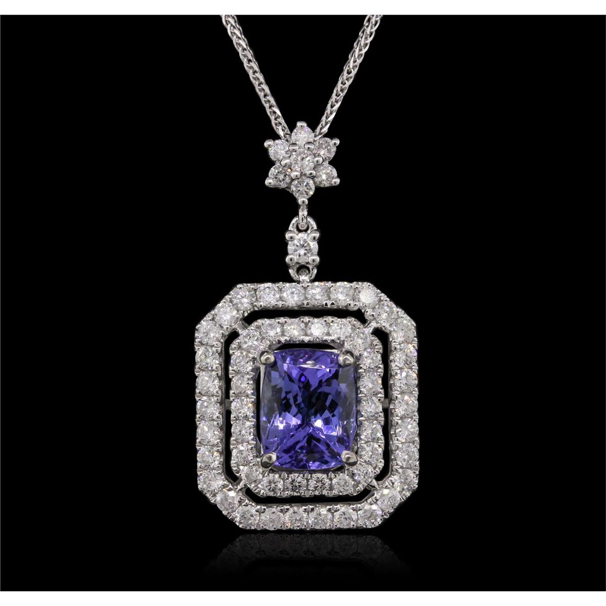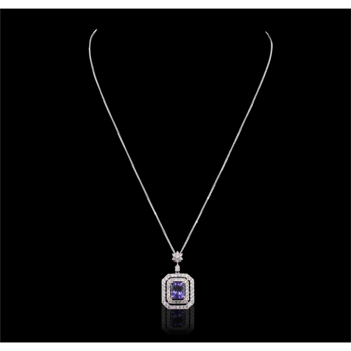 One electronically tested 14KT white gold Ladies combination cast & assembled pendant with a bright polish finish. Condition is new. Identified with markings of "14K". Containing: One prong set round brilliant cut diamond, measuring 2.20 - 2.20 x 1.32mm (depth est.) approximate weight of 0.04ct. Clarity: SI-1. Color: G, Cut is Very Good. Twenty-Eight prong set round brilliant cut diamonds, measuring 1.60 - 1.60 x 0.96mm (depth est.) approximate. Total Weight of 28 Stones = 0.55ct. Clarity: SI-2. Color: G - H, Cut is Good. Thirty-One prong set round brilliant cut diamonds, measuring 1.80 - 1.80 x 1.08mm (depth est.) approximate. Total Weight of 31 Stones = 0.93ct. Clarity: SI-1 to I-1. Color: G - H, Cut is Very Good. One prong set emerald modified step cut natural tanzanite, measuring 9.00 x 7.10 x 7.40mm, exact weight 2.87ct., clarity is eye clean, type I, medium light, very slightly grayish, bluish violet color, (GIA bV 4/3), cut is very good. Colored gemstones are presumed to have been subjected to commonly used color/clarity enhancement processes. Total Weight of Colored Stones 2.87ct. Total Weight of Diamonds 1.52ct. Total Weight of Pendant 6.80 grams. GGL Appraised at $6,730.00.