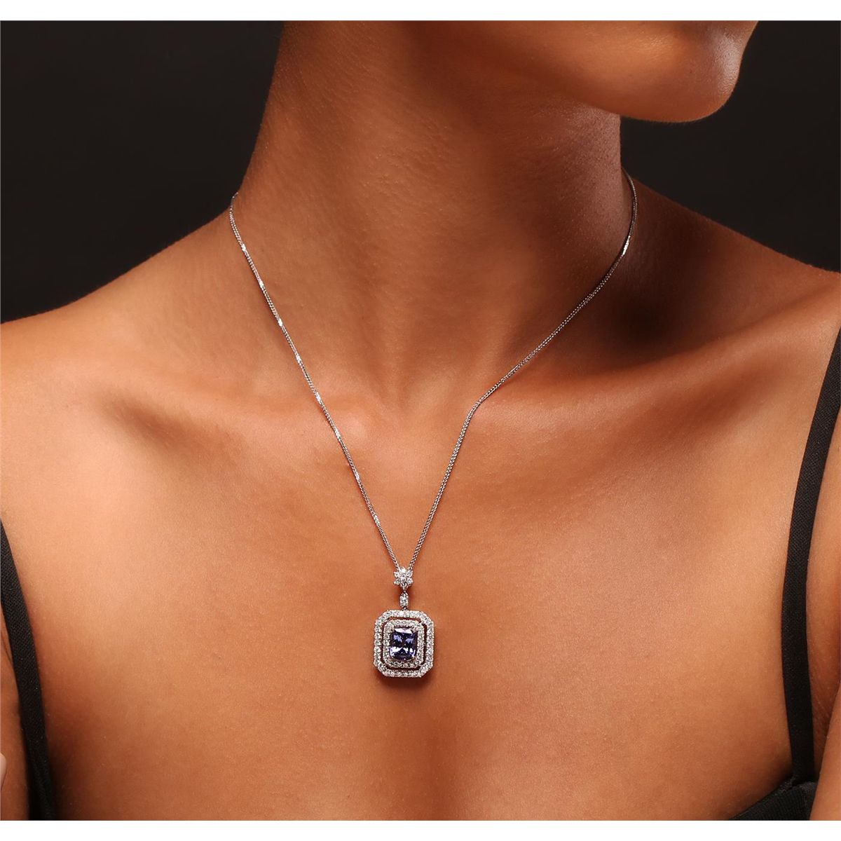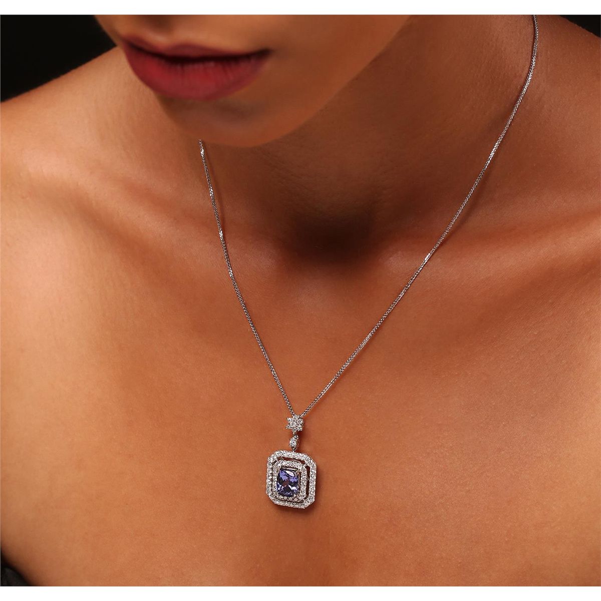 One electronically tested 14KT white gold Ladies combination cast & assembled pendant with a bright polish finish. Condition is new. Identified with markings of "14K". Containing: One prong set round brilliant cut diamond, measuring 2.20 - 2.20 x 1.32mm (depth est.) approximate weight of 0.04ct. Clarity: SI-1. Color: G, Cut is Very Good. Twenty-Eight prong set round brilliant cut diamonds, measuring 1.60 - 1.60 x 0.96mm (depth est.) approximate. Total Weight of 28 Stones = 0.55ct. Clarity: SI-2. Color: G - H, Cut is Good. Thirty-One prong set round brilliant cut diamonds, measuring 1.80 - 1.80 x 1.08mm (depth est.) approximate. Total Weight of 31 Stones = 0.93ct. Clarity: SI-1 to I-1. Color: G - H, Cut is Very Good. One prong set emerald modified step cut natural tanzanite, measuring 9.00 x 7.10 x 7.40mm, exact weight 2.87ct., clarity is eye clean, type I, medium light, very slightly grayish, bluish violet color, (GIA bV 4/3), cut is very good. Colored gemstones are presumed to have been subjected to commonly used color/clarity enhancement processes. Total Weight of Colored Stones 2.87ct. Total Weight of Diamonds 1.52ct. Total Weight of Pendant 6.80 grams. GGL Appraised at $6,730.00.