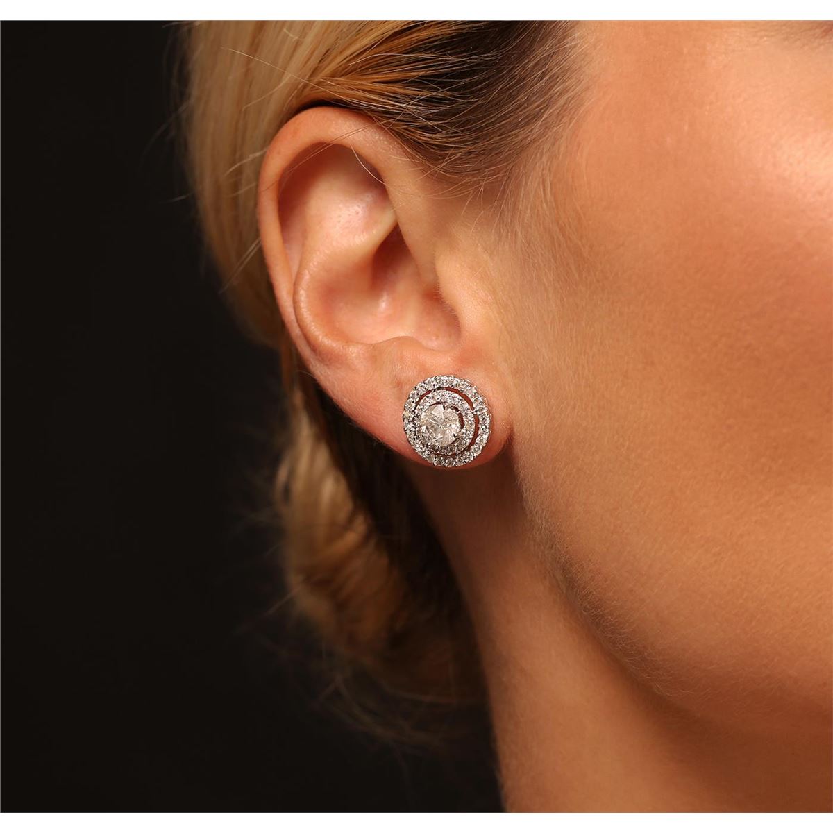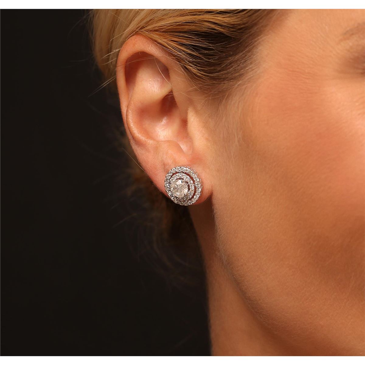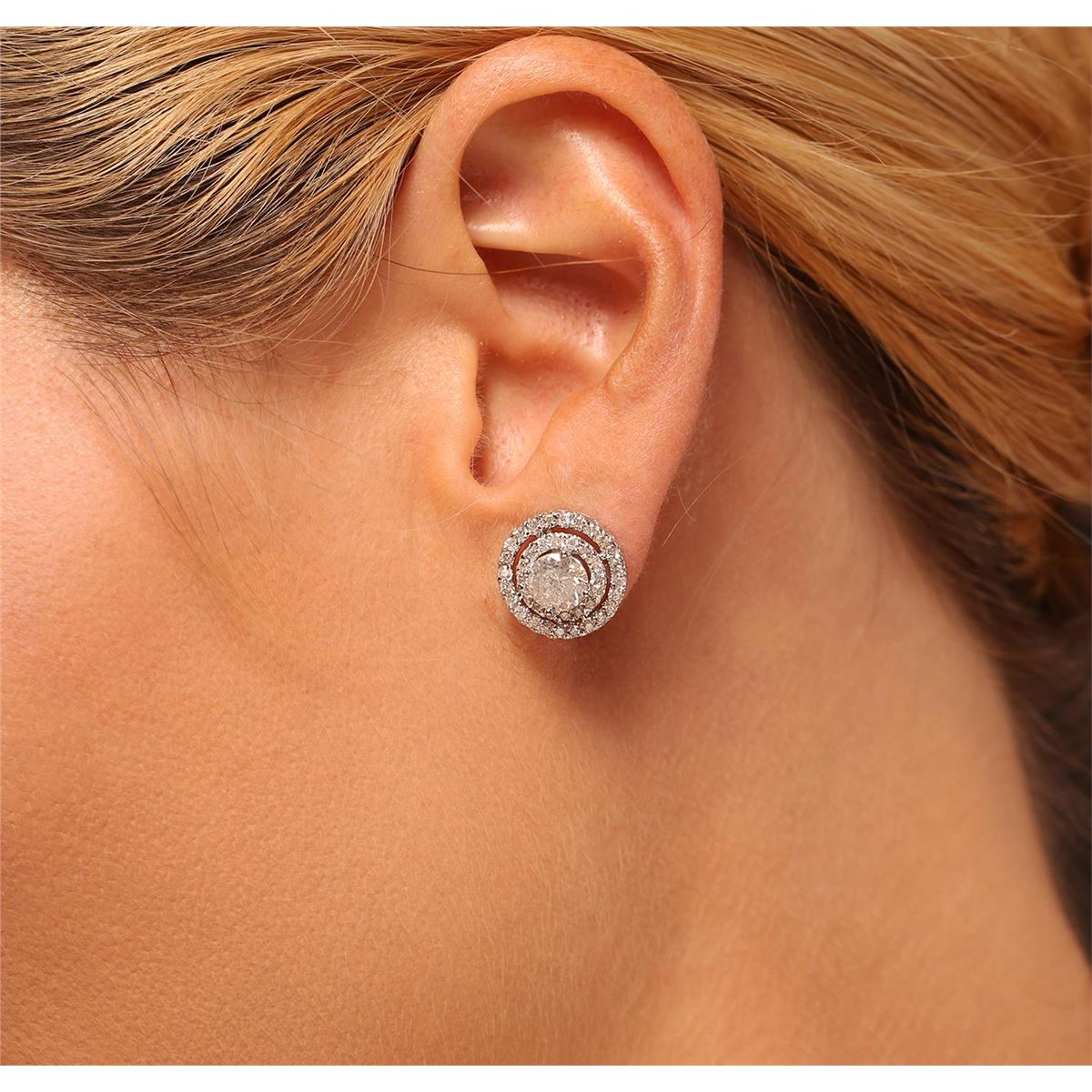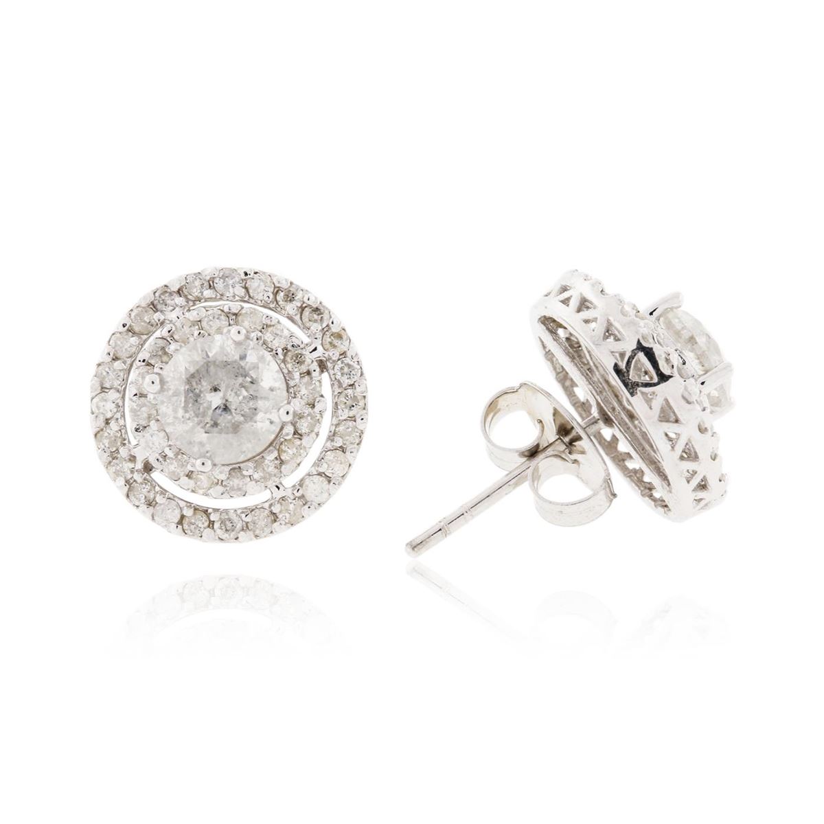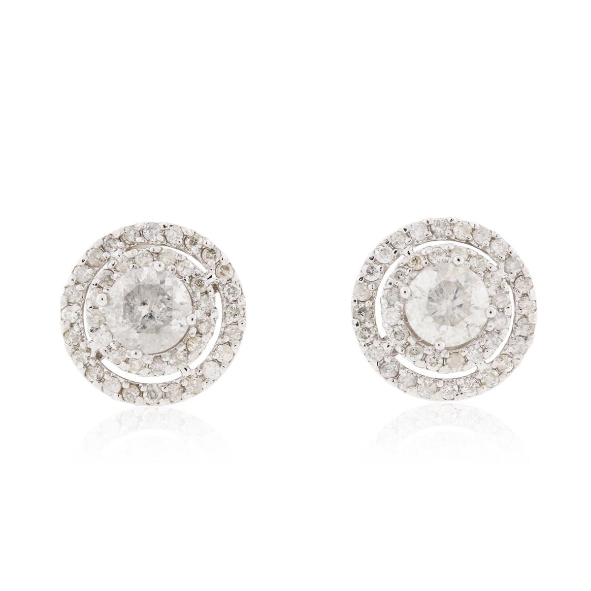 One pair electronically tested 14KT white gold cast & assembled diamond earrings with friction post with nut backs. Condition is new, good workmanship. Each earring features a diamond set within two tiered diamond bezels. Bright polish finish. Identified with markings of "K14". Containing: Two prong set round brilliant cut diamonds, measuring 6.10 - 5.90 x 4.00mm (depth est.) approximate. Total Weight of 2 Stones = 2.02ct. Color & clarity grade are an average for the pair. Graded in the setting. Clarity: I-2. Color: I Eighty prong set round brilliant cut diamonds, measuring 1.50 - 1.30 x 0.84mm (depth est.) approximate. Total Weight of 80 Stones = 0.86ct. Graded in the setting. Clarity: I-1 to I-2. Color: H - J. Total Weight of Diamonds 2.88ct. Total Weight of Earrings 4.11 grams. AIG Appraised at $20,120.00.