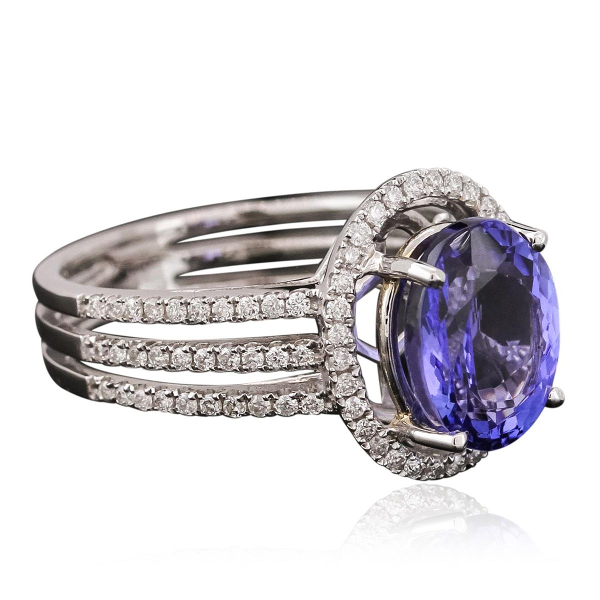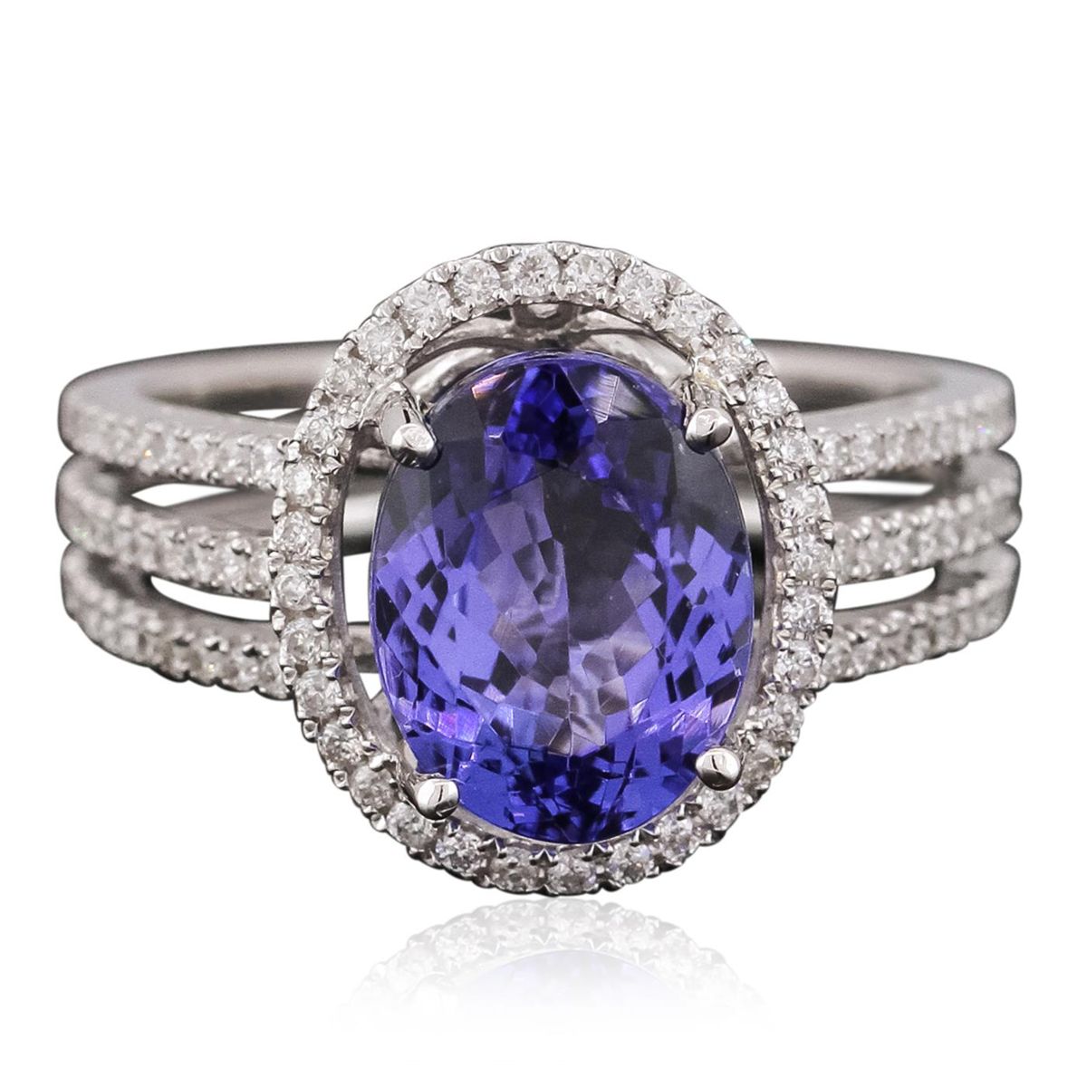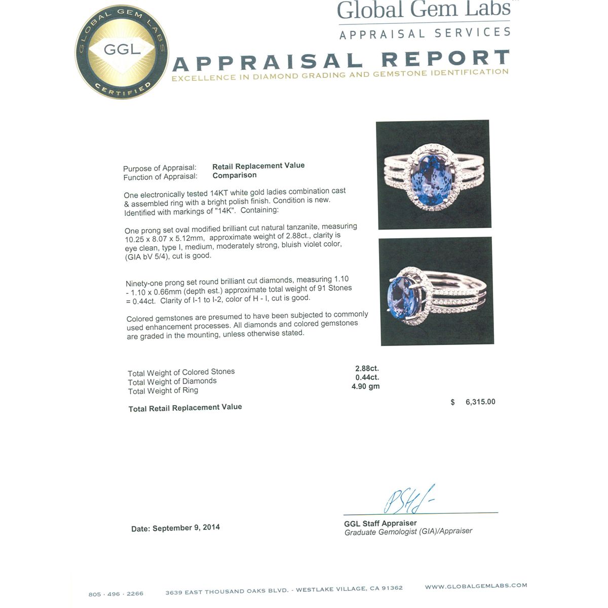 One electronically tested 14KT white gold ladies combination cast & assembled ring with a bright polish finish. Identified with markings of "14K". Condition is new. Containing: One prong set oval modified brilliant cut natural tanzanite, measuring 10.25 x 8.07 x 5.12mm, approximate weight of 2.88ct., clarity is eye clean, type I, medium, moderately strong, bluish violet color, (GIA bV 5/4), cut is good. Ninety-One prong set round brilliant cut diamonds, measuring 1.10 - 1.10 x 0.66mm (depth est.) approximate total weight of 91 Stones = 0.44ct. Clarity: I-1 to I-2. Color: H - I, Cut is Good. Colored gemstones are presumed to have been subjected to commonly used enhancement processes. All diamonds and colored gemstones are graded in the mounting, unless otherwise stated. Total Weight of Colored Stones 2.88ct. Total Weight of Diamonds 0.44ct. Total Weight of Ring 4.90 grams. GGL Appraised at $6,315.00.